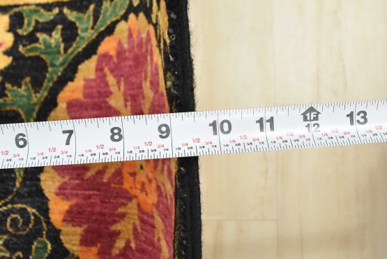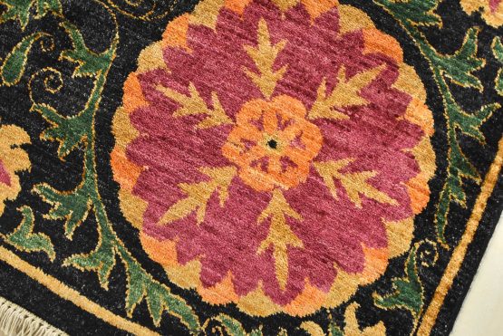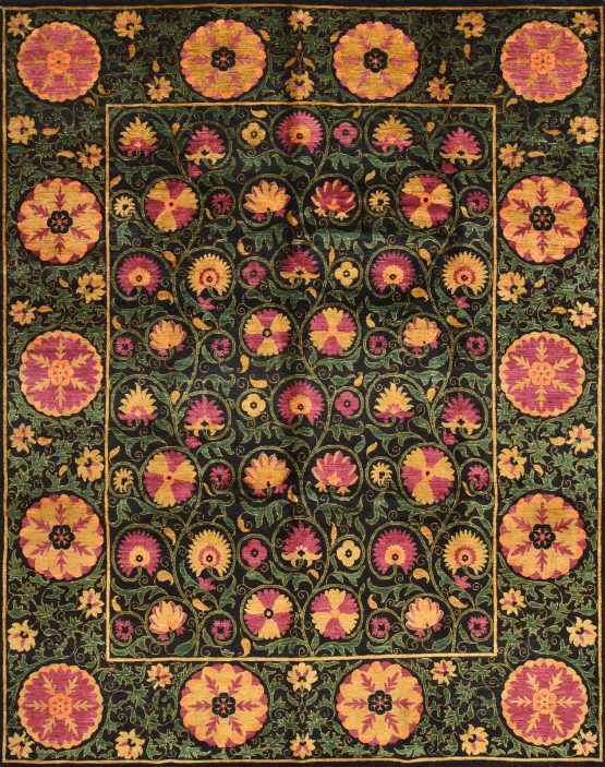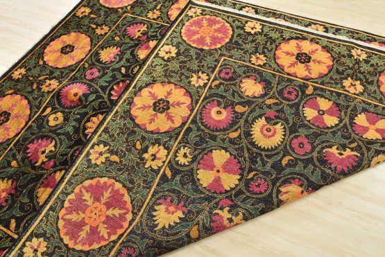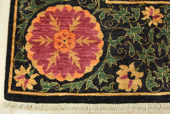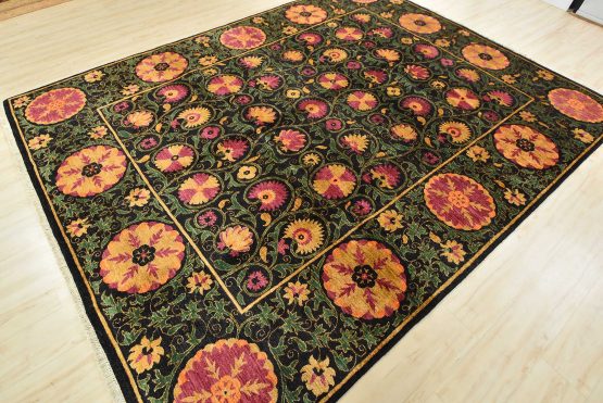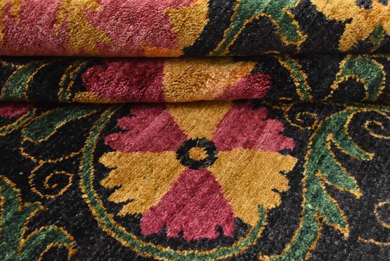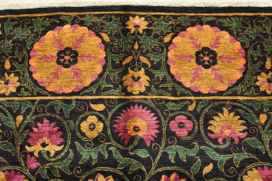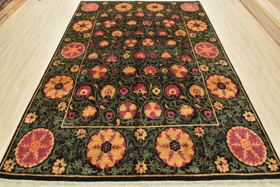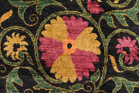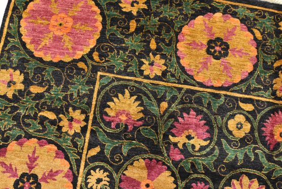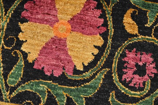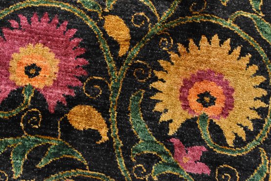 A traditional Suzani rug hand-knotted with an all-wool pile on a cotton foundation. This finely woven oriental rug features an all-over botanical design adorned with flowers set against a black background. It is new and in excellent condition.