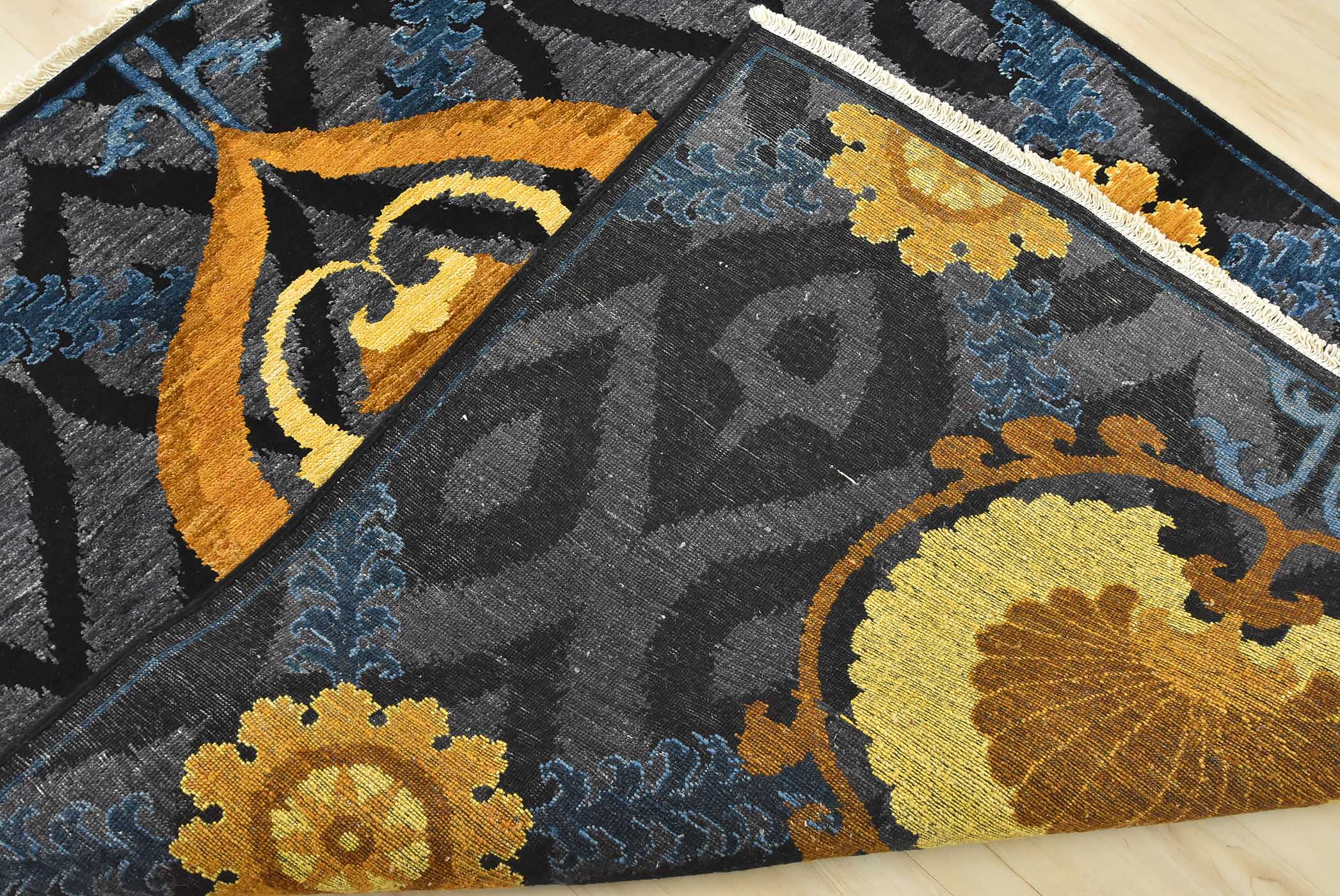 A modern traditional Suzani rug hand-knotted with an all-wool pile on a cotton foundation. This oriental rug features botanical motifs set against an ogee pattern. It is new and in excellent condition.