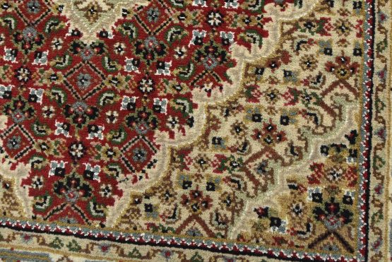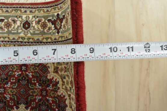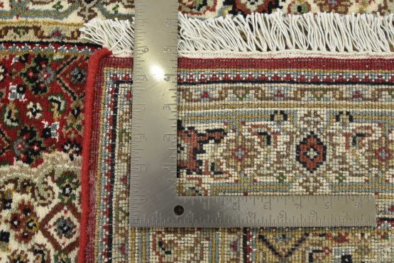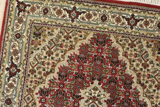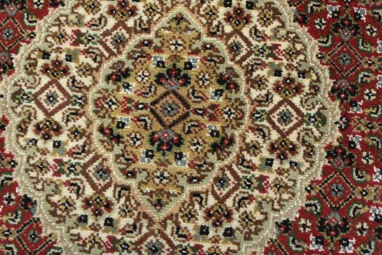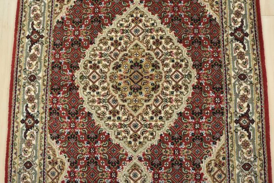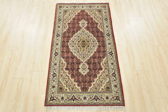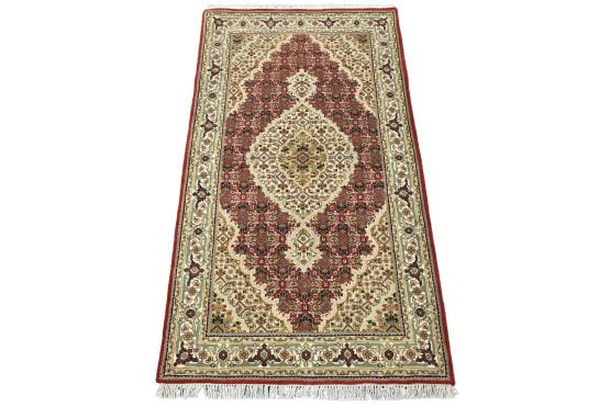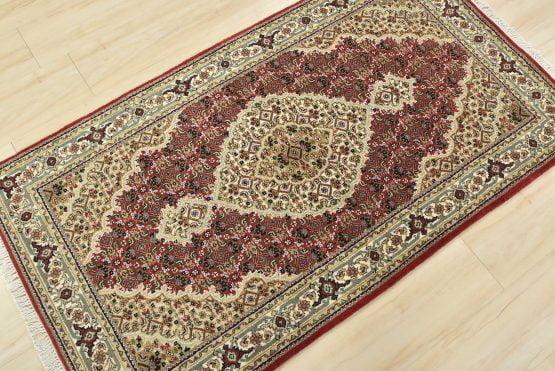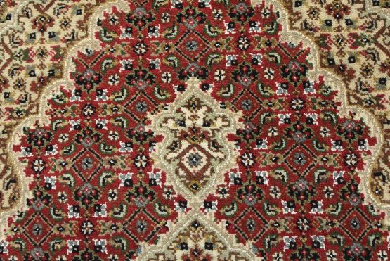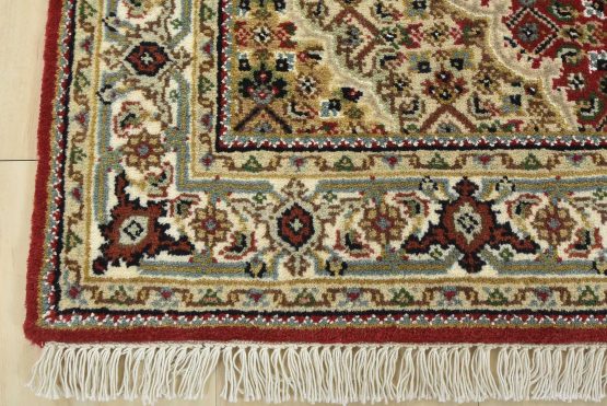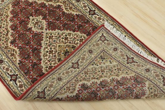 A traditional Tabriz Mahi rug hand-knotted with an all-wool pile on a cotton foundation. This finely woven oriental rug features a central medallion surrounded by a small-scale Herati pattern set against a red background. It is new and in excellent condition.