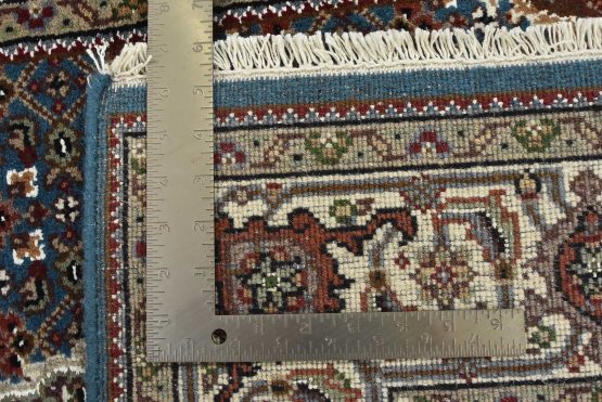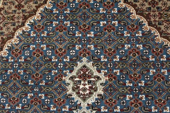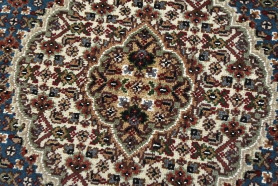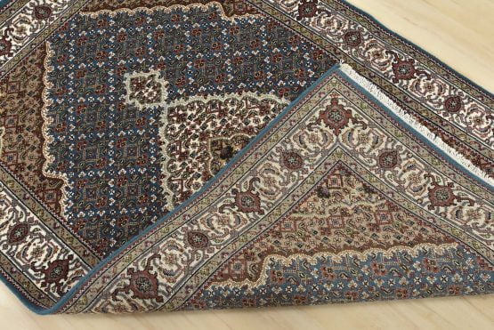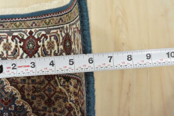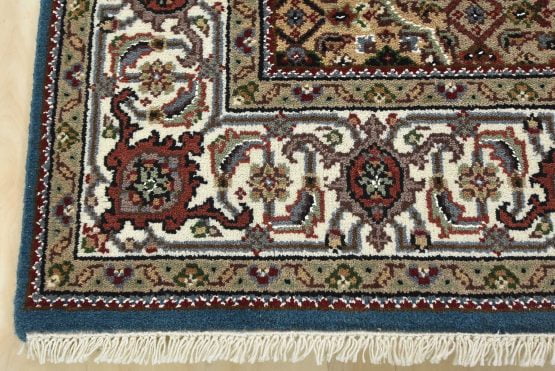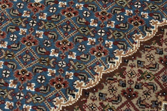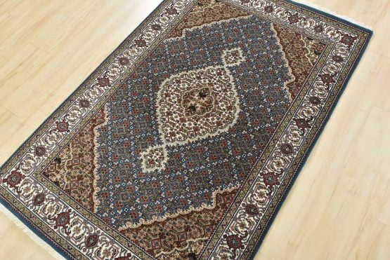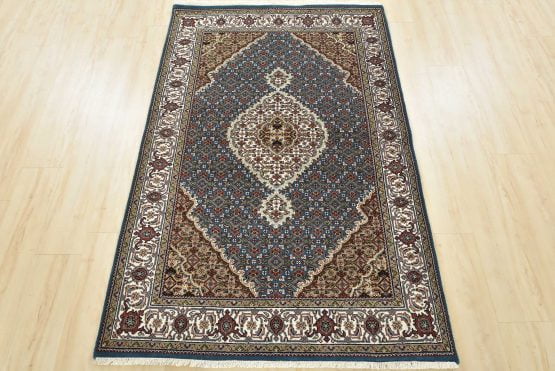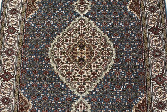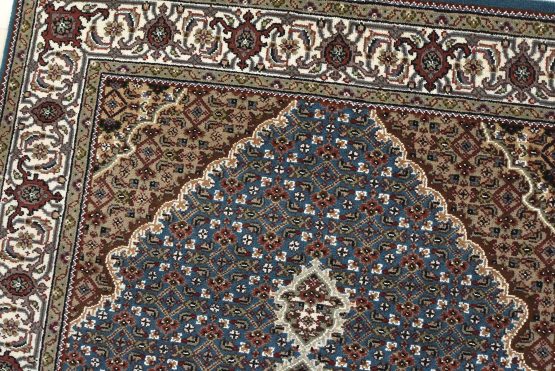 A traditional Tabriz Mahi rug hand-knotted with an all-wool pile on a cotton foundation. This finely woven oriental rug features a central medallion surrounded by a small-scale Herati pattern set against a blue background. It is new and in excellent condition.
