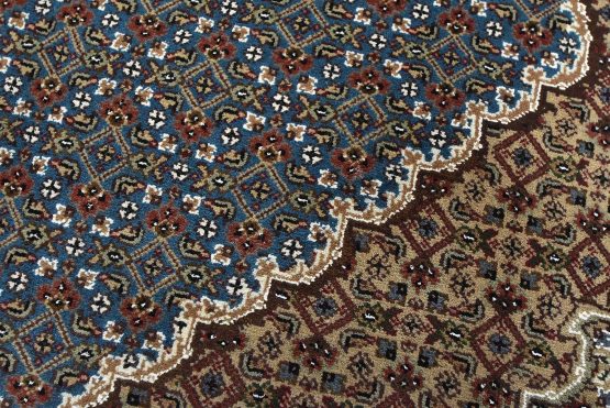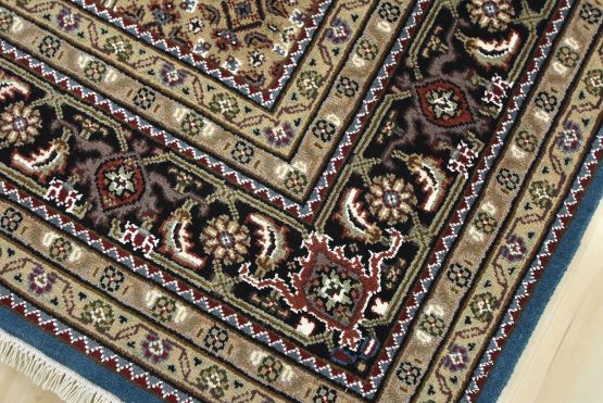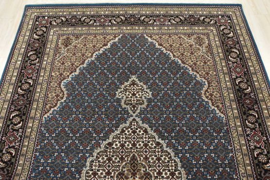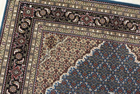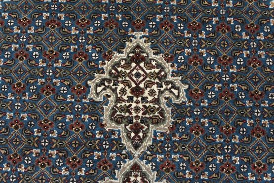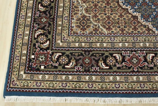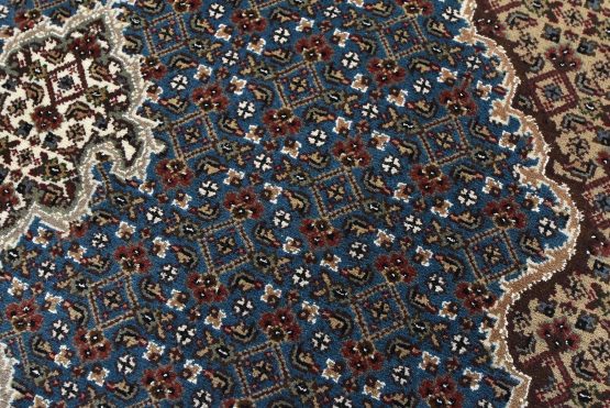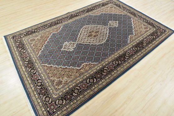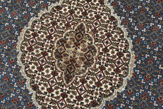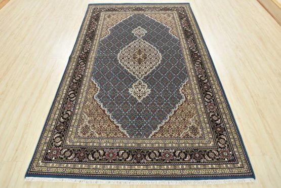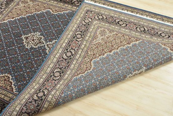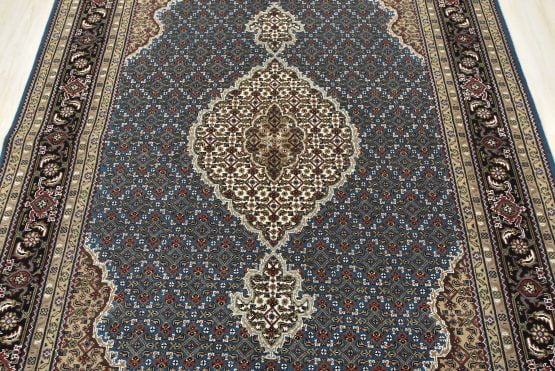 A traditional Tabriz Mahi rug hand-knotted with an all-wool pile on a cotton foundation. This finely woven oriental rug features a central medallion surrounded by an intricate Herati pattern set against a blue background. It is new and in excellent condition.