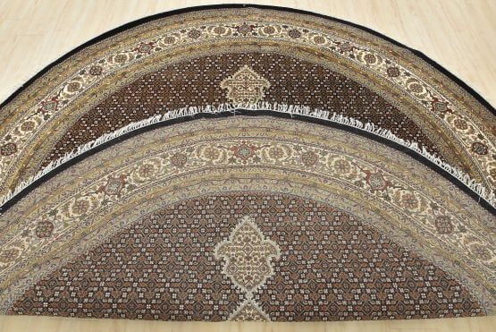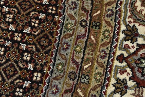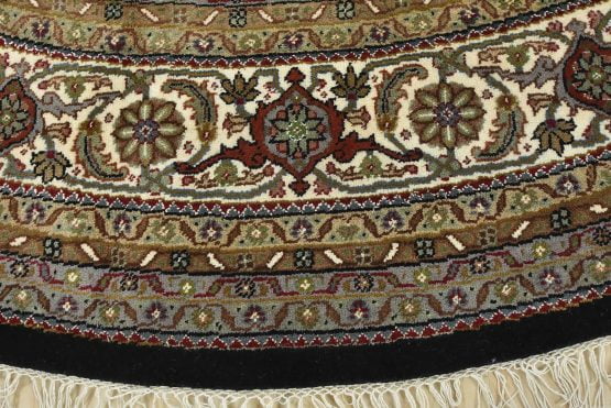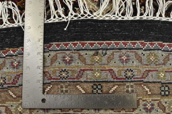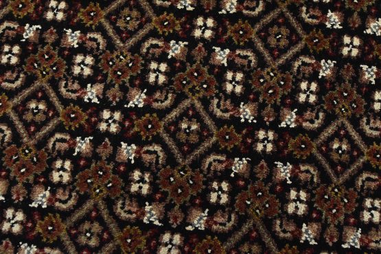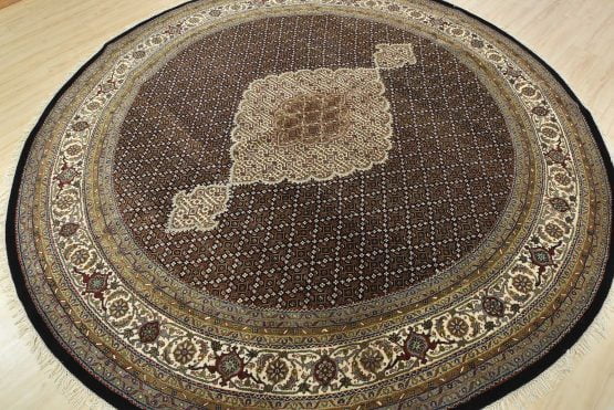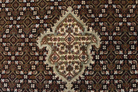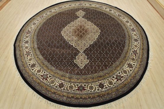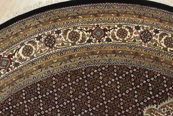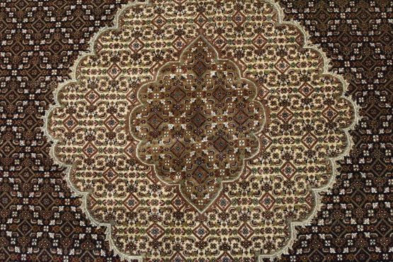 A traditional Tabriz Mahi rug hand-knotted with an all-wool pile on a cotton foundation. This finely woven oriental rug features a central medallion surrounded by a small-scale Herati pattern set against a black background. It is new and in excellent condition.