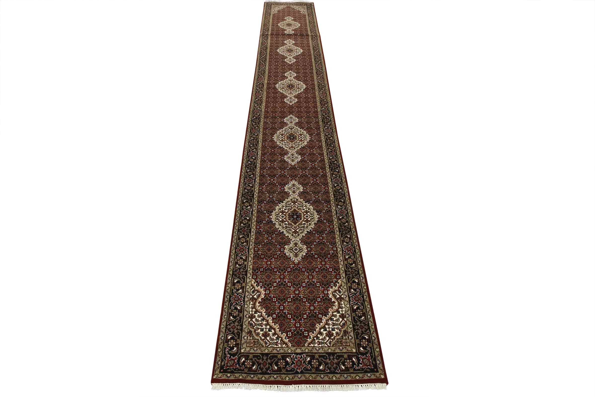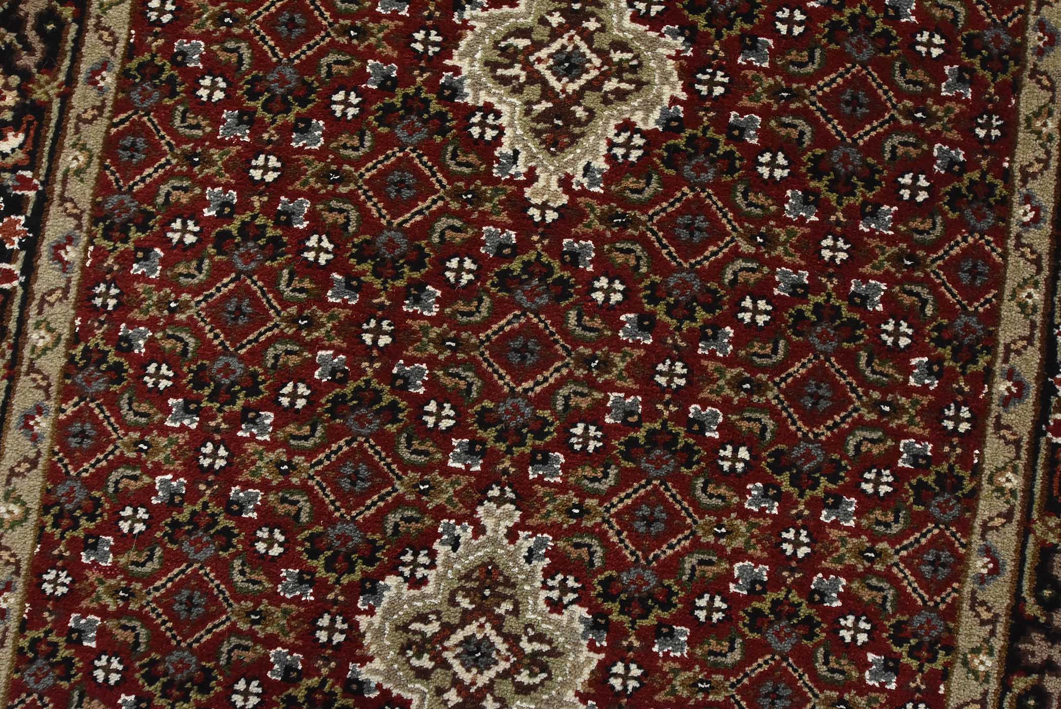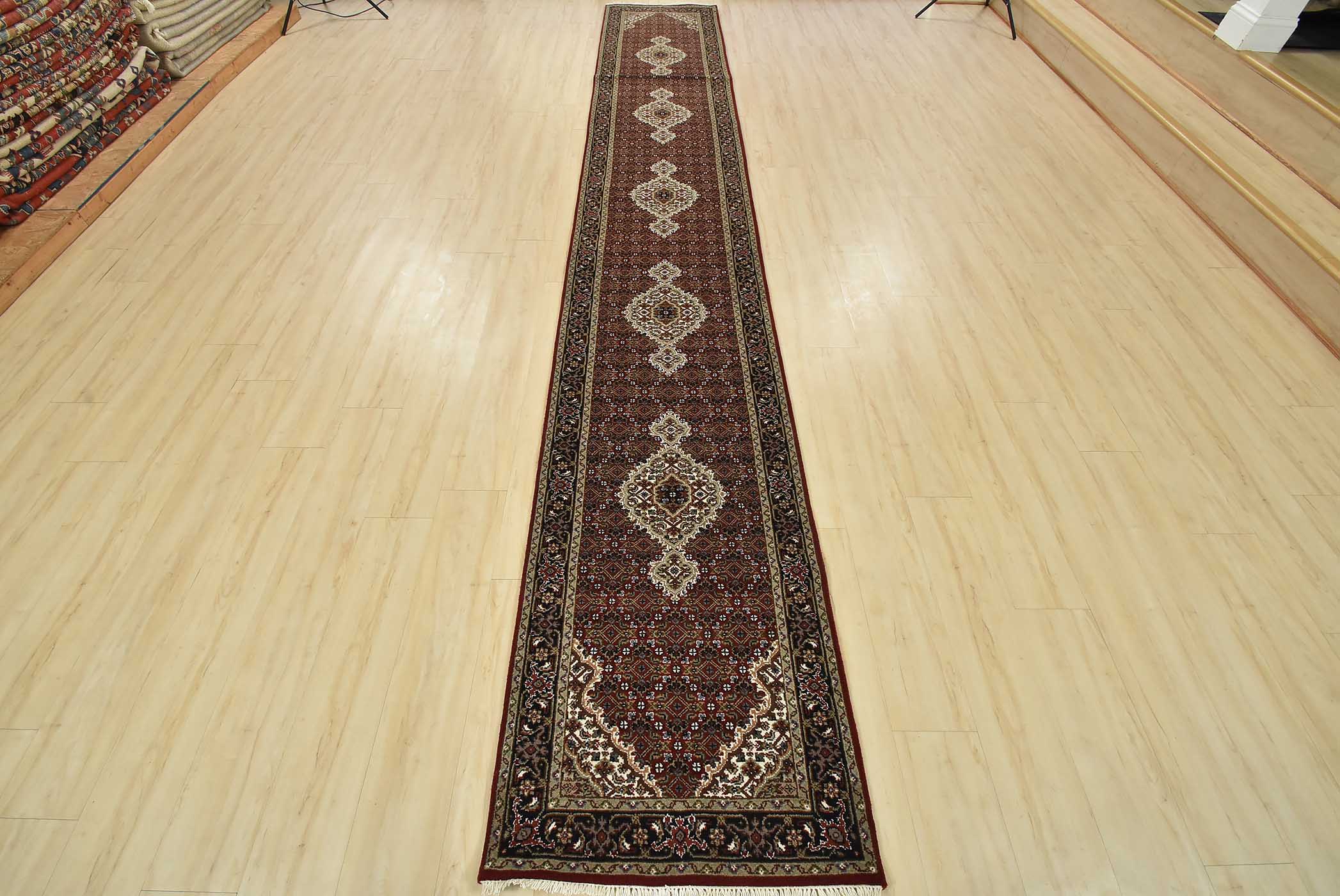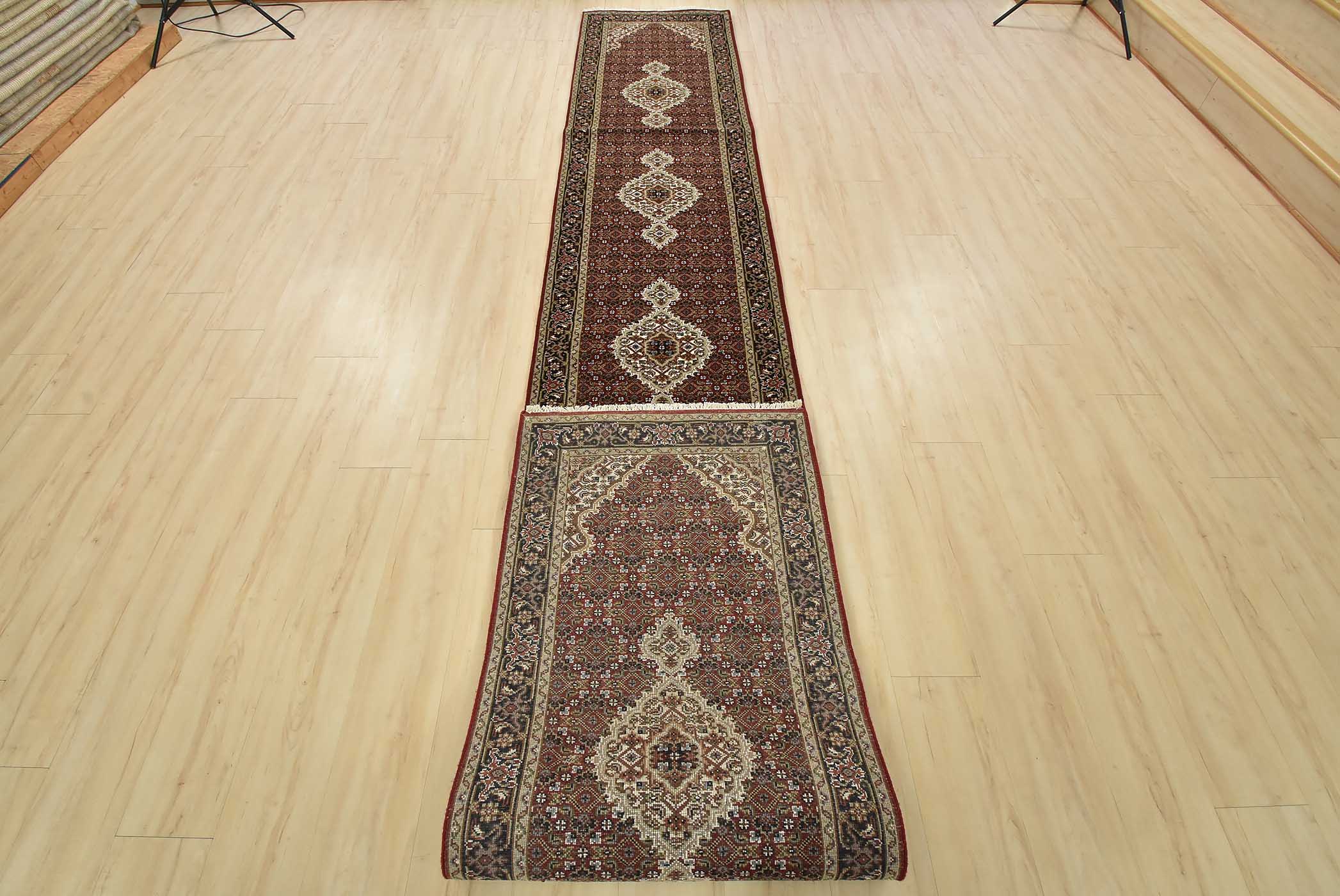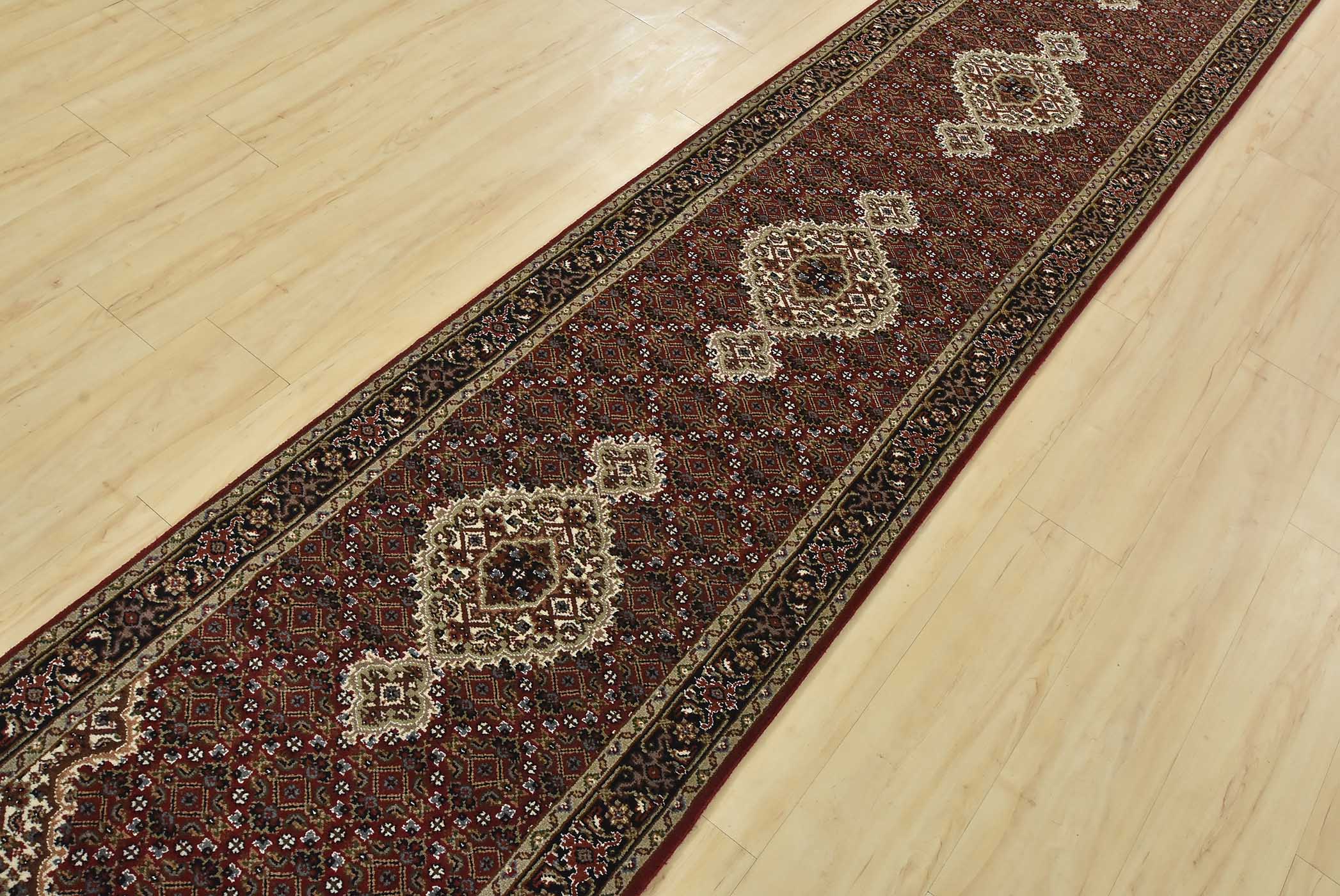 A traditional Tabriz Mahi runner hand-knotted with fine wool on a cotton foundation. This oriental rug features a row of medallions surrounded by an intricate Herati design set against an ivory background. It is new and in excellent condition