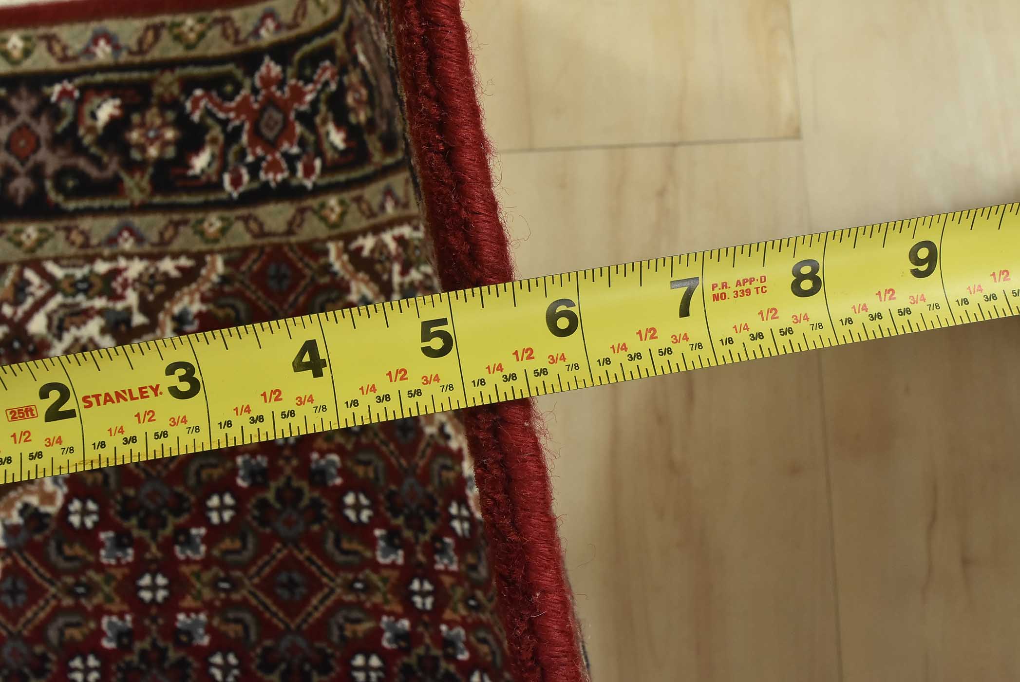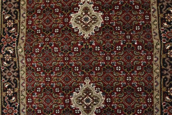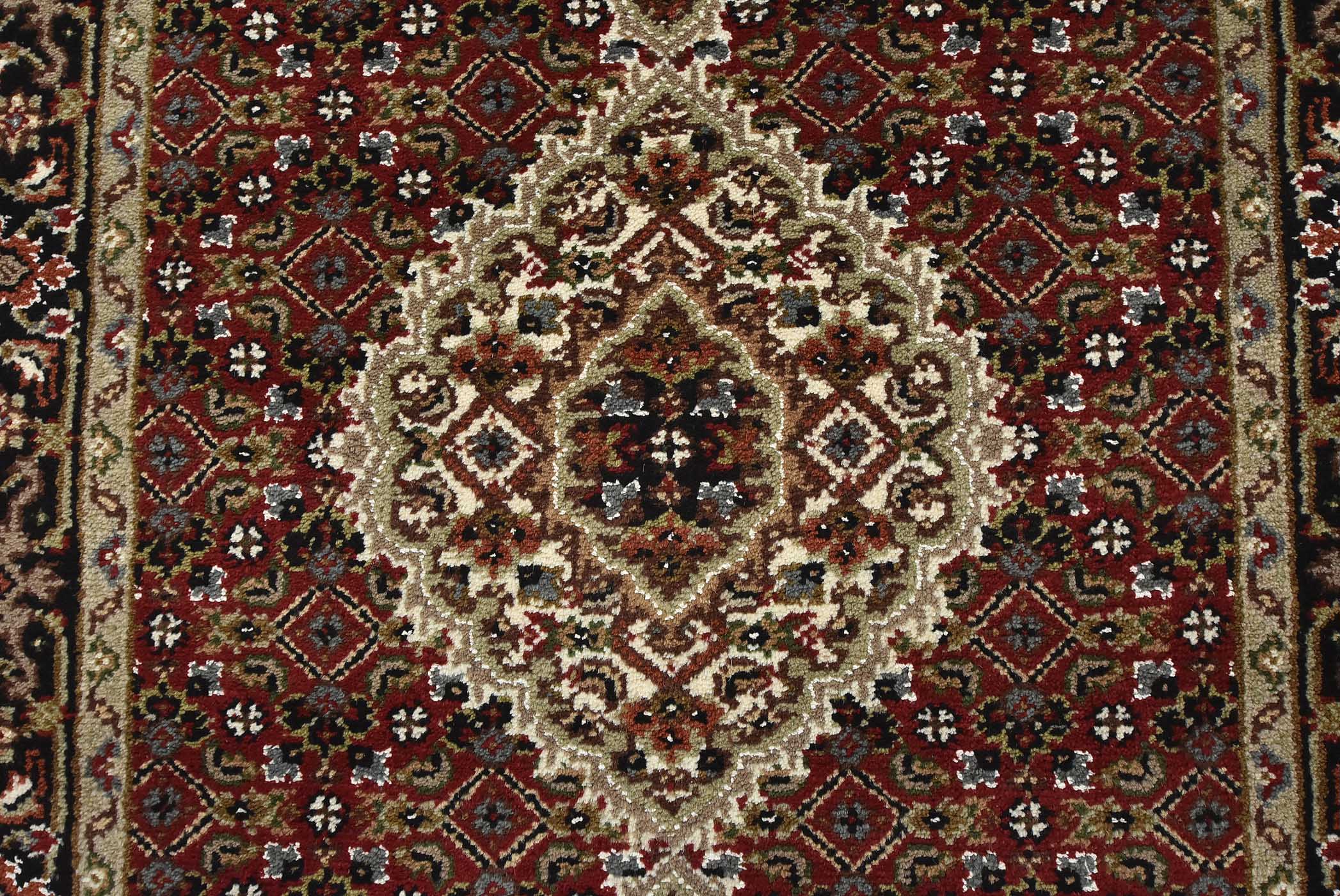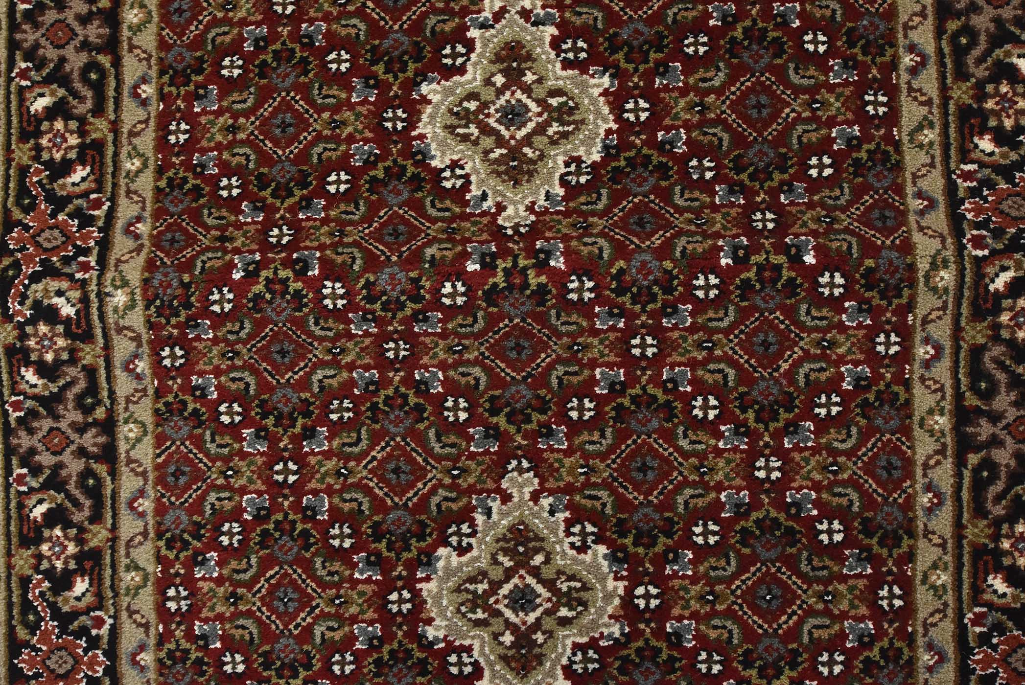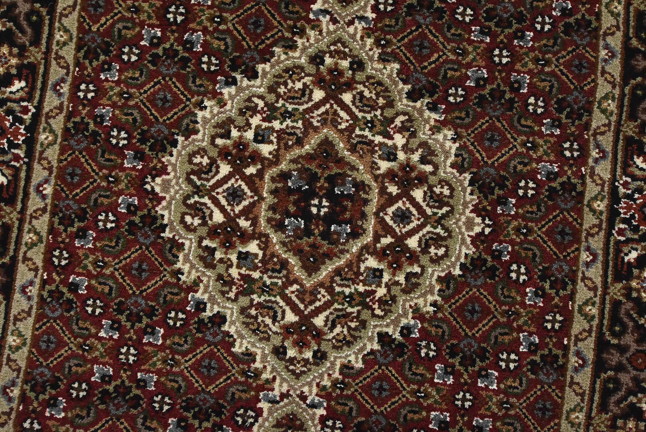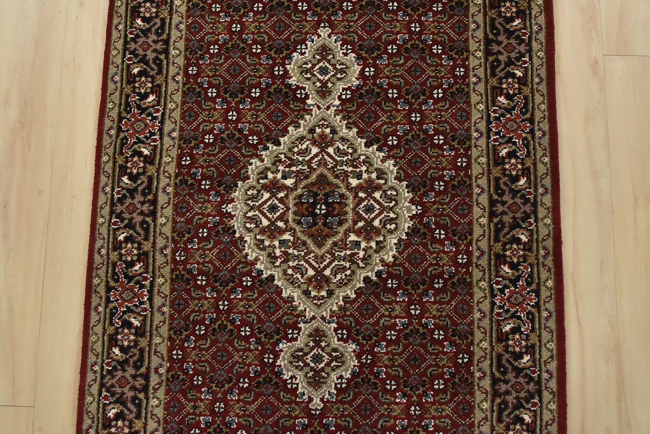 A traditional Tabriz Mahi runner hand-knotted with fine wool on a cotton foundation. This oriental rug features a row of medallions surrounded by an intricate Herati design set against an ivory background. It is new and in excellent condition