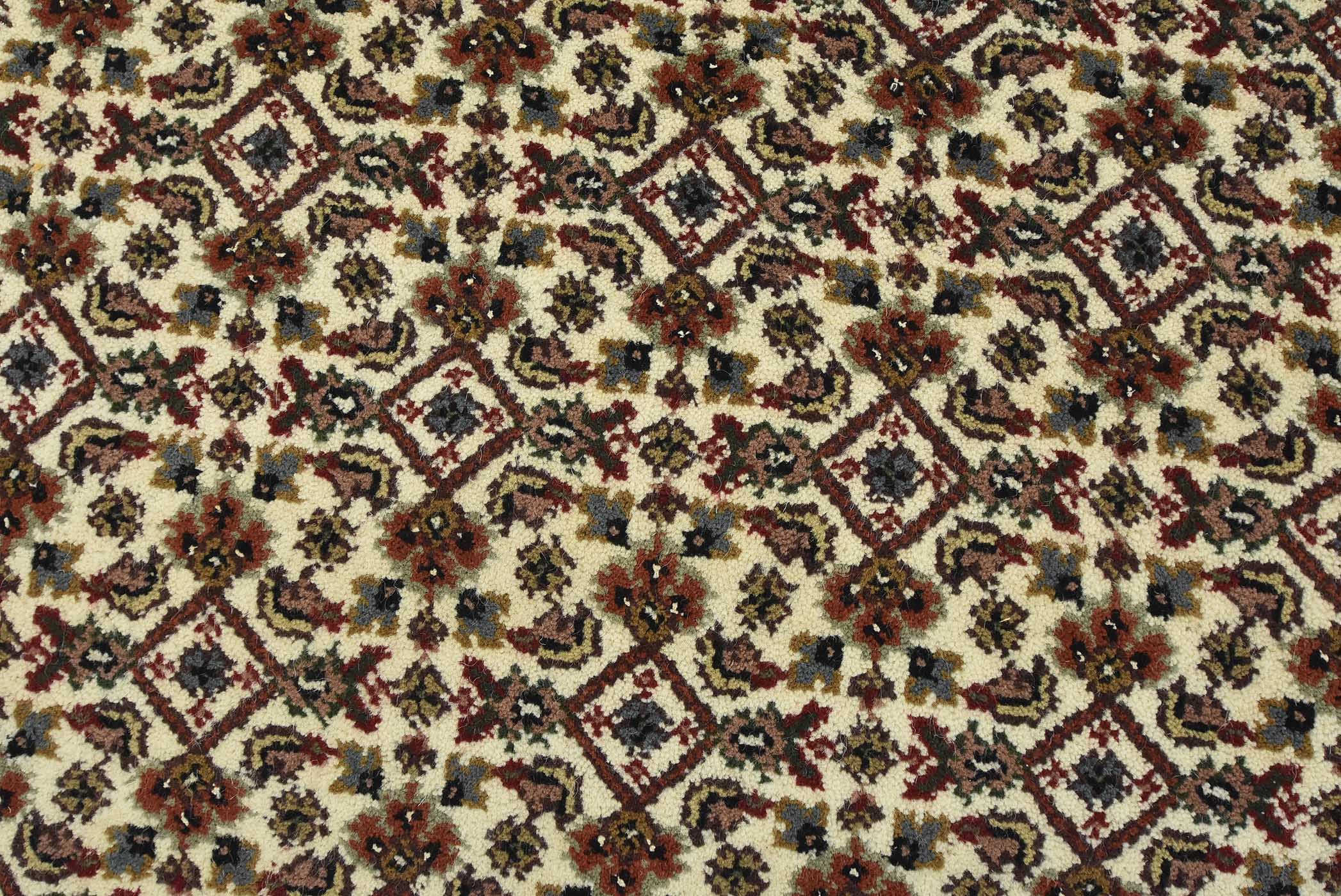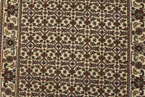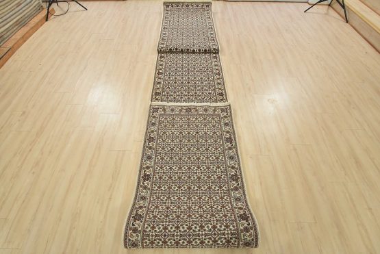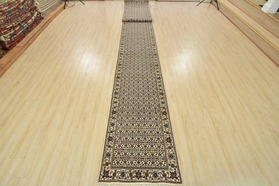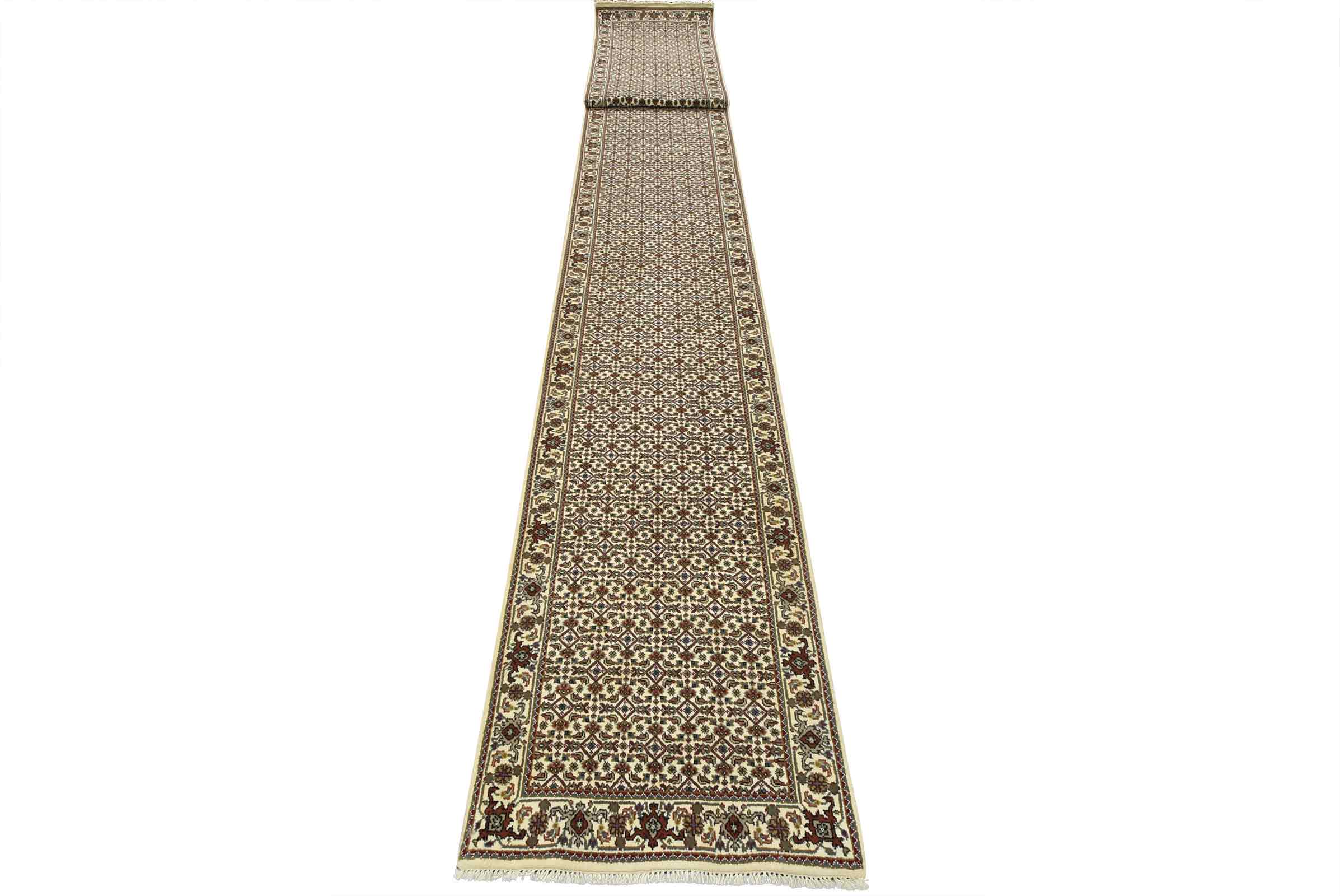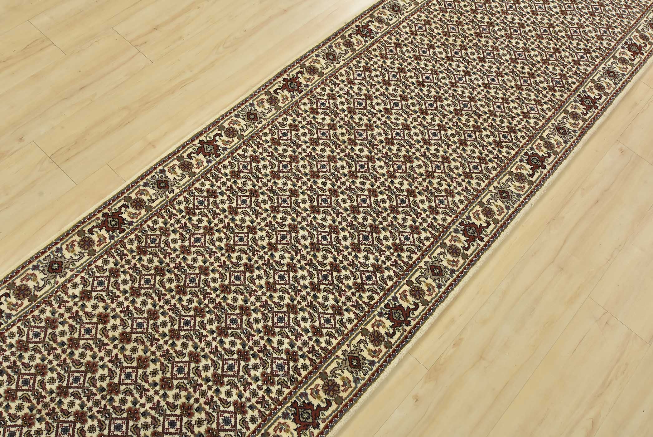 A traditional Tabriz Mahi runner hand-knotted with fine wool on a cotton foundation. This intricately woven oriental rug features a Herati pattern set against an ivory background. It is new and in excellent condition.