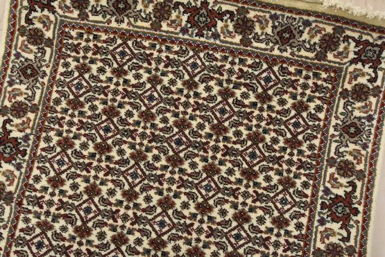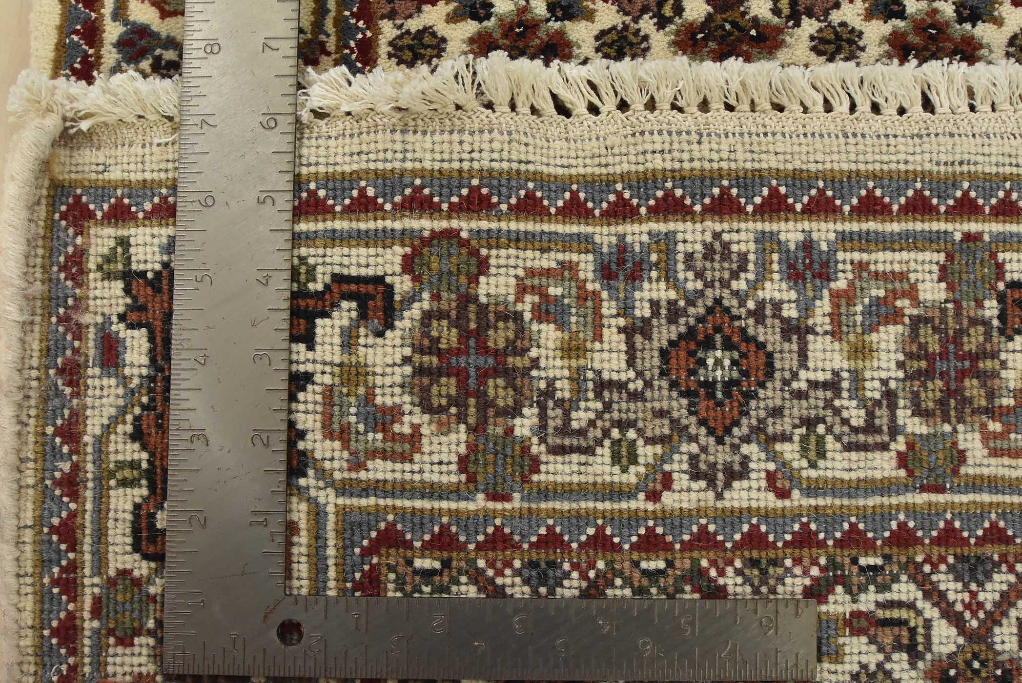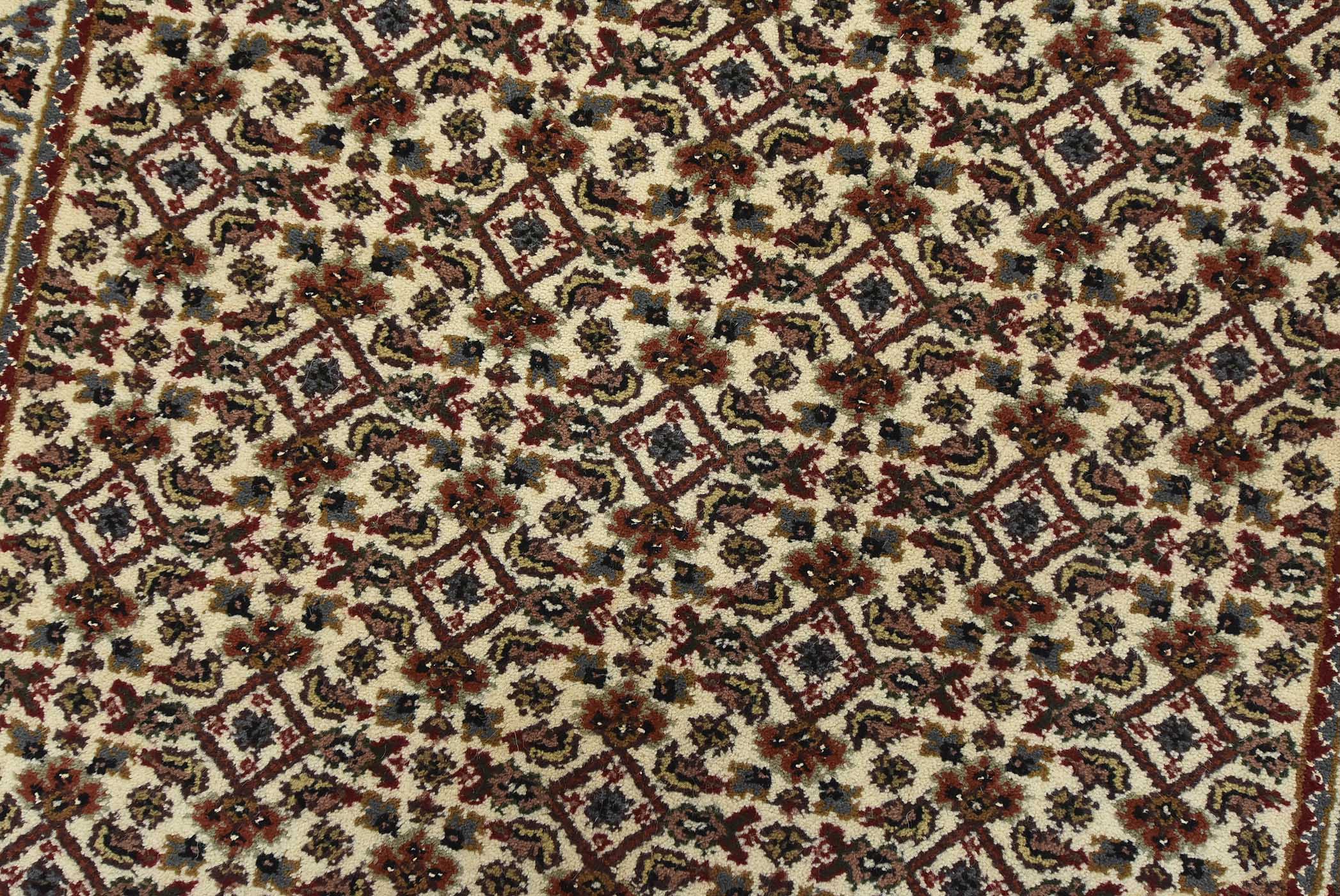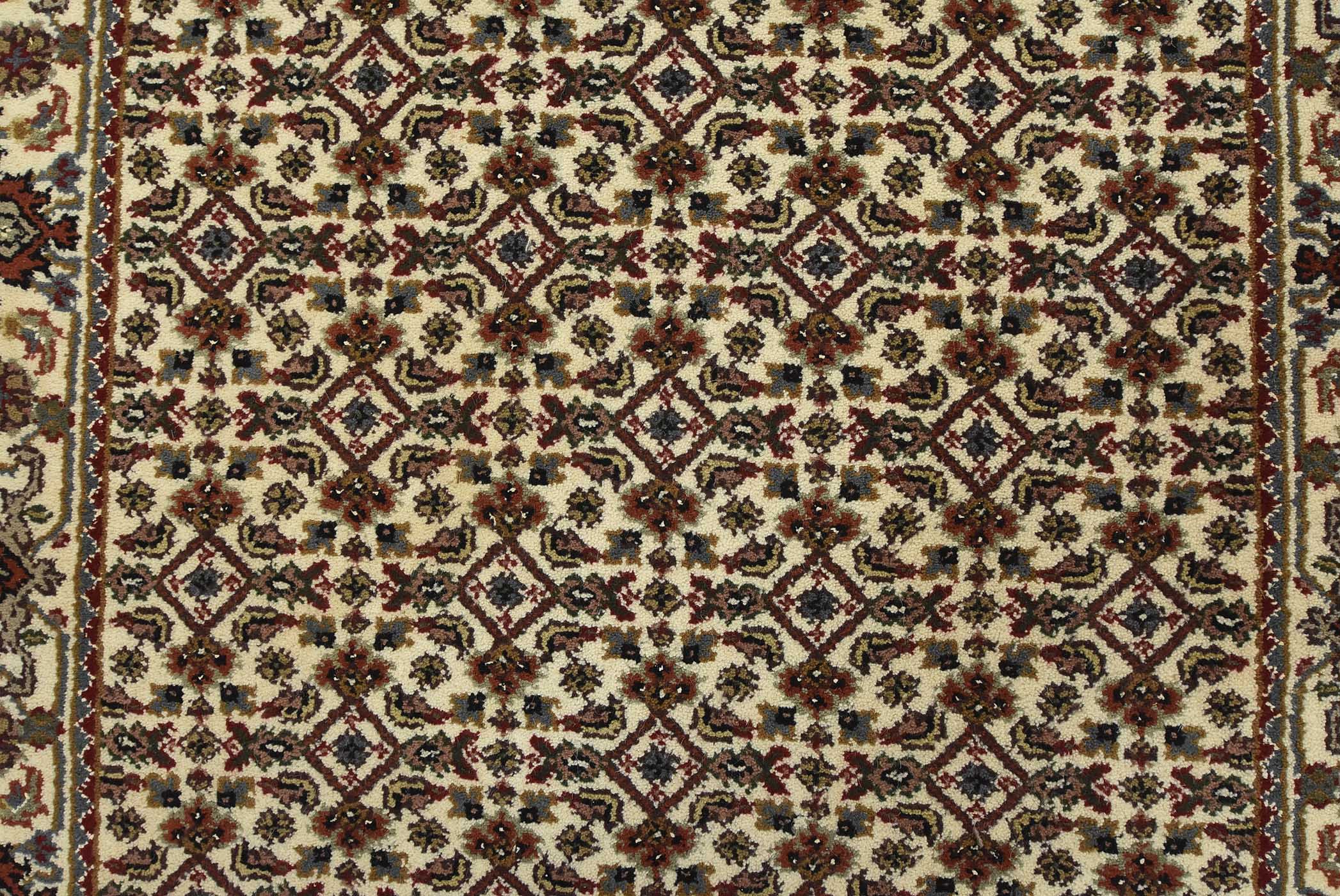 A traditional Tabriz Mahi runner hand-knotted with fine wool on a cotton foundation. This intricately woven oriental rug features a Herati pattern set against an ivory background. It is new and in excellent condition.