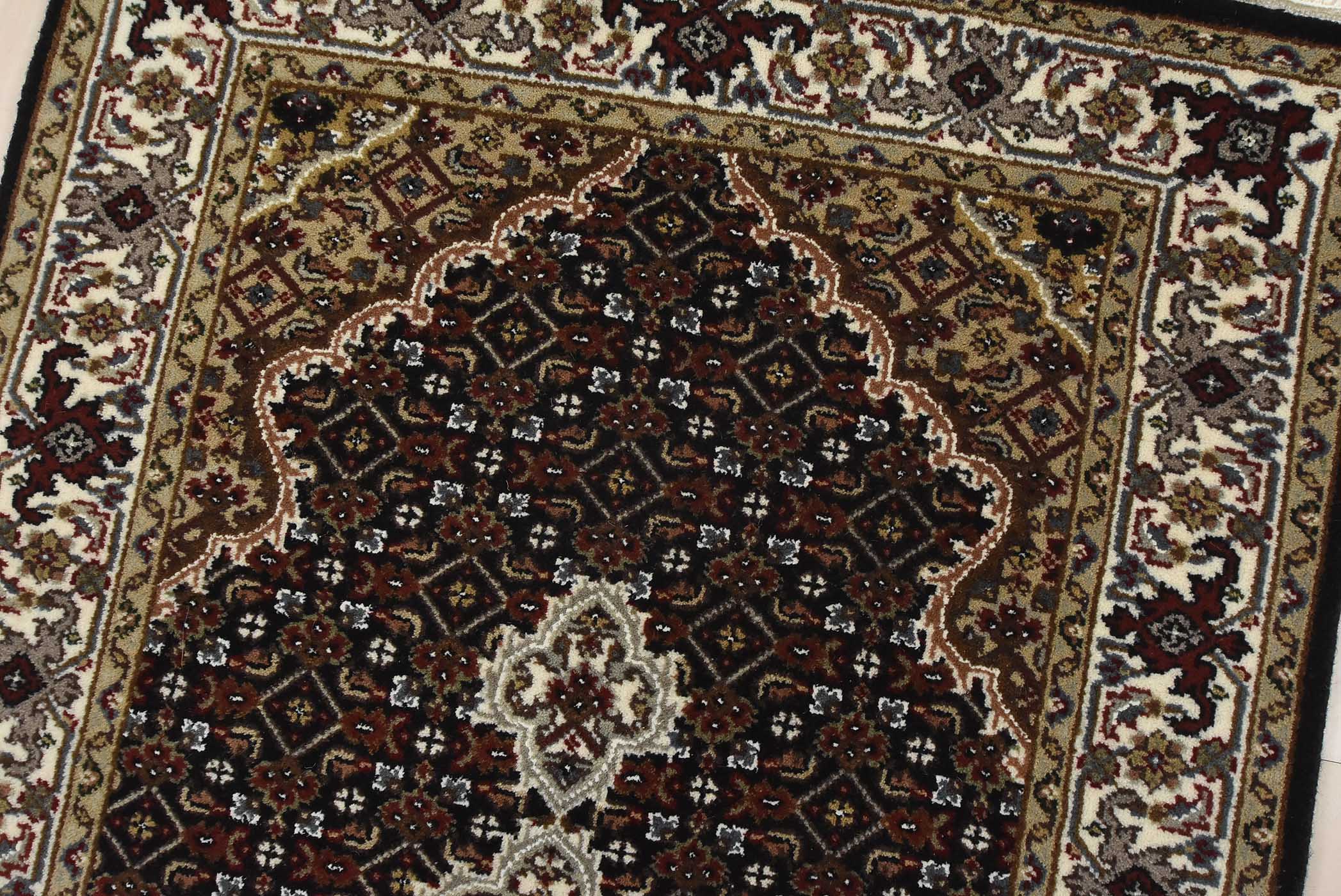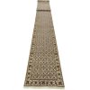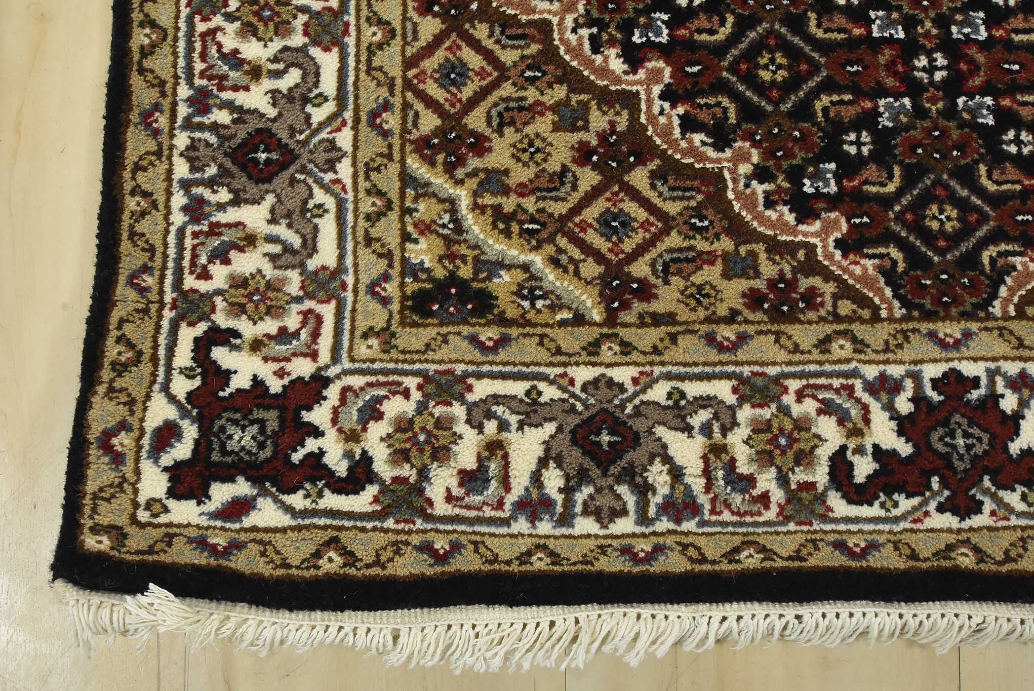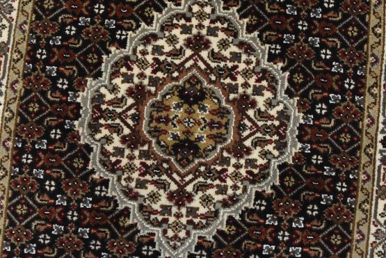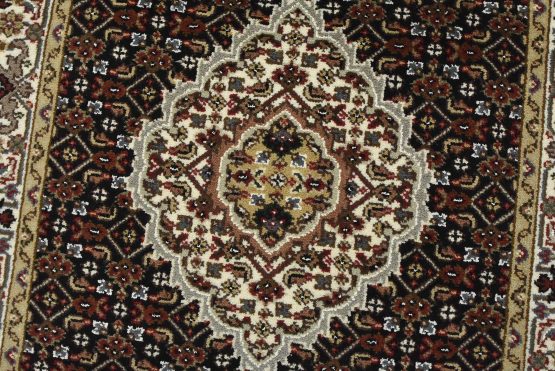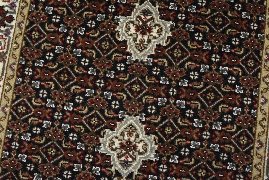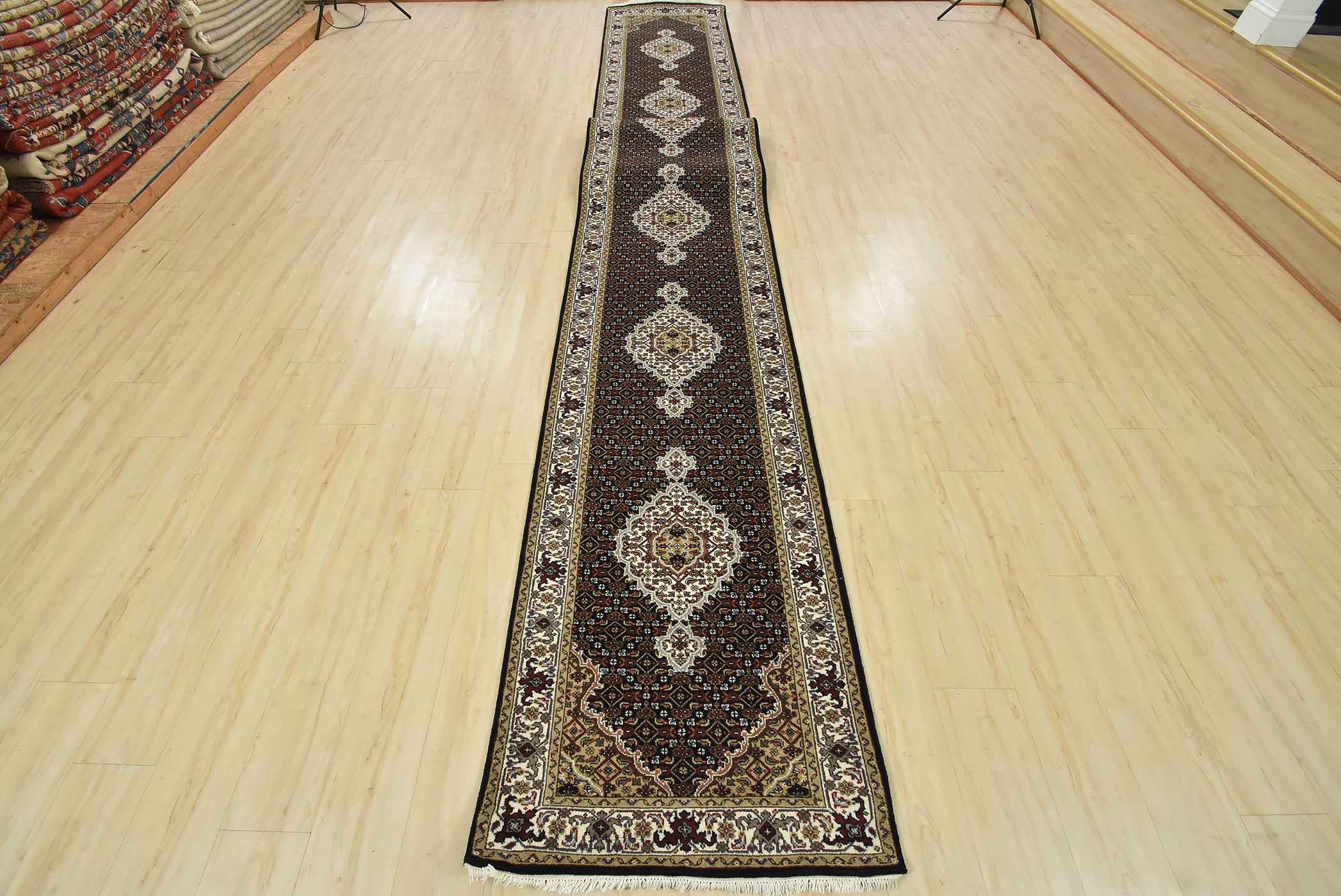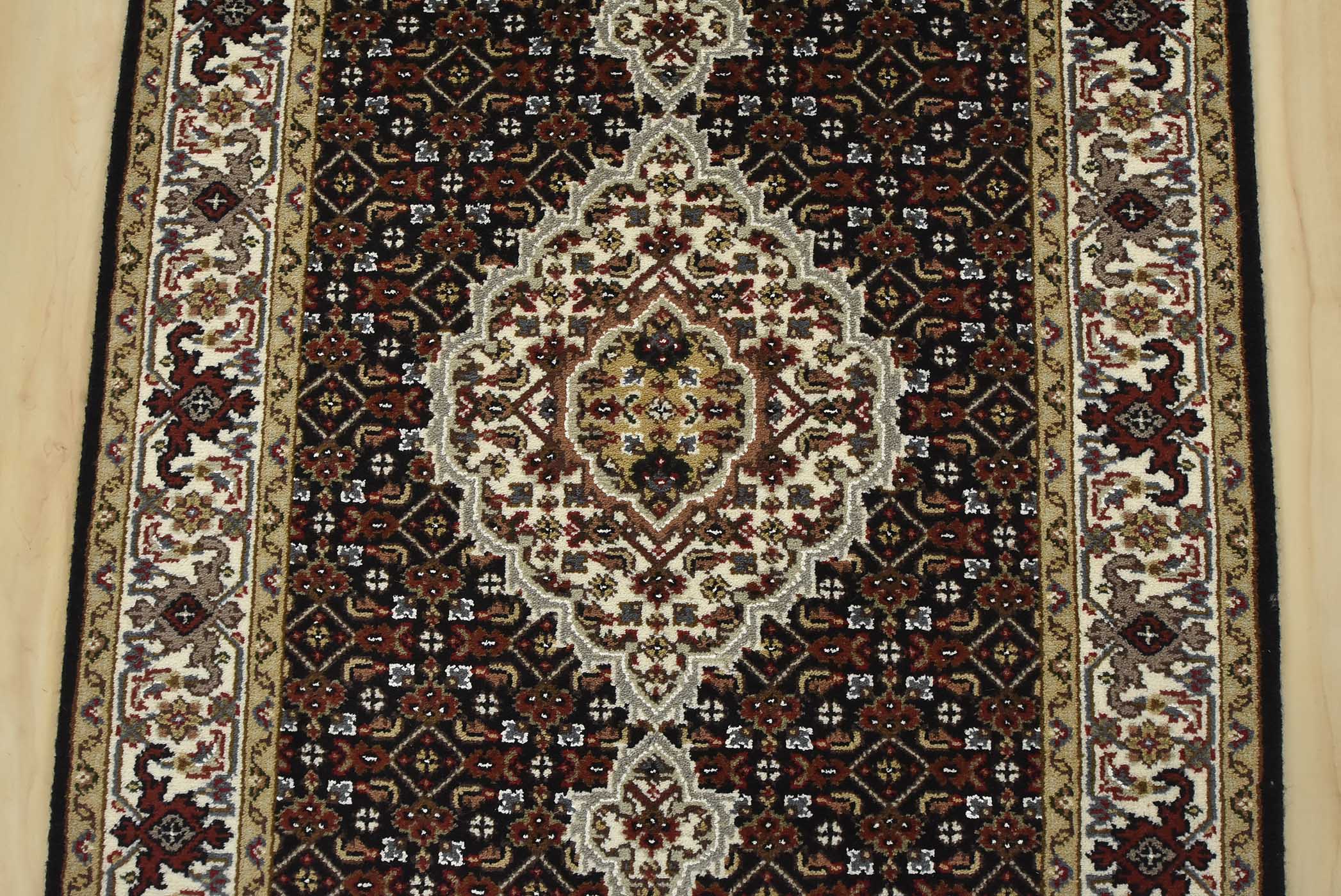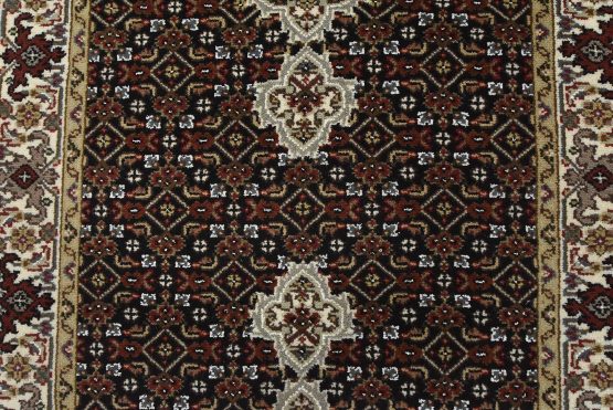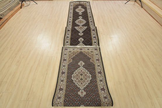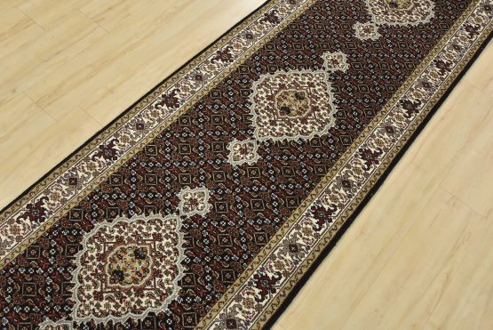 A traditional Tabriz Mahi runner hand-knotted with fine wool on a cotton foundation. This intricately woven oriental rug features a row of medallions surrounded by a Herati pattern set against a black background. It is new and in excellent condition.