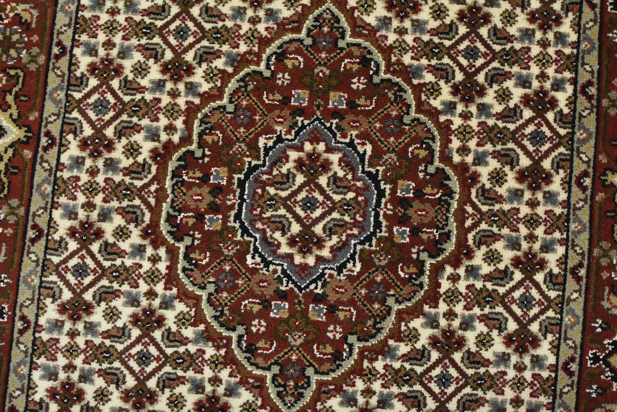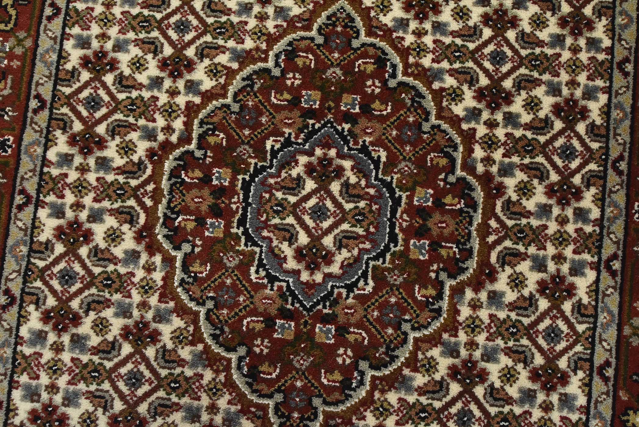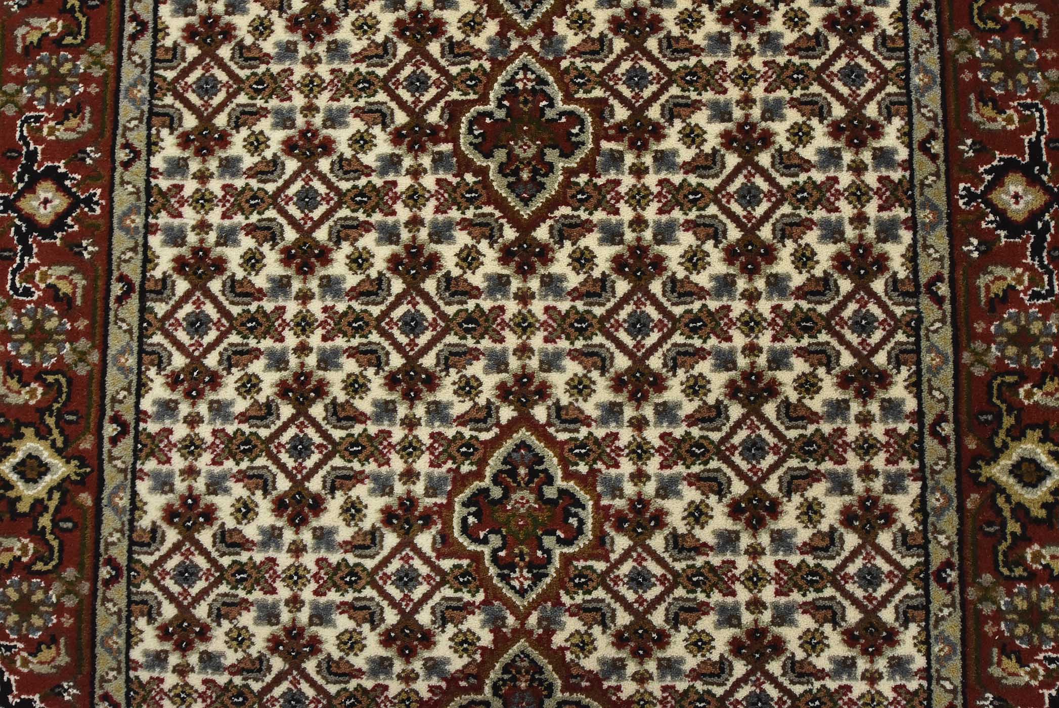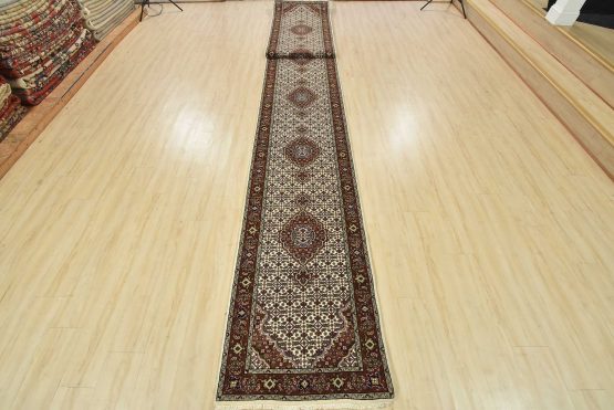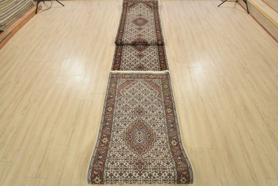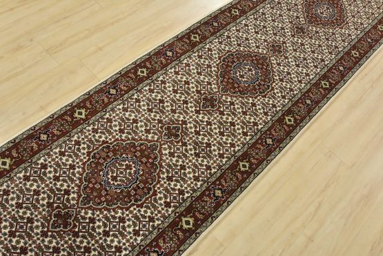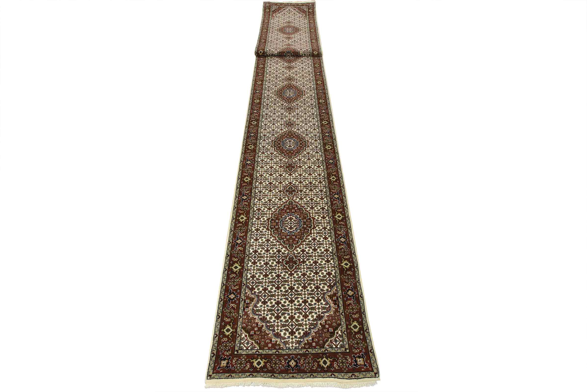 A traditional Tabriz Mahi runner hand-knotted with fine wool on a cotton foundation. This intricately woven oriental rug features a row of medallions surrounded by a Herati pattern set against an ivory background. It is new and in excellent condition.