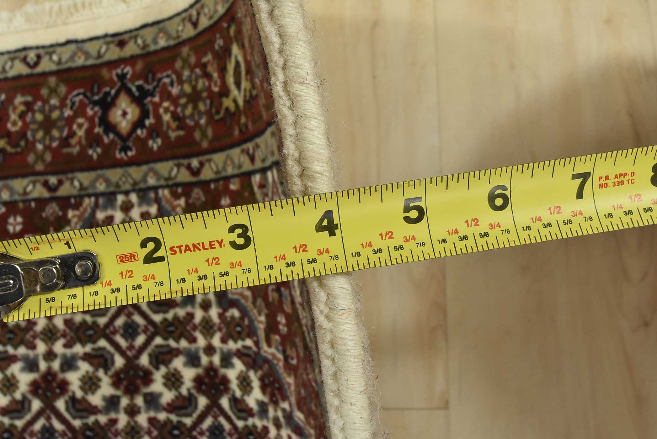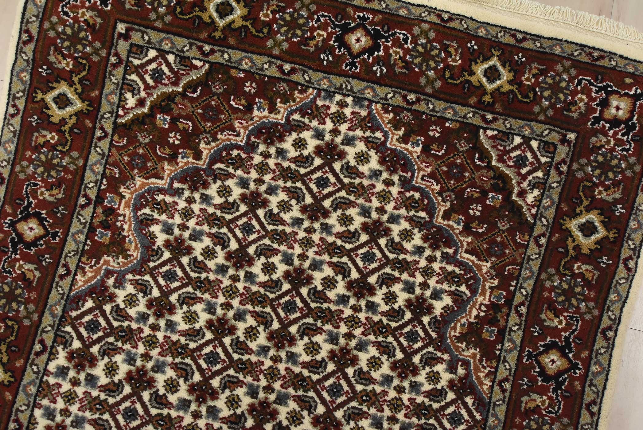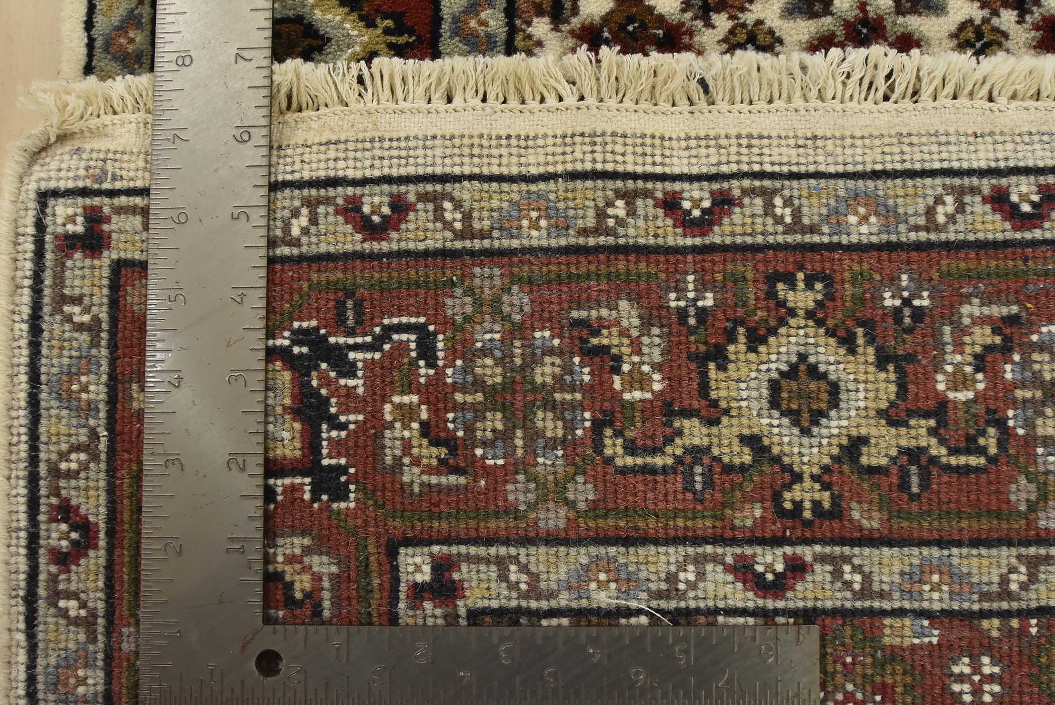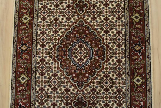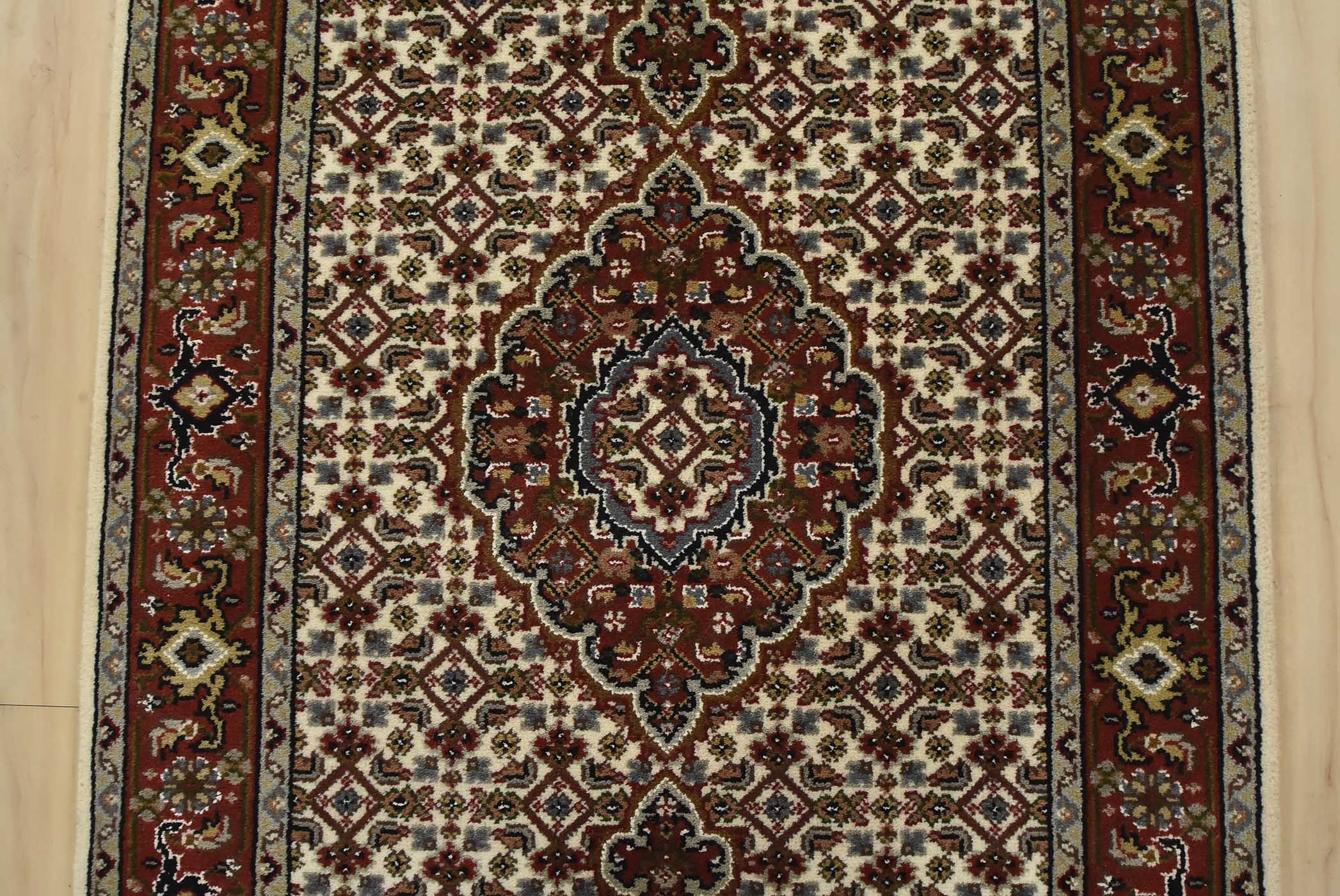 A traditional Tabriz Mahi runner hand-knotted with fine wool on a cotton foundation. This intricately woven oriental rug features a row of medallions surrounded by a Herati pattern set against an ivory background. It is new and in excellent condition.