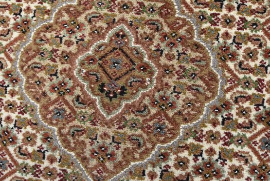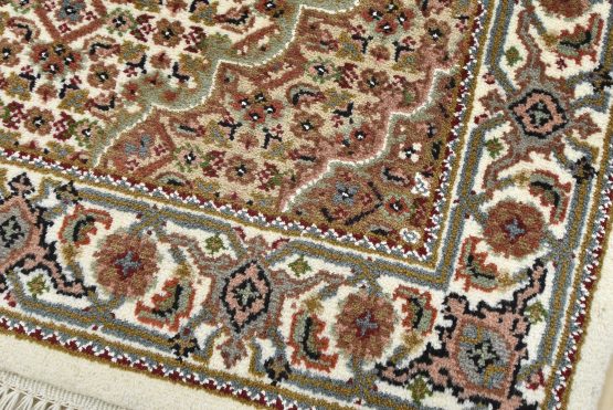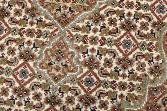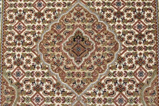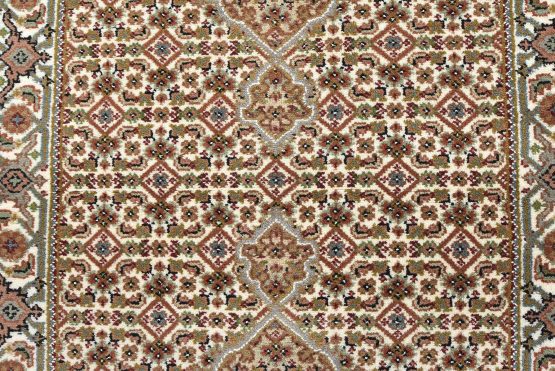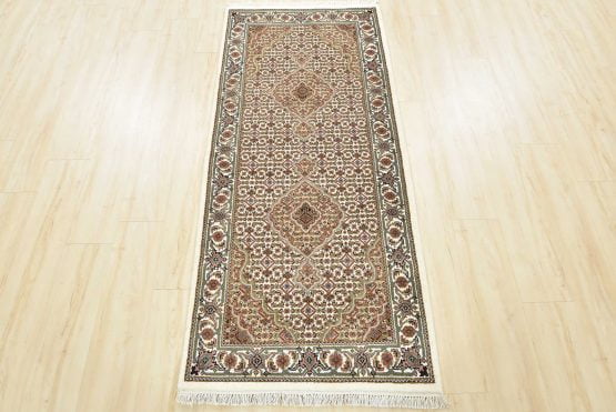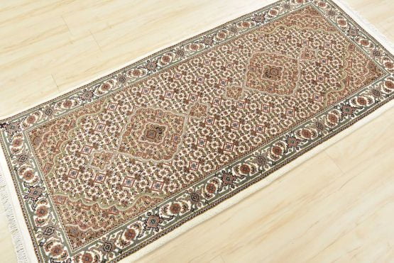 A traditional Tabriz Mahi runner hand-knotted with an all-wool pile on a cotton foundation. This finely woven oriental rug features medallions surrounded by a small-scale Herati pattern set against an ivory background. It is new and in excellent condition.