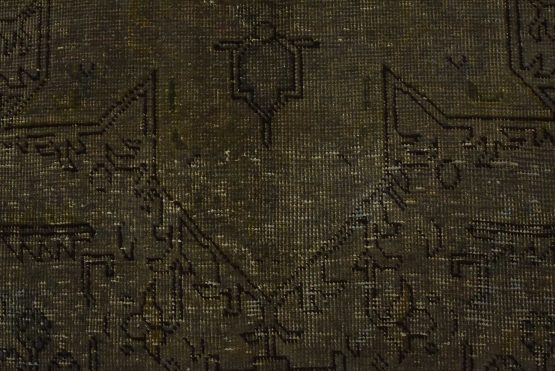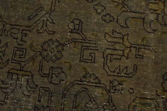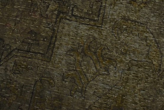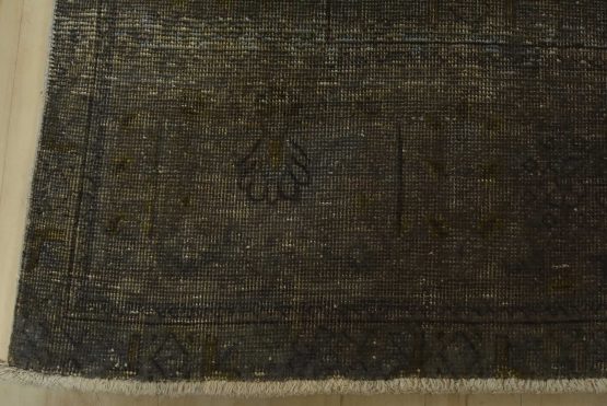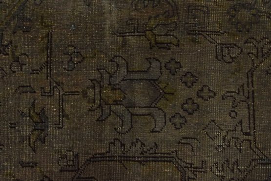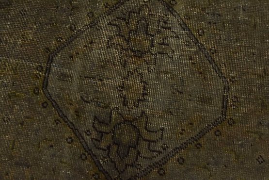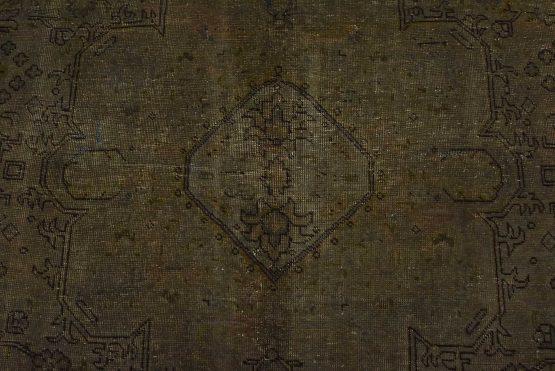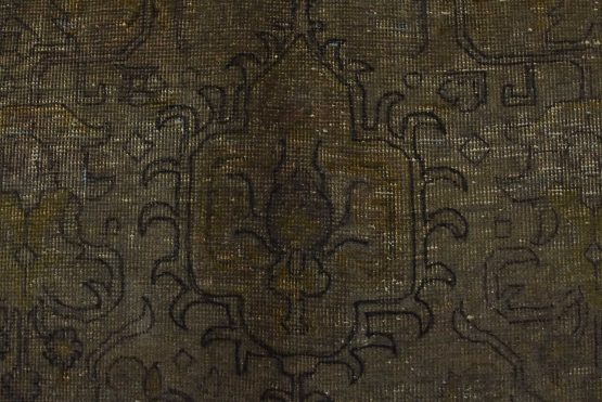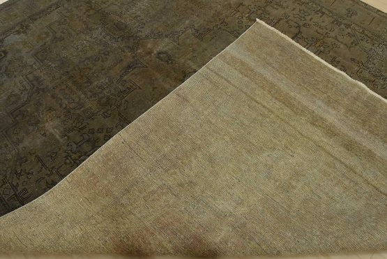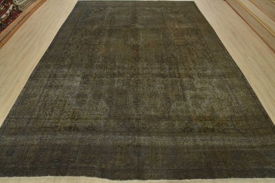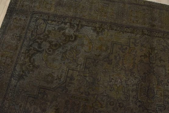 An authentic vintage traditional Overdyed Tabriz rug hand-knotted with an all-wool pile on a cotton foundation. This oriental rug features a muted central medallion surrounded by a muted botanical design set against a gray background. It has a low wool pile, is worn and distressed, and has minor imperfections (see photos). However, it is in very good condition.