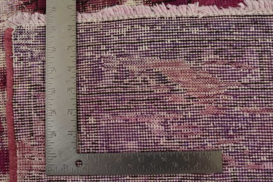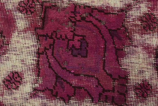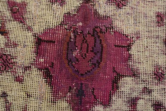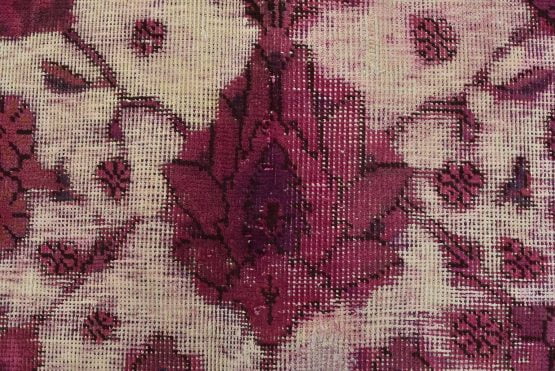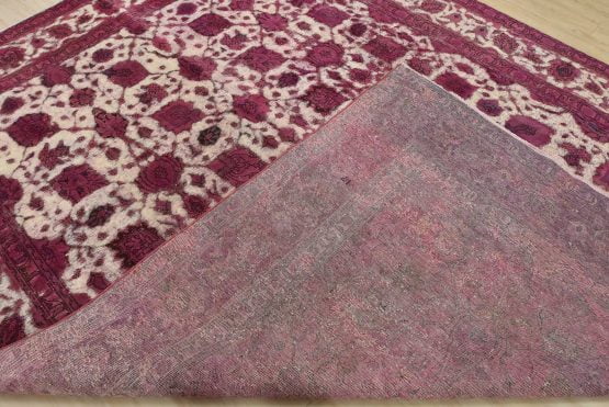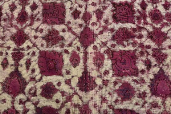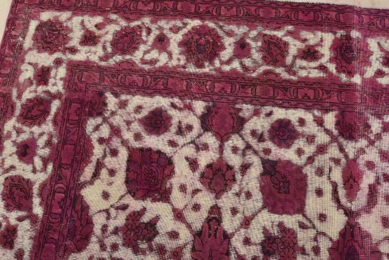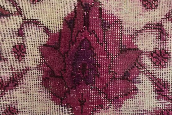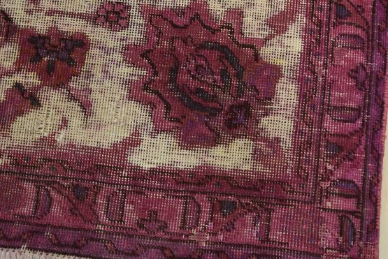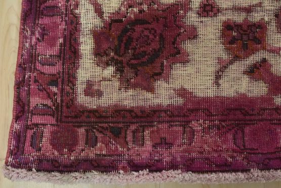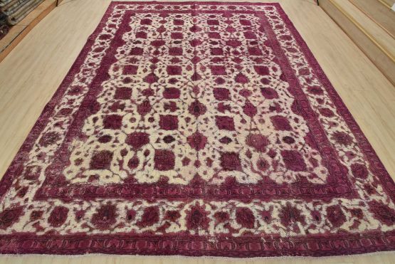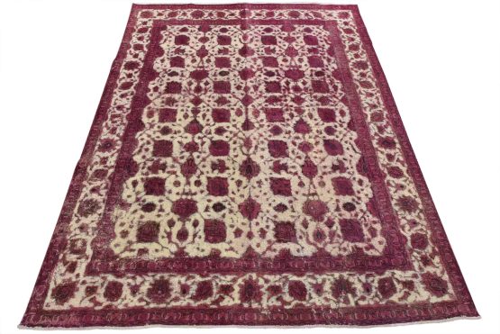 An authentic vintage traditional Overdyed Tabriz rug hand-knotted with an all-wool pile on a cotton foundation. This oriental rug features an all-over floral design set against an ivory background. It has a low wool pile, is worn and distressed, with threadbare areas and minor imperfections (see photos). However, it is in very good condition.