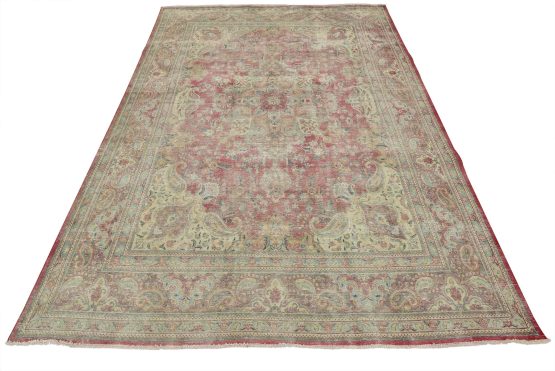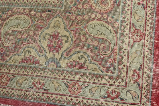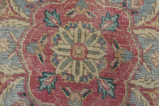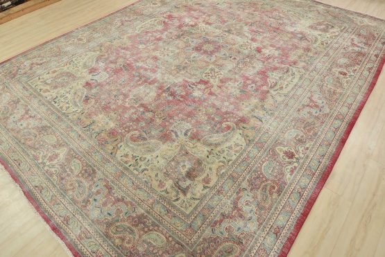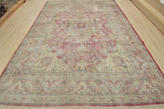An authentic vintage traditional Tabriz rug hand-knotted with an all-wool pile on a cotton foundation. This oriental rug features a muted central medallion surrounded by muted floral designs set against a red background. It has a low wool pile, is worn and distressed, and has minor imperfections (see photos). However, it is in very good condition.