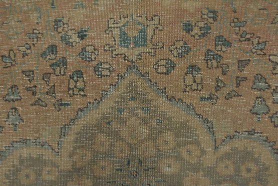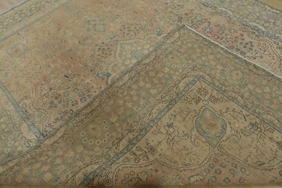 An authentic vintage traditional Tabriz rug hand-knotted with an all-wool pile on a cotton foundation. This oriental rug features a muted central medallion surrounded by a muted floral design set against a pink background. It has a low wool pile, is worn and distressed, and has minor imperfections (see photos). However, it is in very good condition.