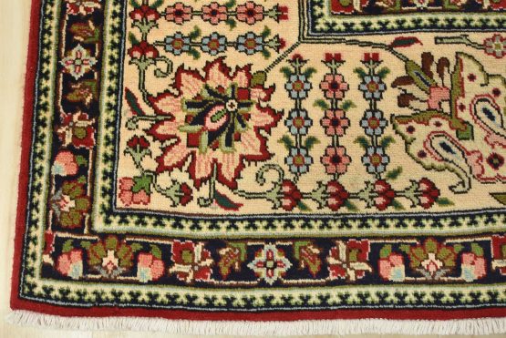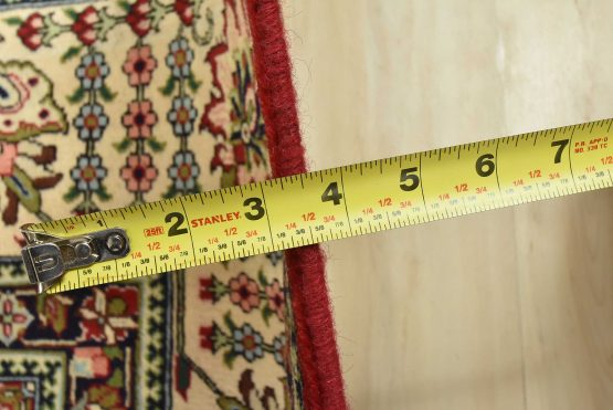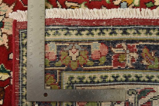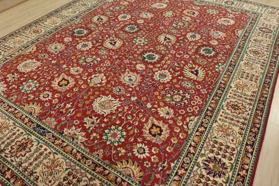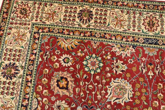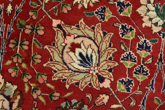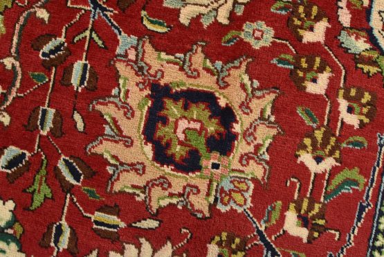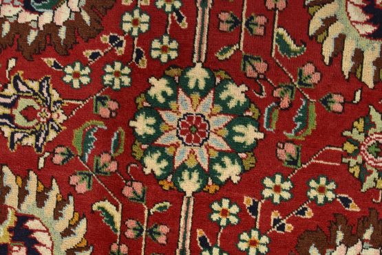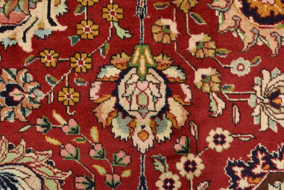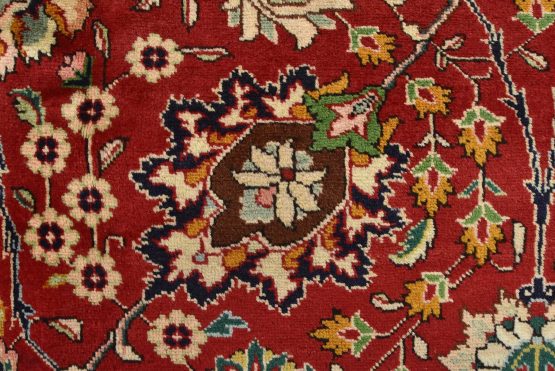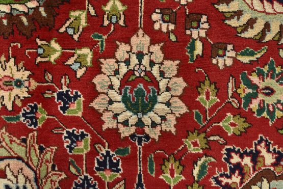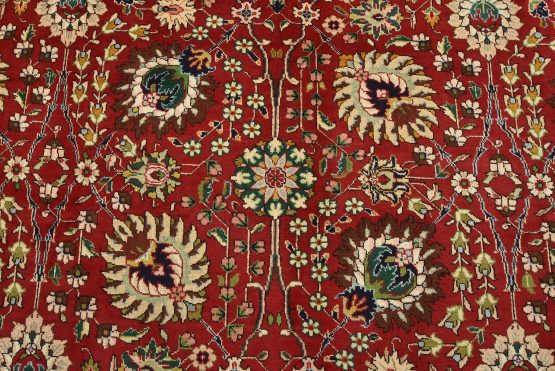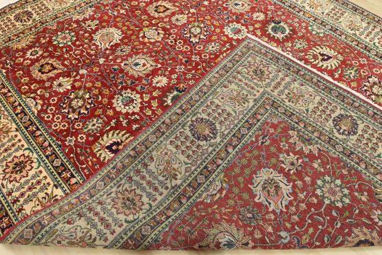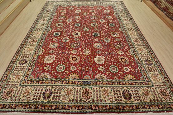 An authentic vintage traditional Tabriz rug hand-knotted with fine wool and natural dyes. This finely woven oriental rug features an all-over floral pattern set against a red background. It has a full wool pile with no worn areas and is in very good condition.