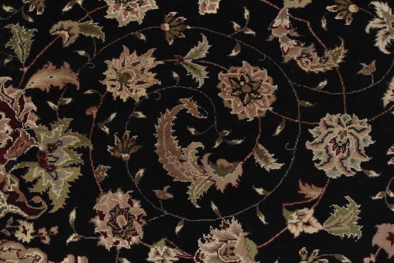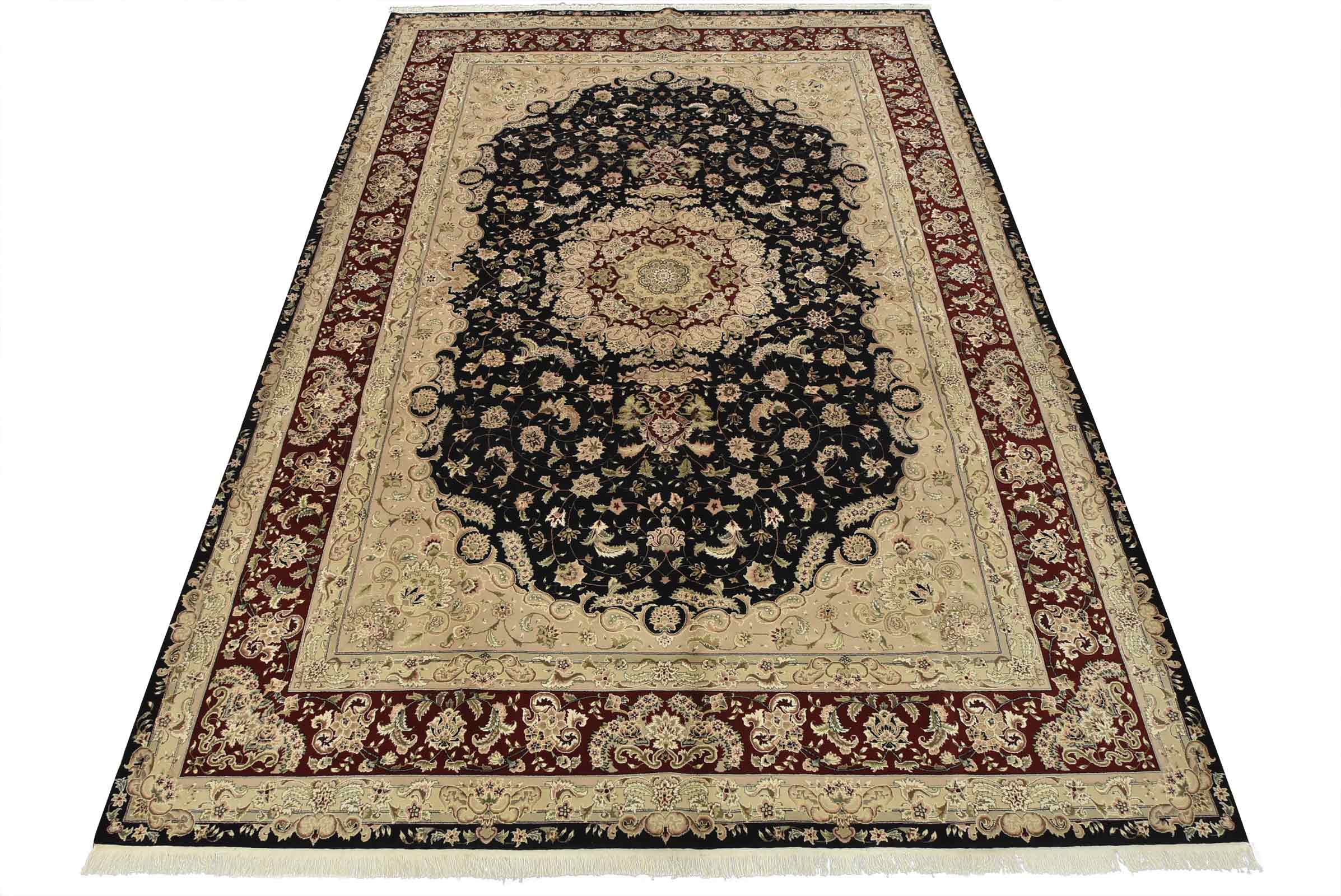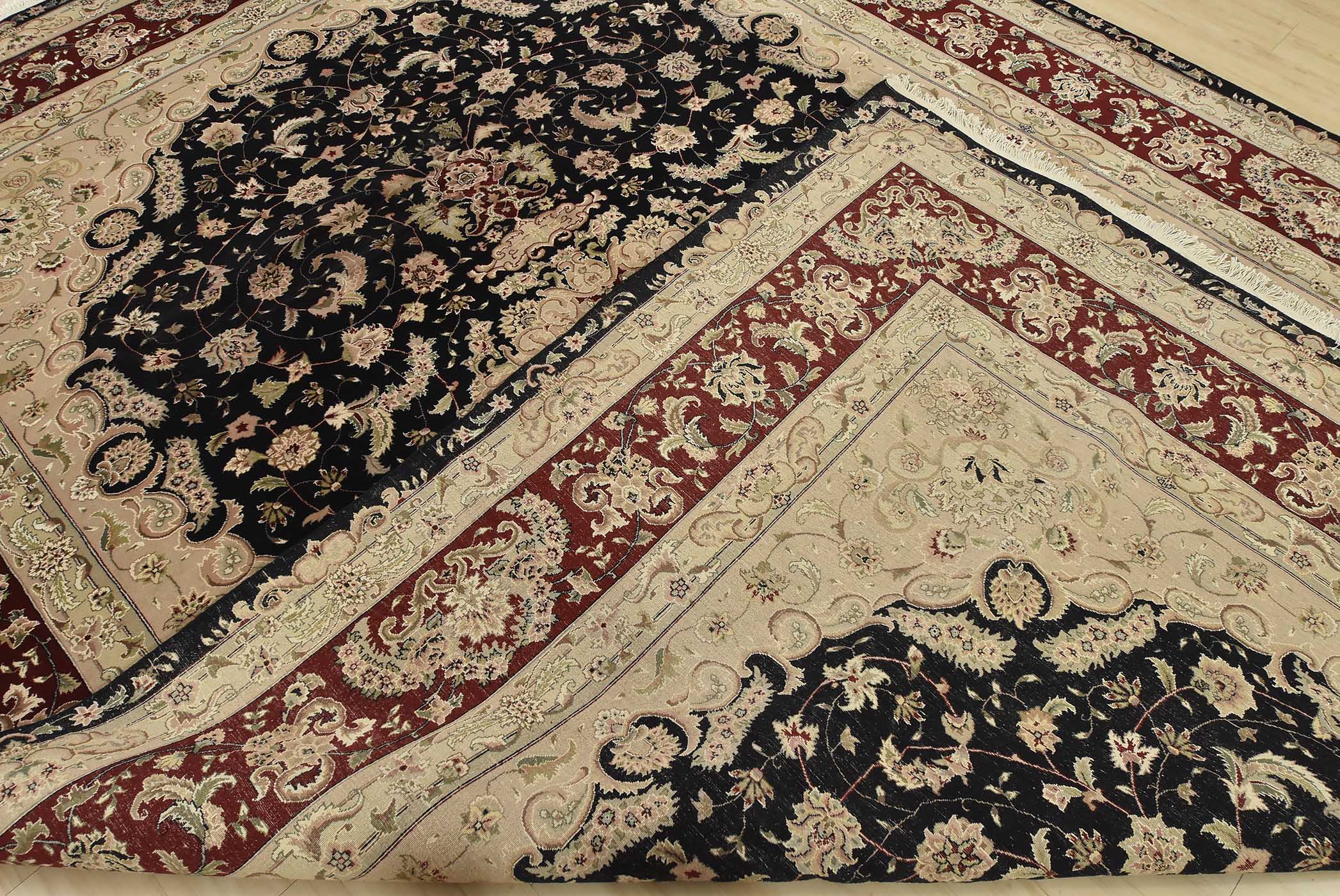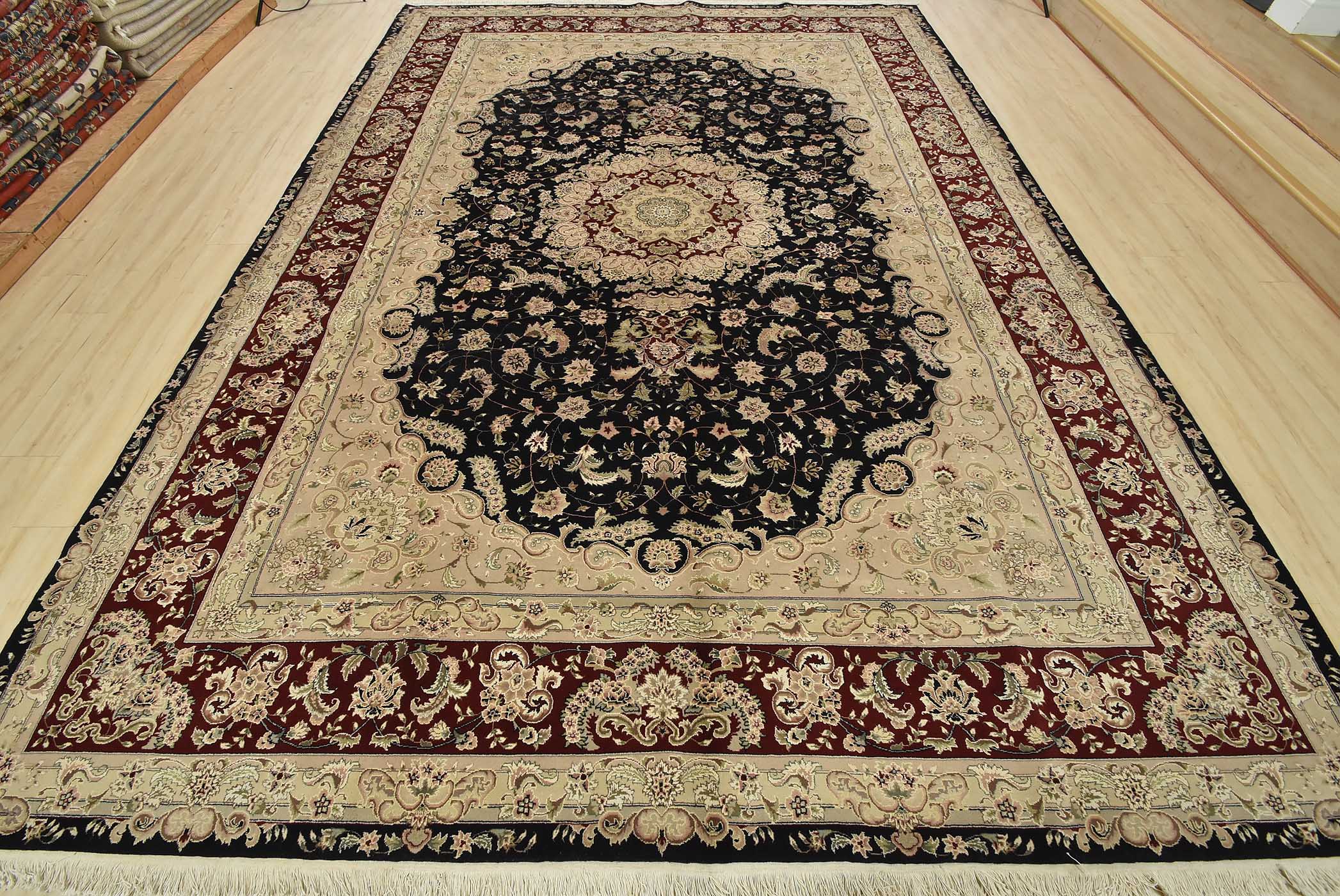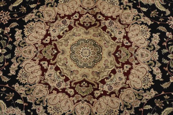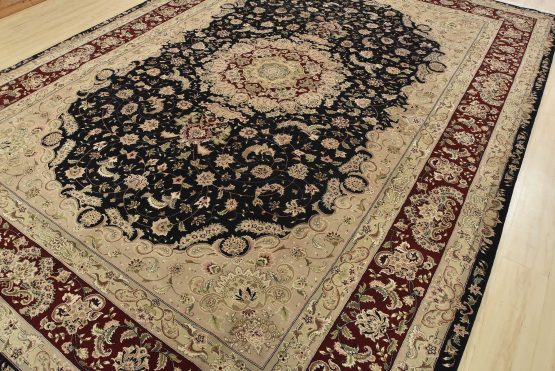 A traditional Tabriz rug hand-knotted with fine wool and silk highlights on a cotton foundation. This intricately woven oriental rug features a central medallion surrounded by a floral design set against a black background. It is new and in excellent condition.