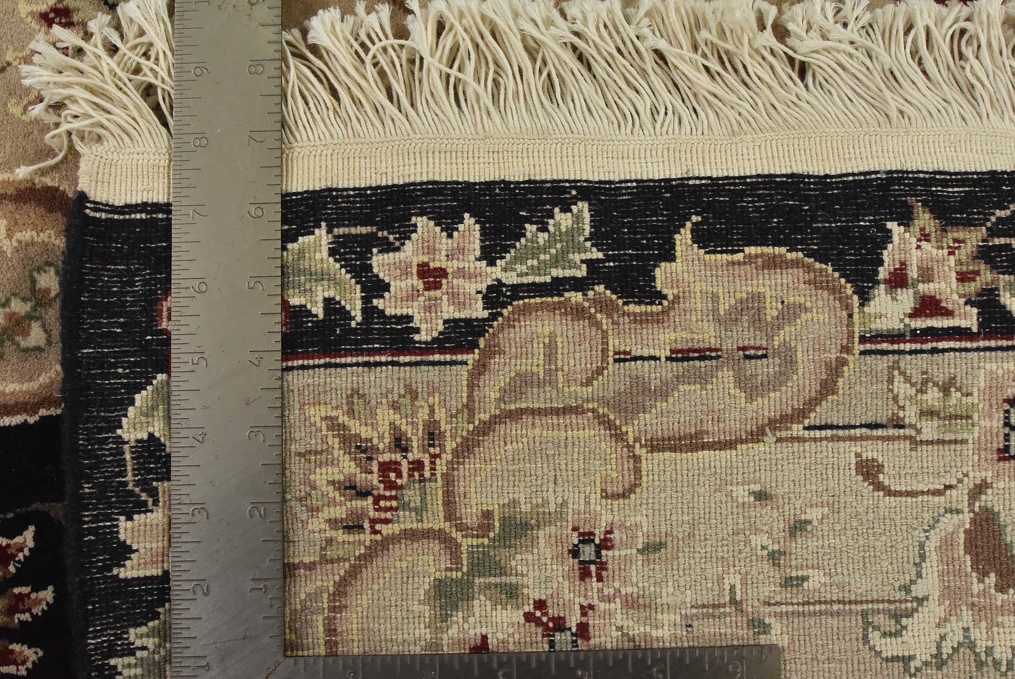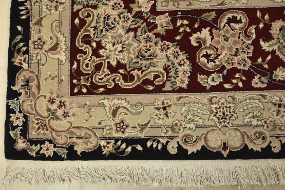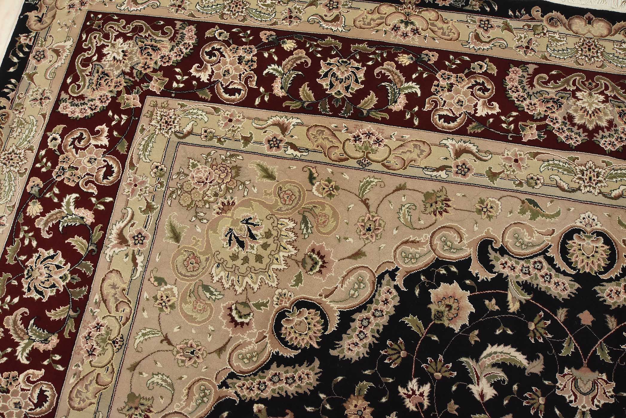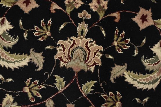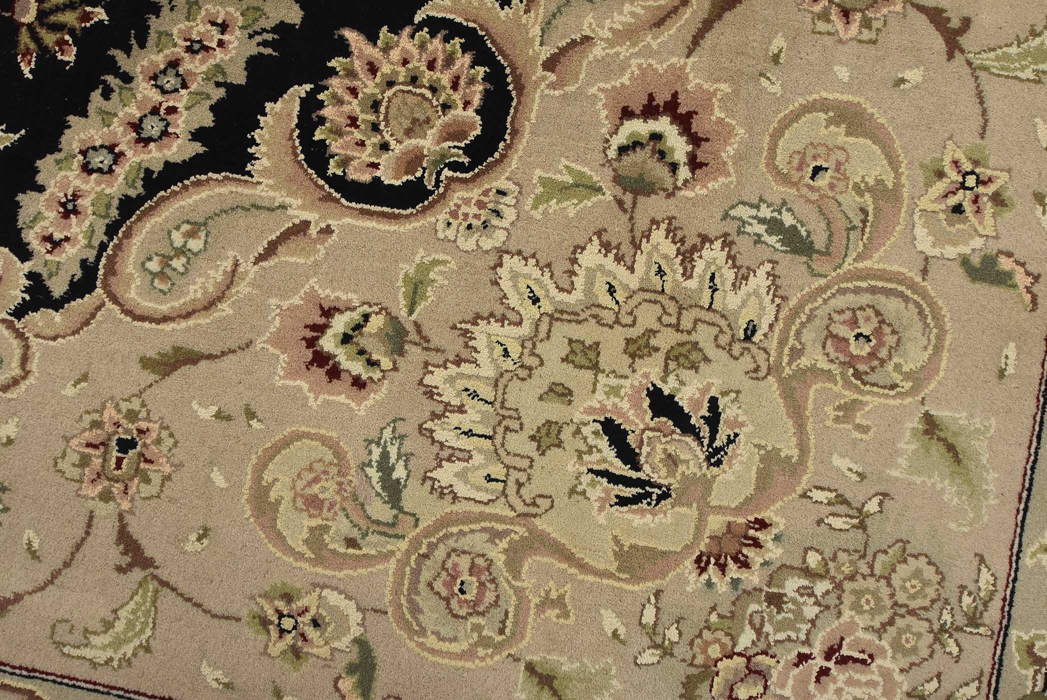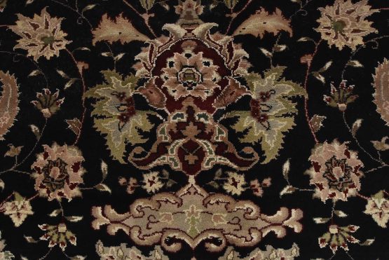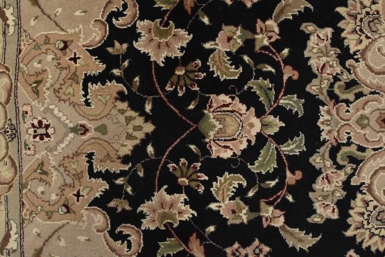 A traditional Tabriz rug hand-knotted with fine wool and silk highlights on a cotton foundation. This intricately woven oriental rug features a central medallion surrounded by a floral design set against a black background. It is new and in excellent condition.