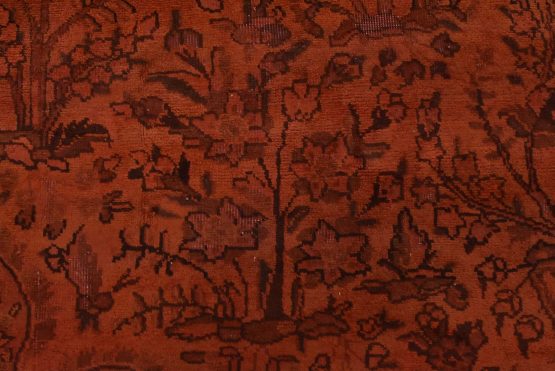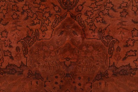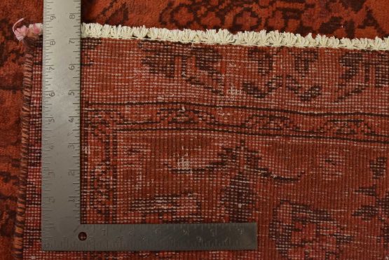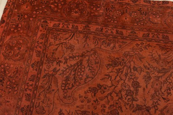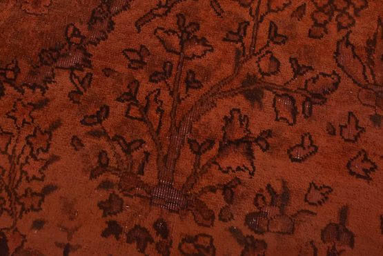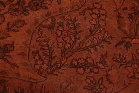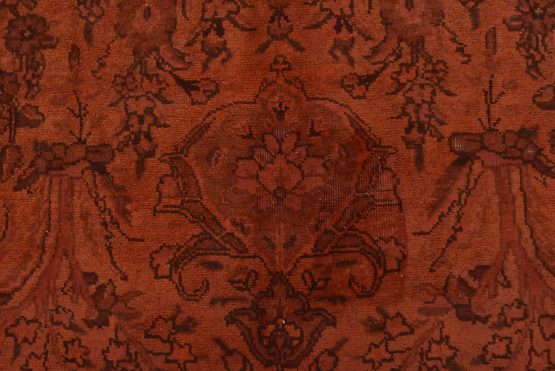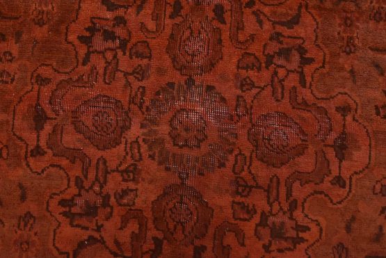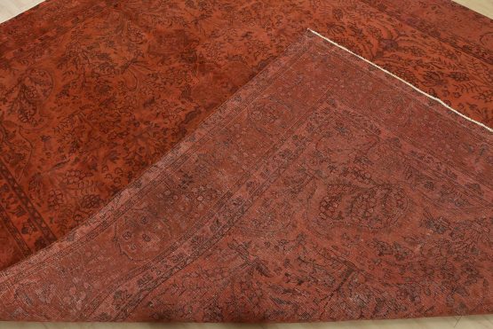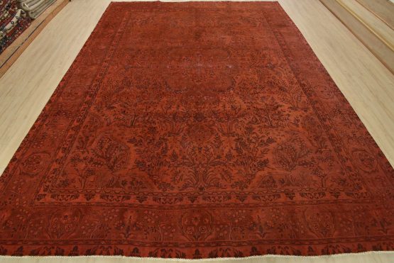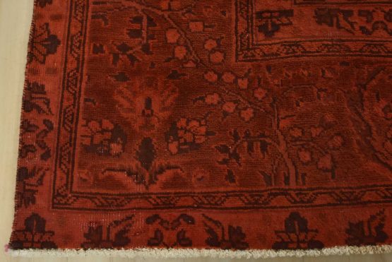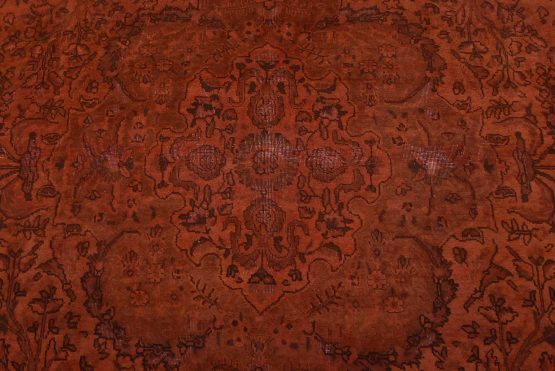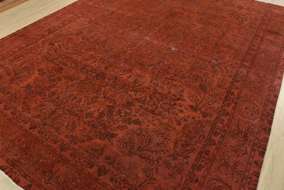 An authentic vintage traditional Overdyed Tabriz rug hand-knotted with an all-wool pile on a cotton foundation. This oriental rug features a central medallion surrounded by a floral design set against a red background. It has a low wool pile, is worn and distressed, and has minor imperfections (see photos). However, it is in very good condition.