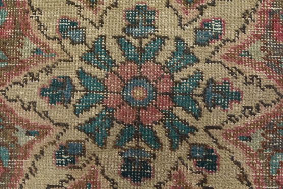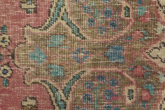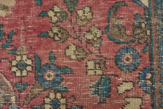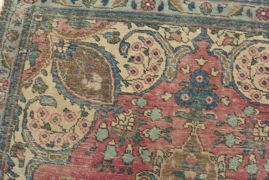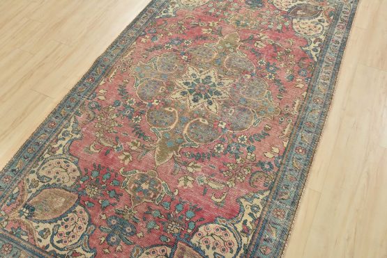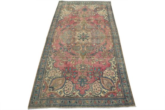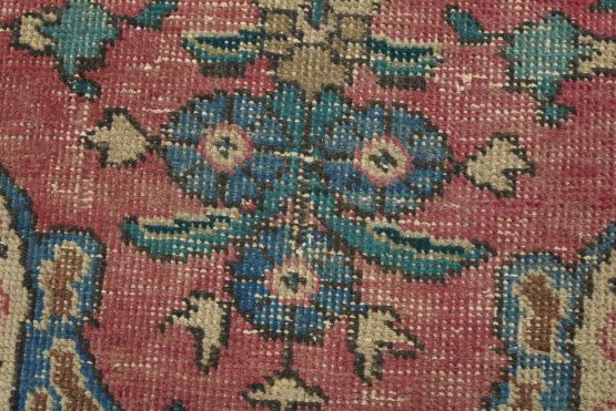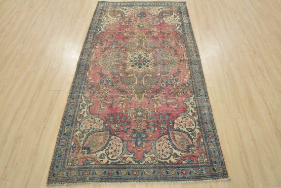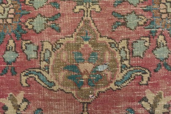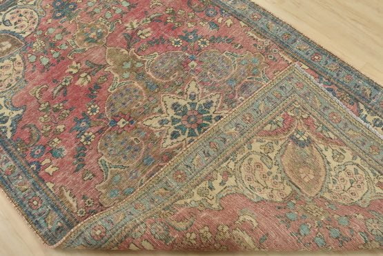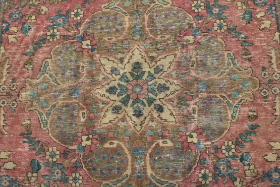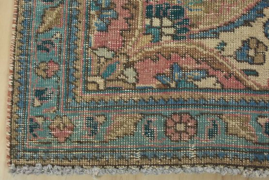 An authentic vintage traditional Tabriz rug hand-knotted with fine wool and natural dyes. This oriental rug features muted colors with a central curvilinear medallion surrounded by floral motifs set against a pink background. It has a low wool pile, is worn and distressed, and has minor imperfections (see photos). However, it is in very good condition.