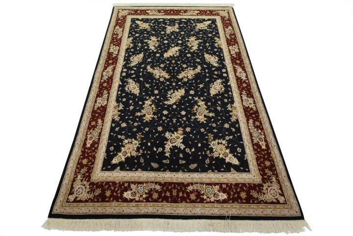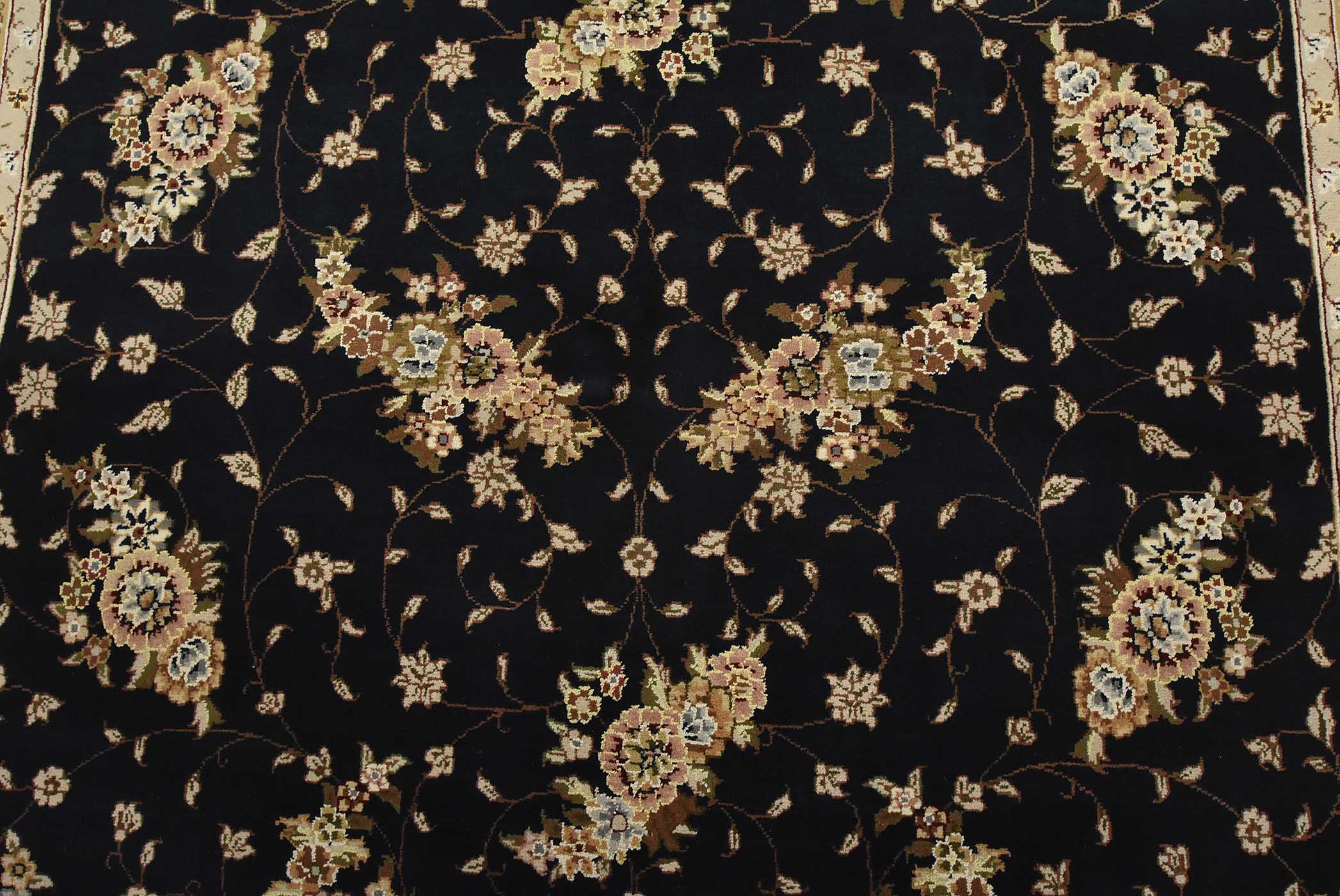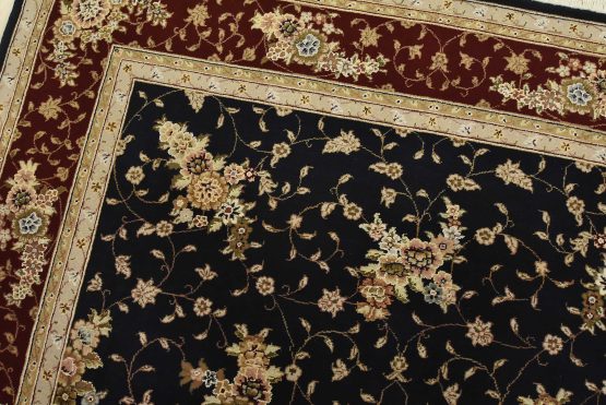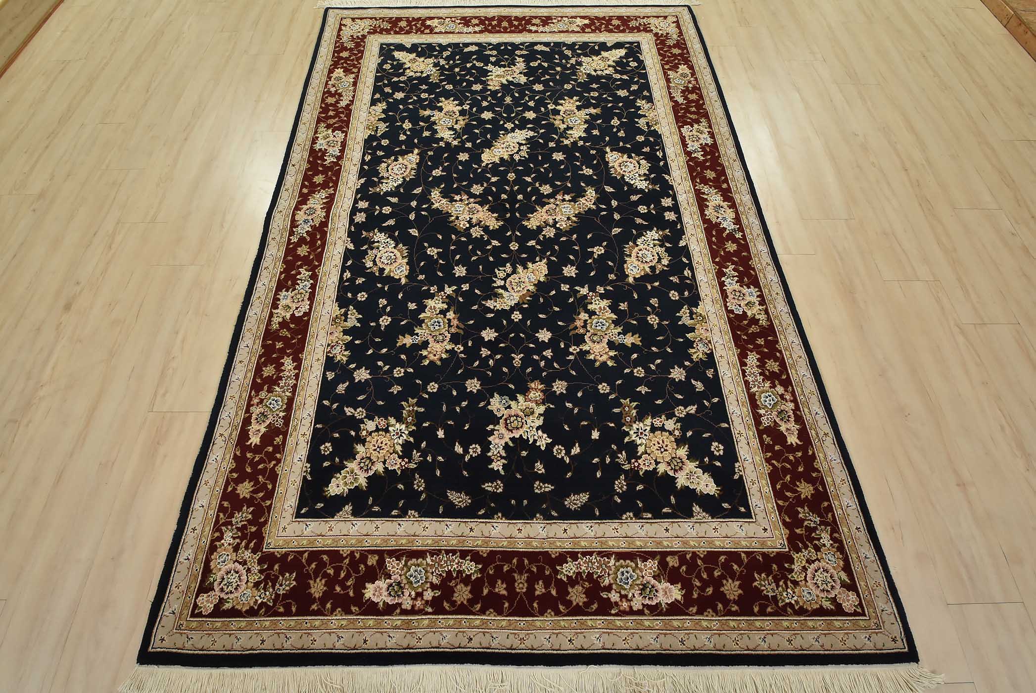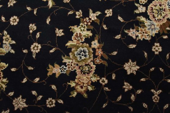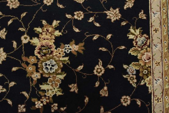 A traditional Tabriz rug hand-knotted with fine wool and silk highlights on a cotton foundation. This intricately woven oriental rug features an all-over floral design set against a dark blue background. It is new and in excellent condition.