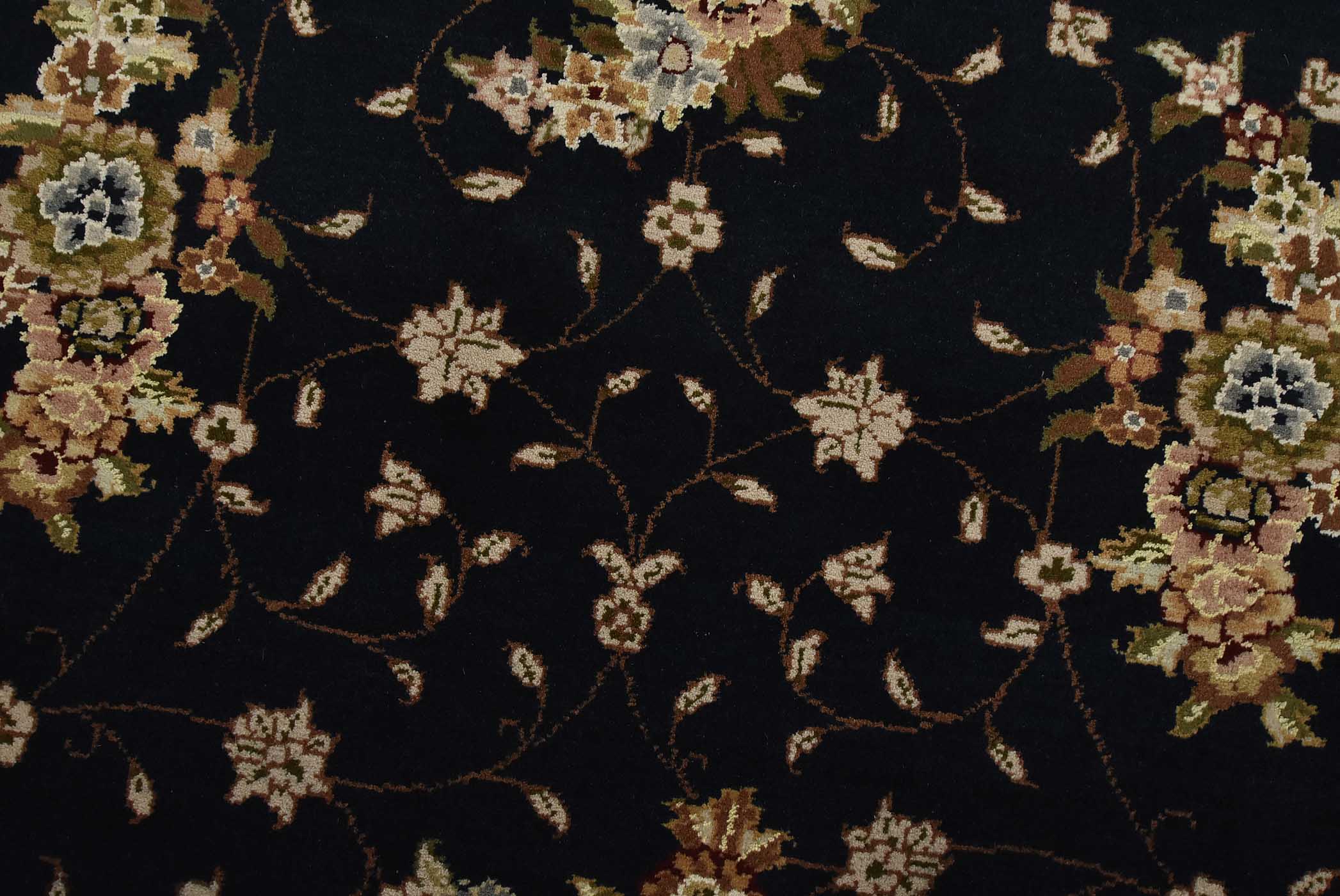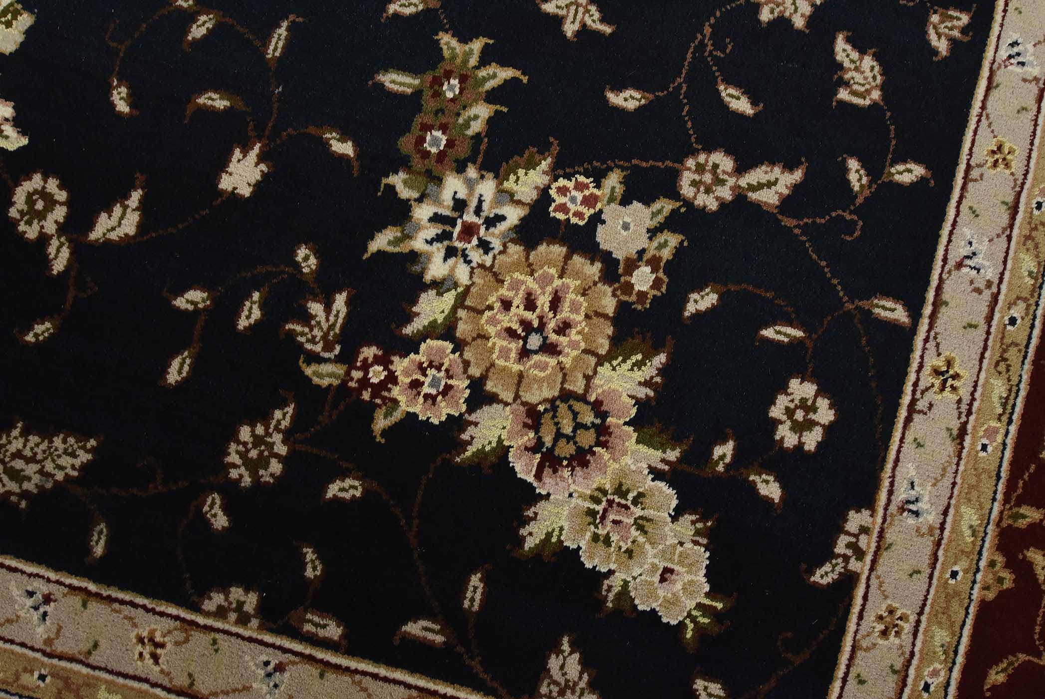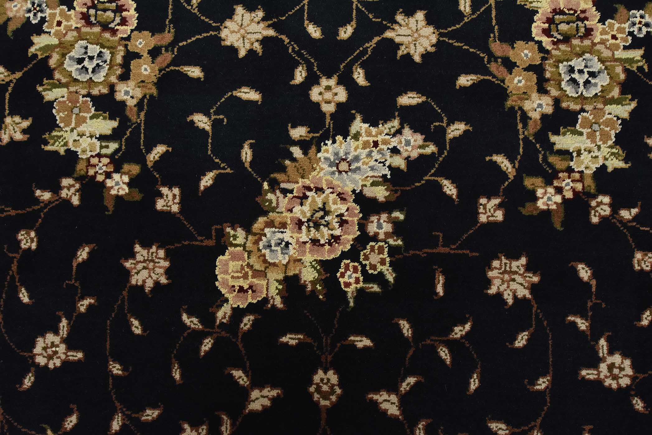 A traditional Tabriz rug hand-knotted with fine wool and silk highlights on a cotton foundation. This intricately woven oriental rug features an all-over floral design set against a dark blue background. It is new and in excellent condition.