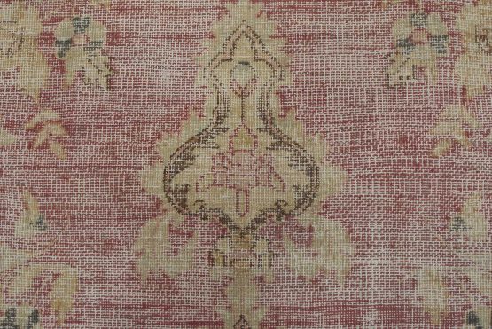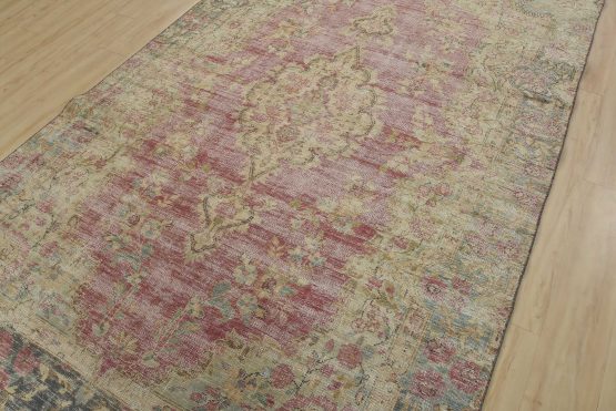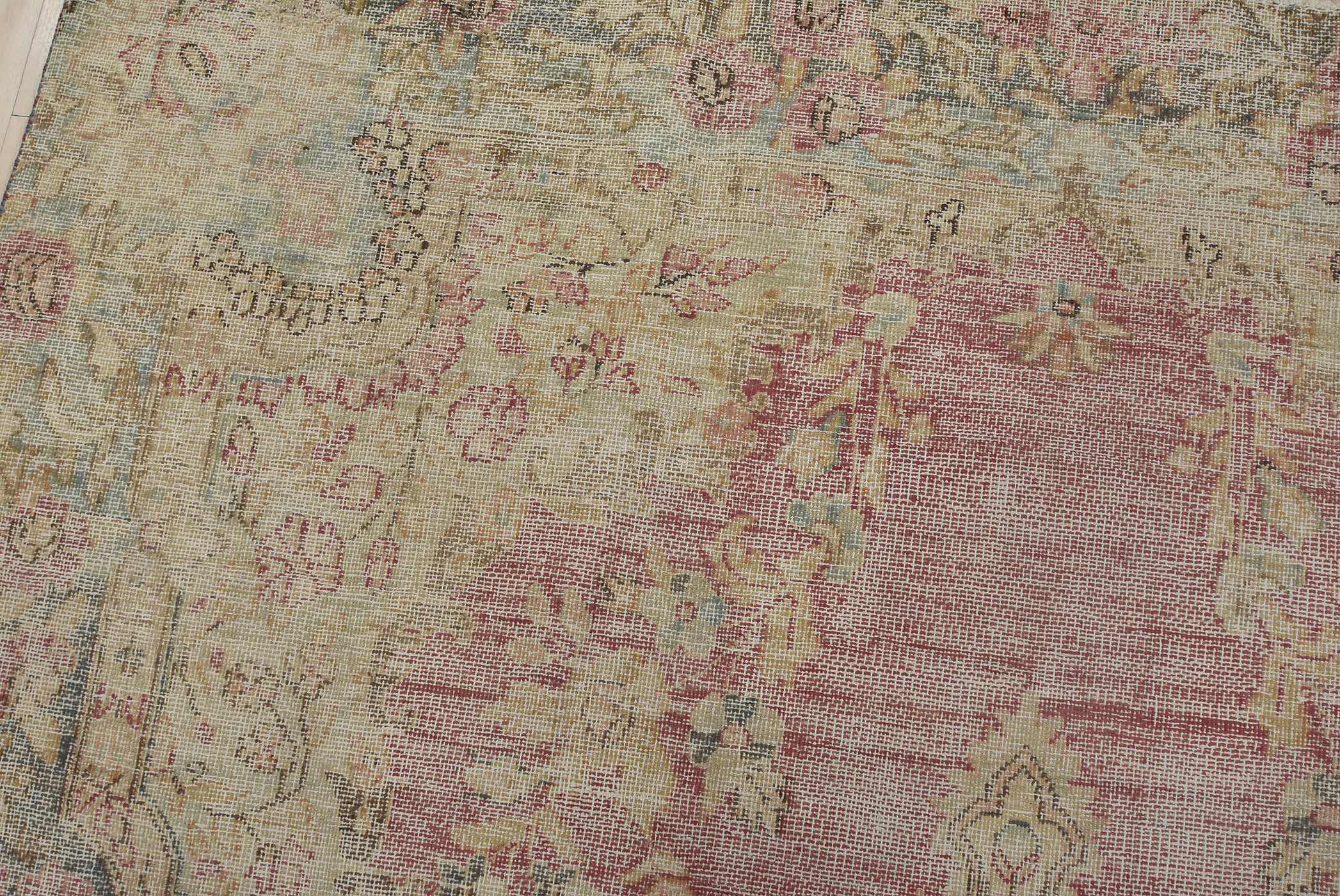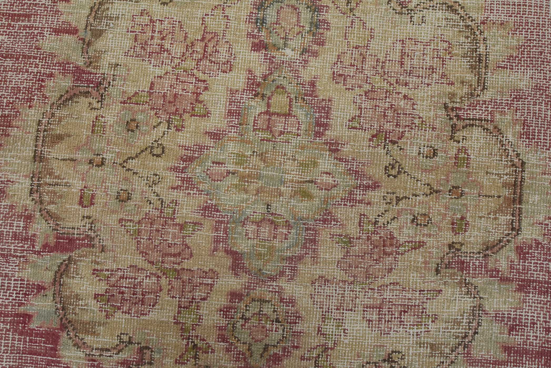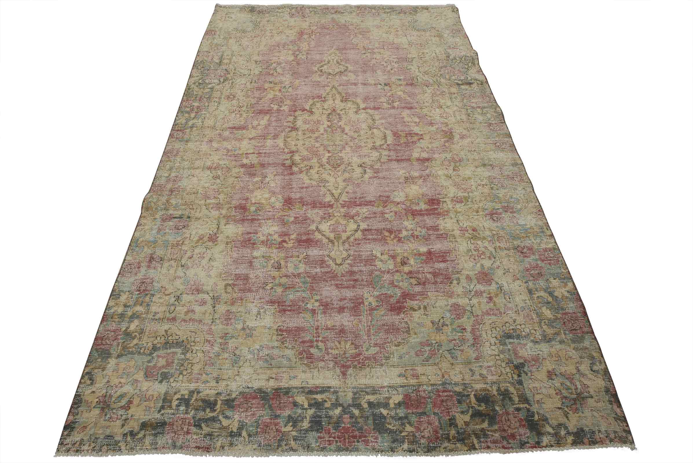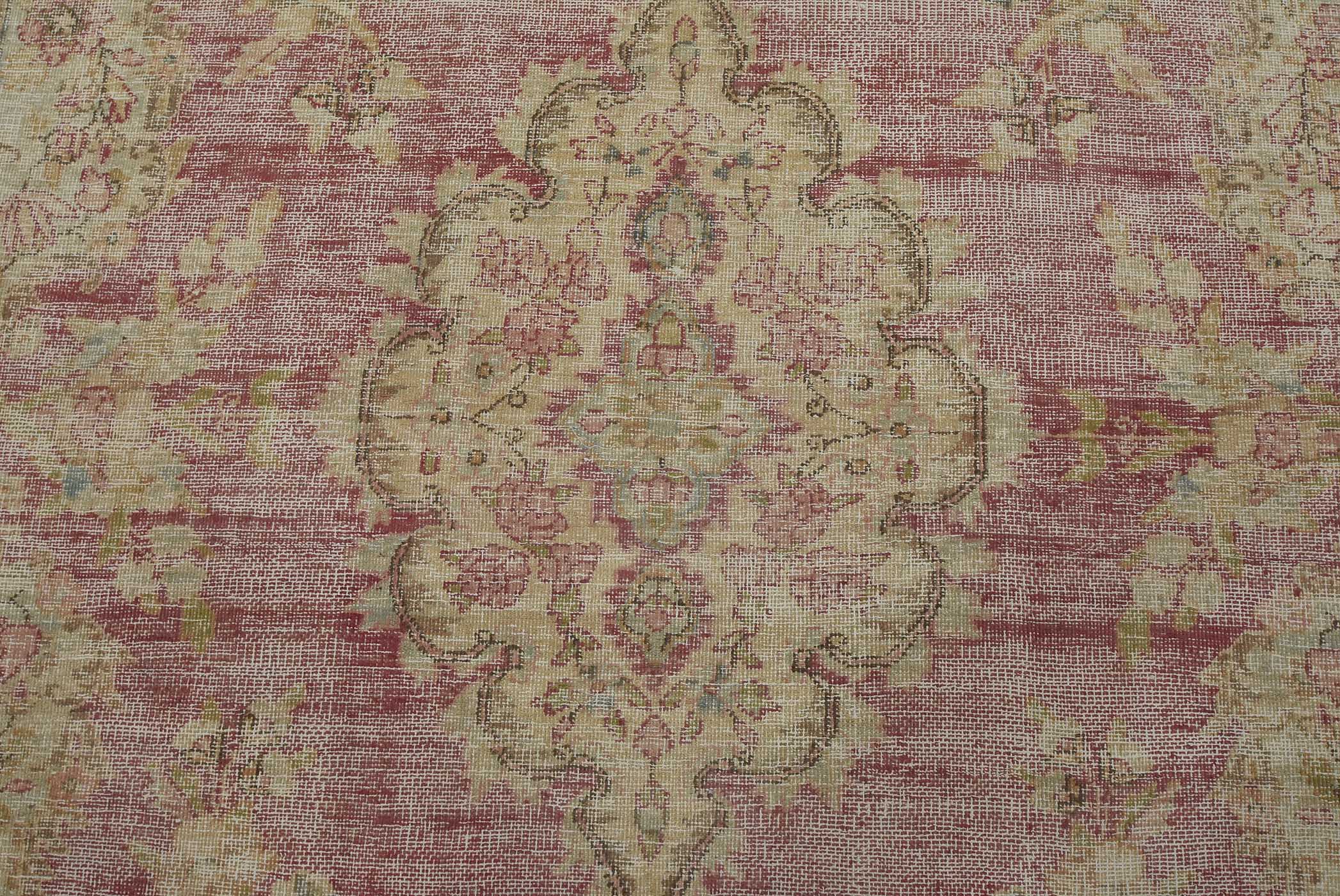 An authentic vintage traditional Tabriz rug hand-knotted with fine wool and natural dyes. This oriental rug features a central medallion surrounded by floral motifs set against a pink background. It has a low wool pile, is worn and distressed, and has minor imperfections (see photos). However, it is in very good condition.