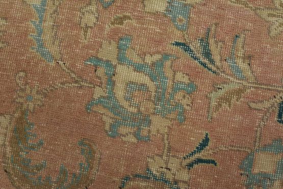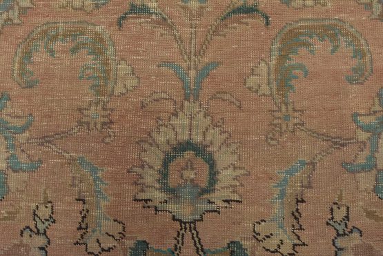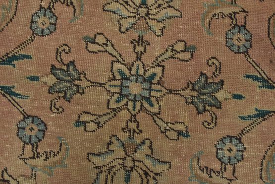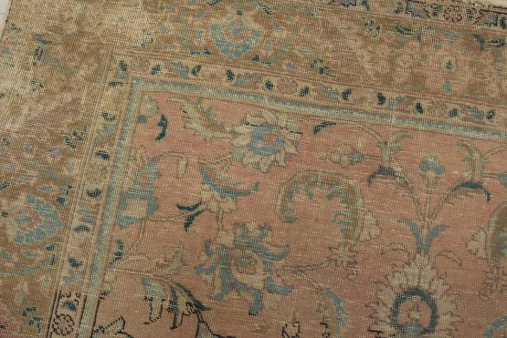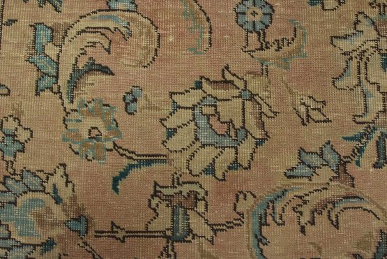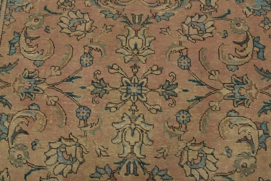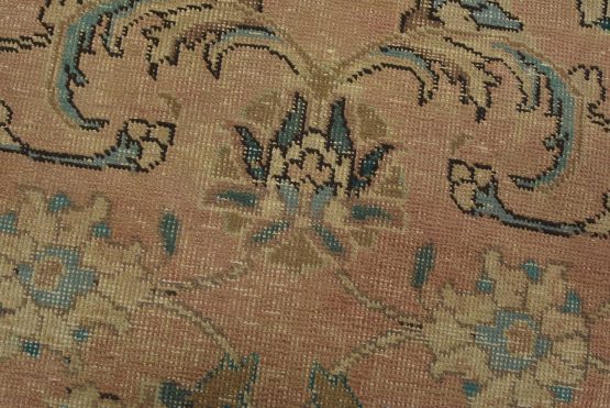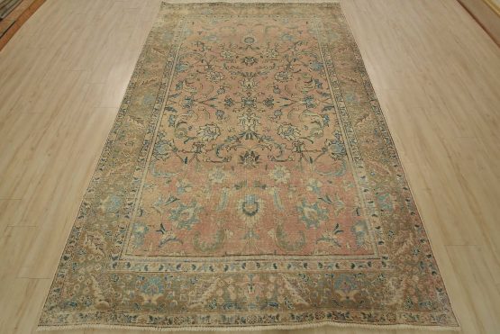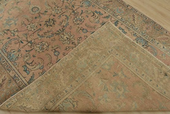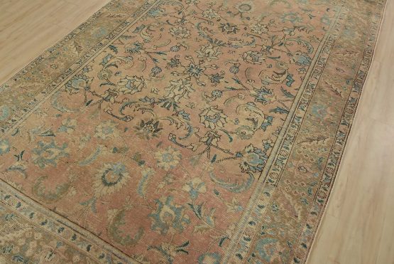 An authentic vintage traditional Tabriz rug hand-knotted with fine wool and natural dyes. This oriental rug features an all-over floral design set against a pink background. It has a low wool pile, is worn and distressed, and has minor imperfections (see photos). However, it is in very good condition.