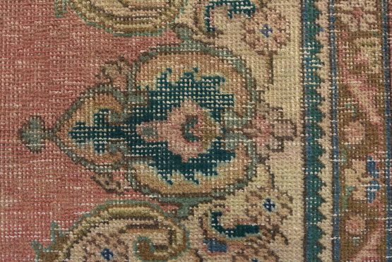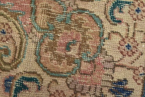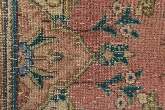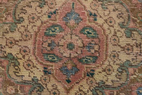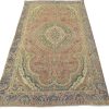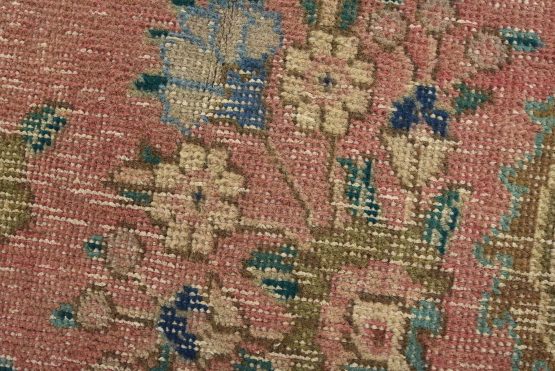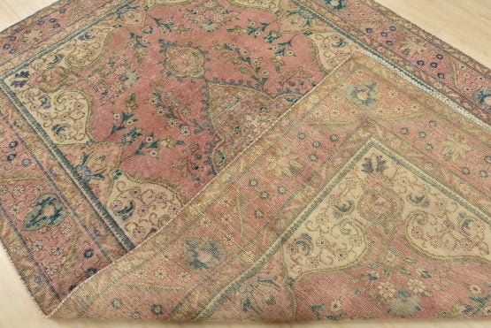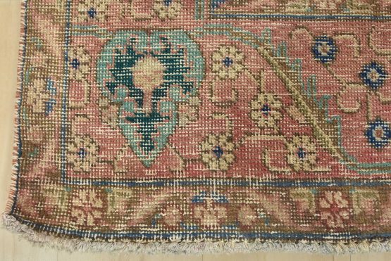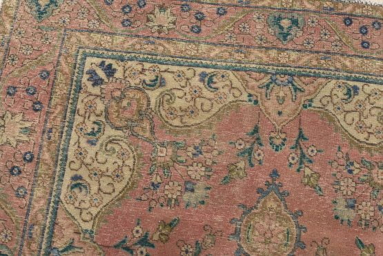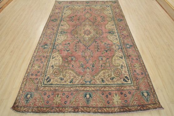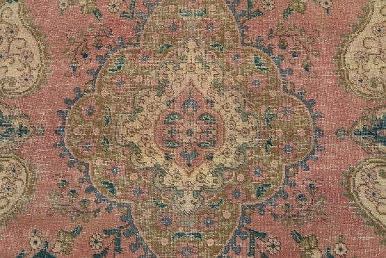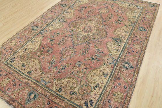 An authentic vintage traditional Tabriz rug hand-knotted with an all-wool pile on a cotton foundation. This oriental rug features a muted central medallion surrounded by muted floral motifs set against a pink background. It has a low wool pile, is worn and distressed, and has minor imperfections (see photos). However, it is in very good condition.