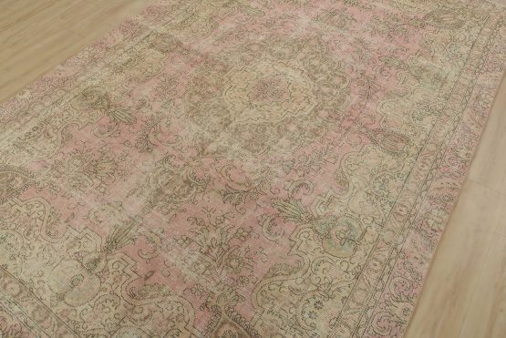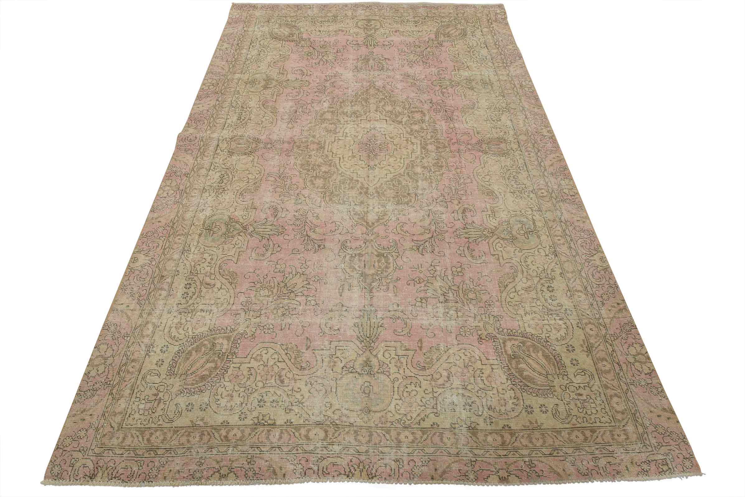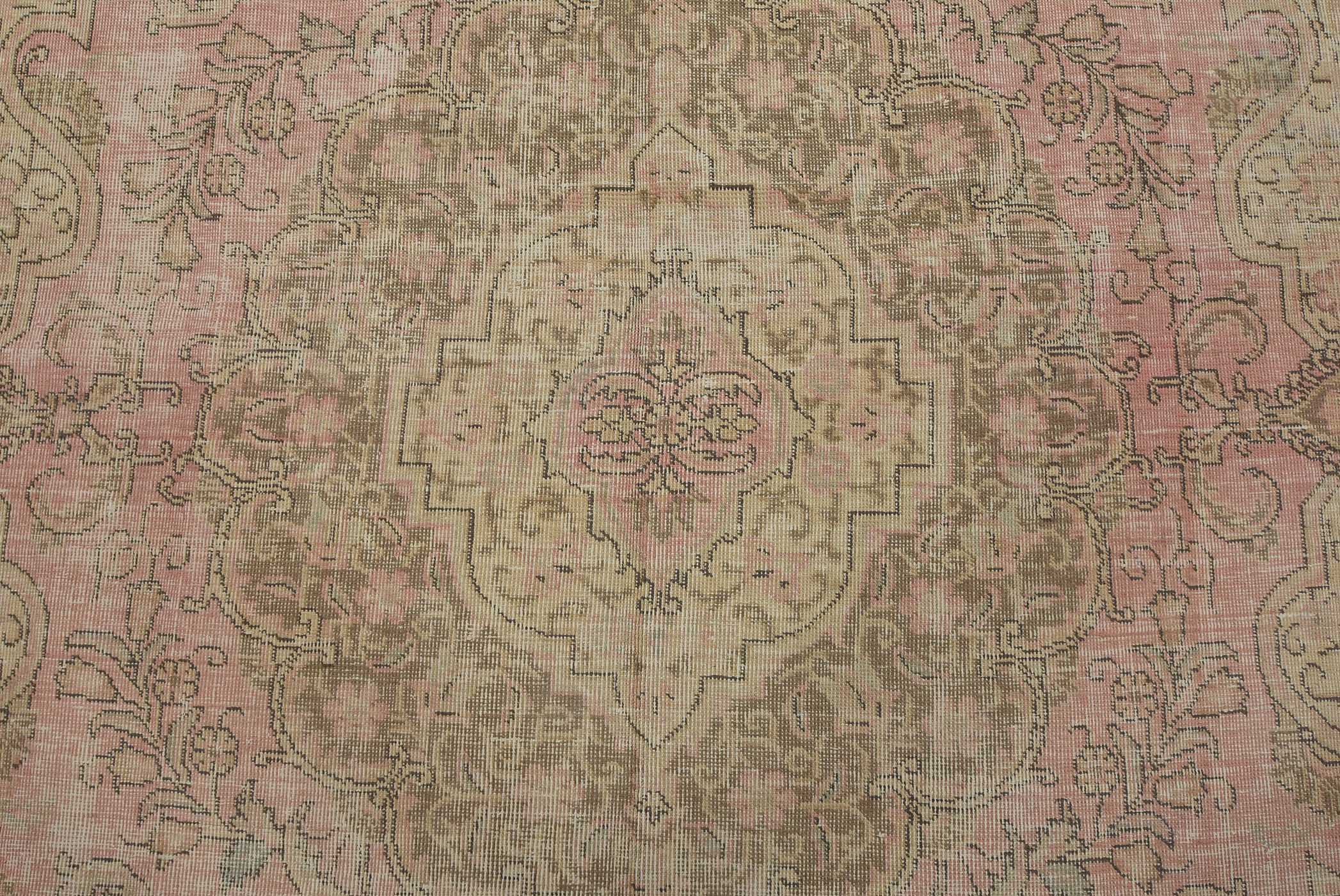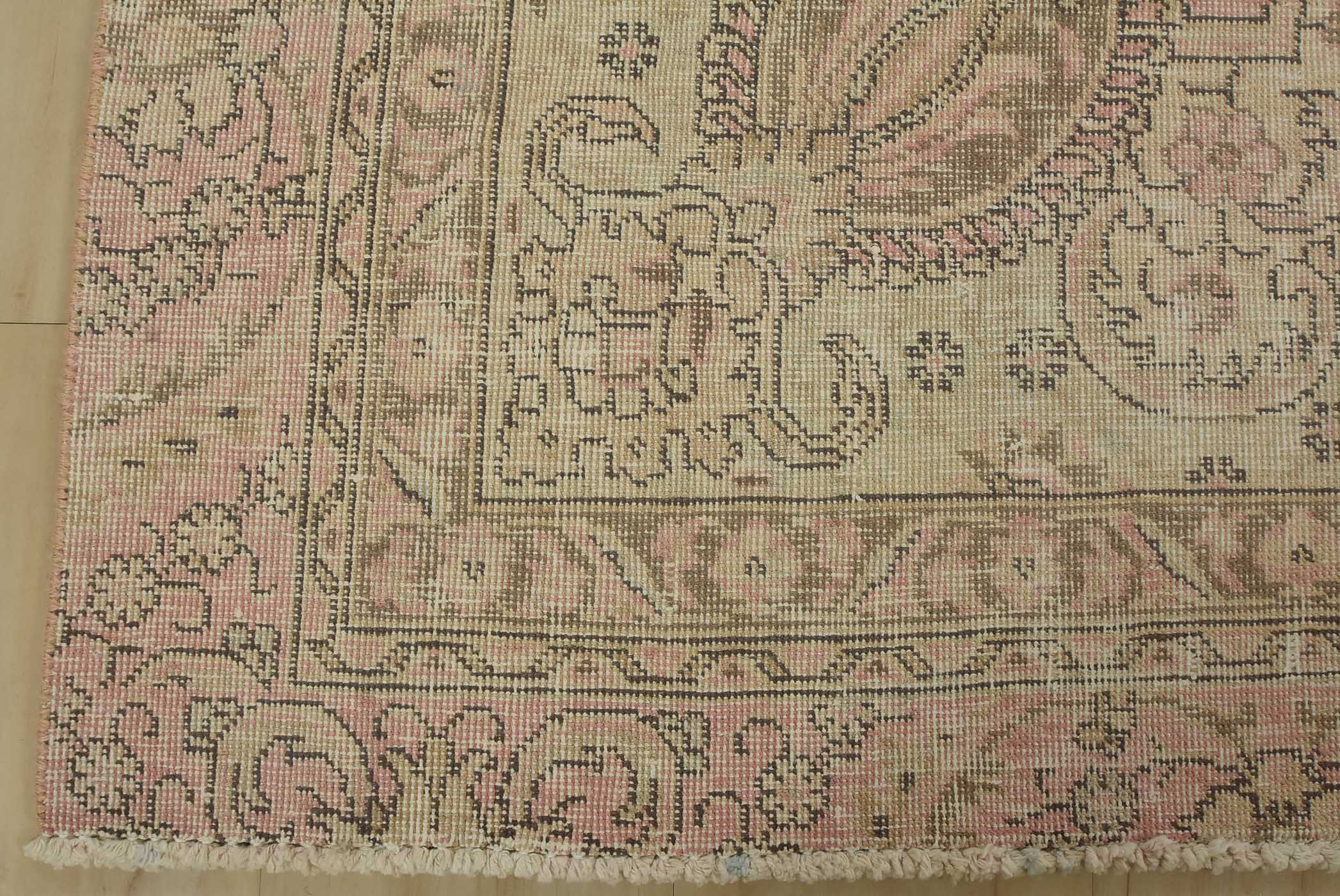 An authentic vintage traditional Tabriz rug hand-knotted with fine wool and natural dyes. This oriental rug features a central medallion surrounded by a floral design set against a pink background. It has a low wool pile, is worn and distressed, and has minor imperfections (see photos). However, it is in very good condition.