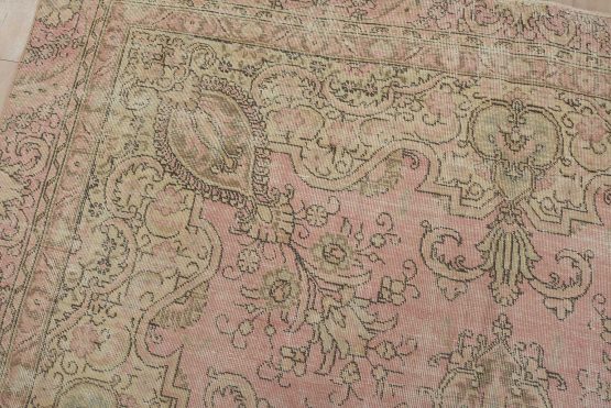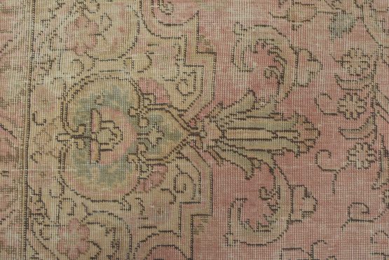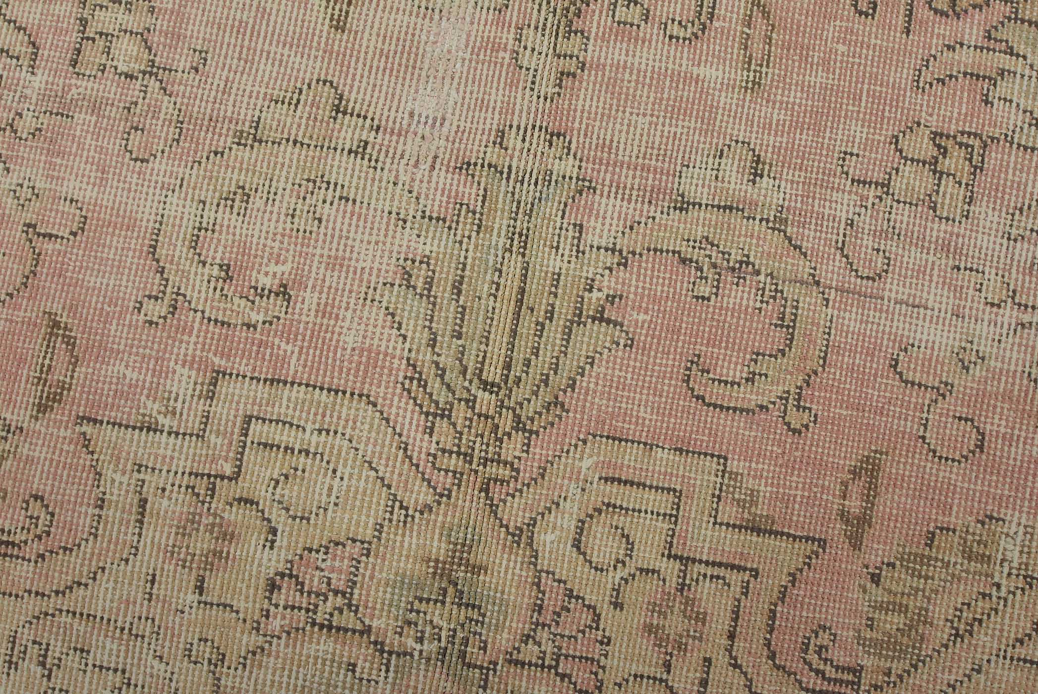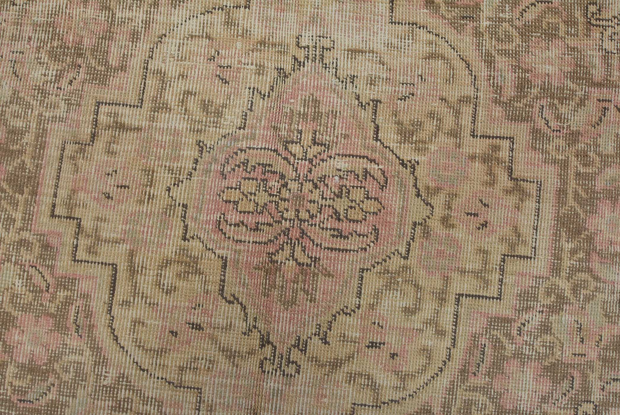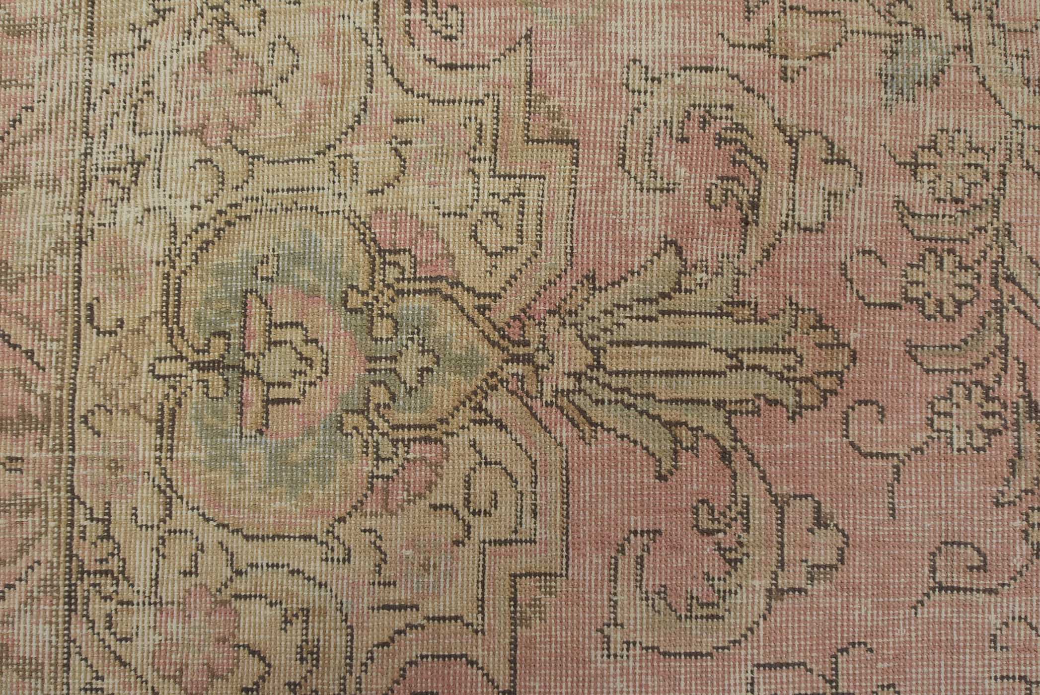 An authentic vintage traditional Tabriz rug hand-knotted with fine wool and natural dyes. This oriental rug features a central medallion surrounded by a floral design set against a pink background. It has a low wool pile, is worn and distressed, and has minor imperfections (see photos). However, it is in very good condition.