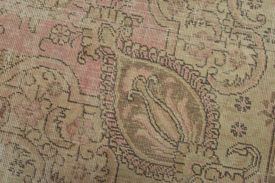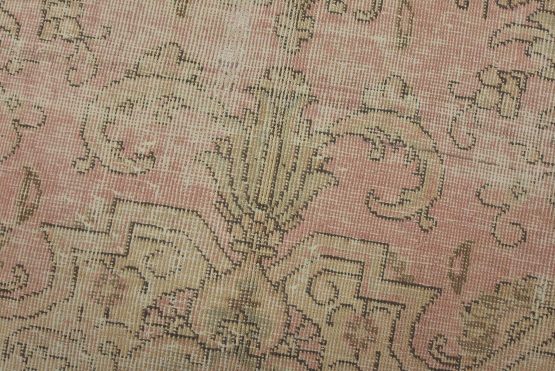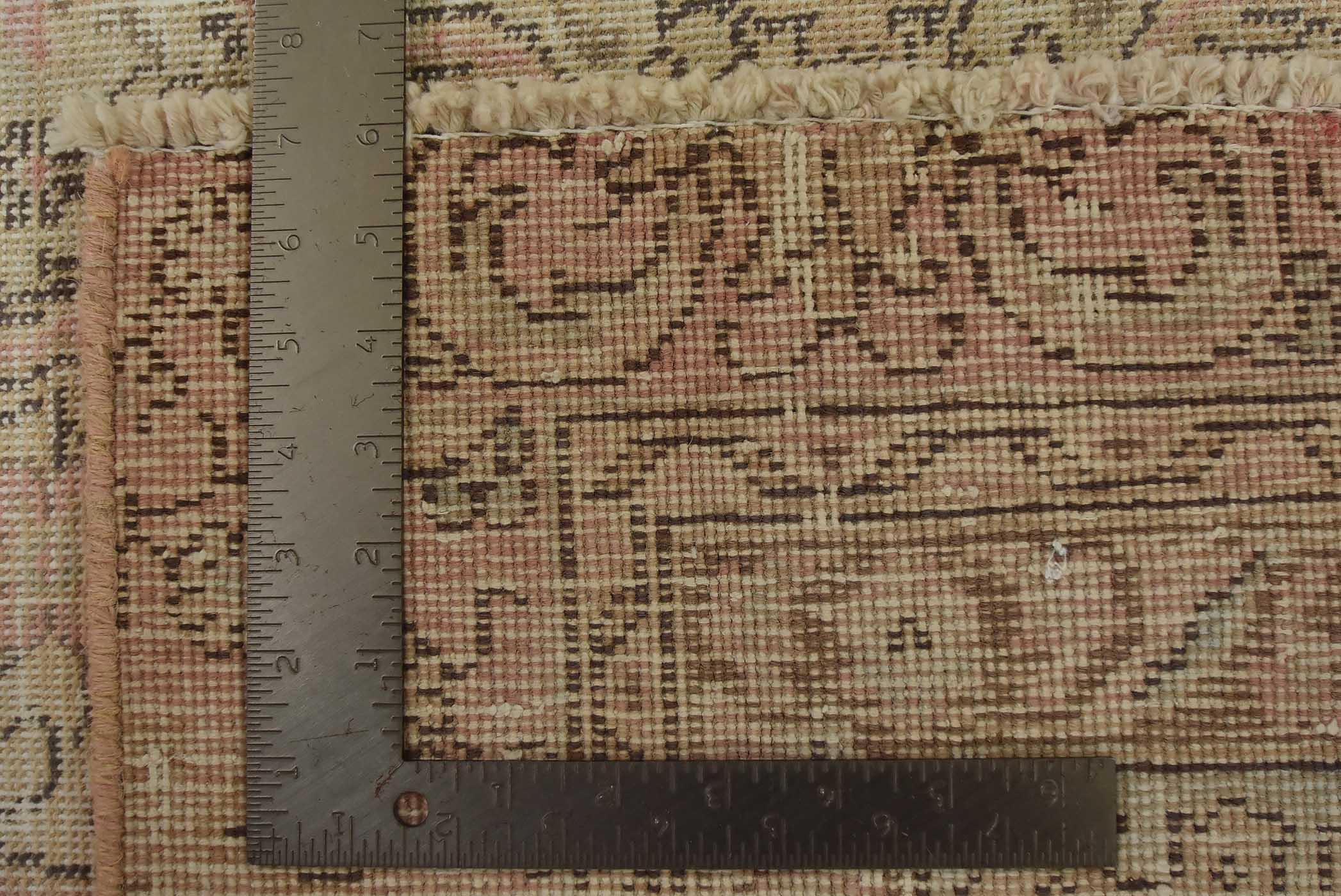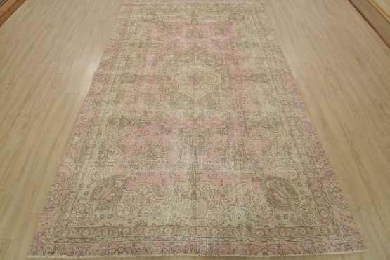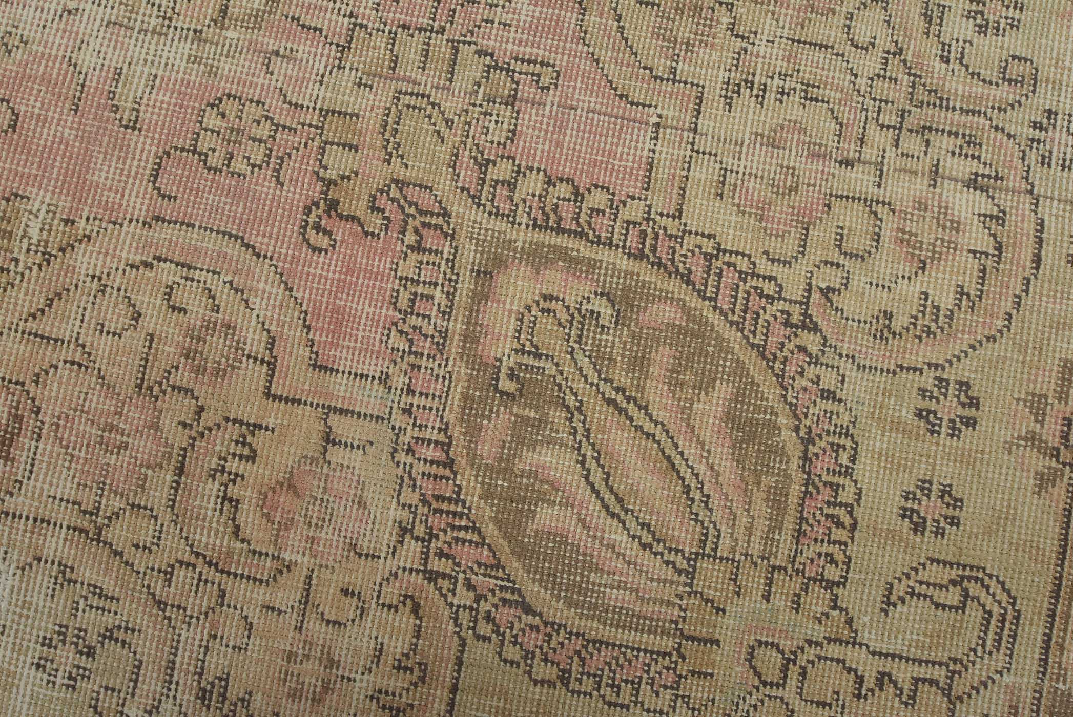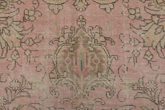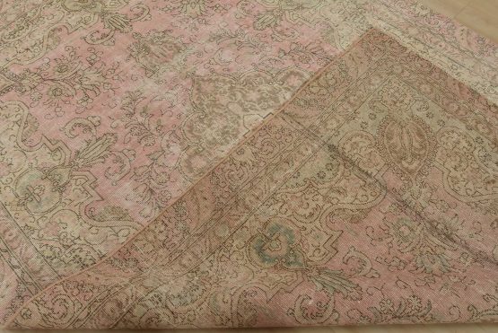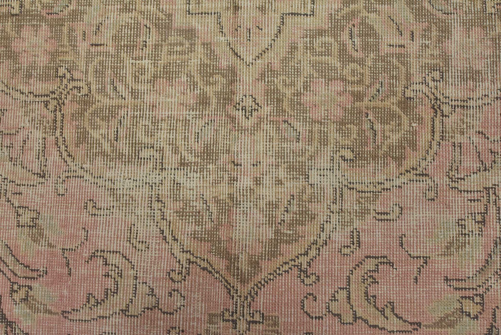 An authentic vintage traditional Tabriz rug hand-knotted with fine wool and natural dyes. This oriental rug features a central medallion surrounded by a floral design set against a pink background. It has a low wool pile, is worn and distressed, and has minor imperfections (see photos). However, it is in very good condition.