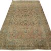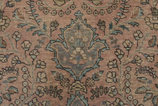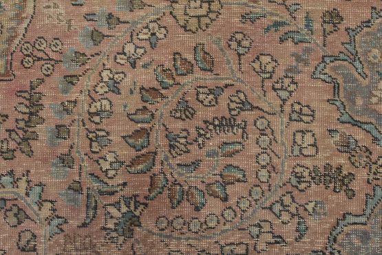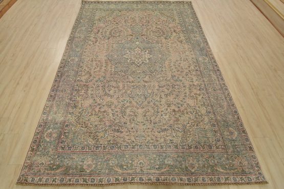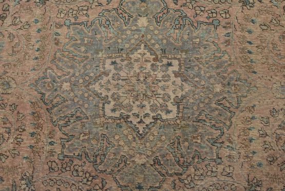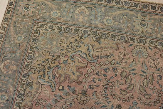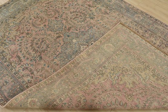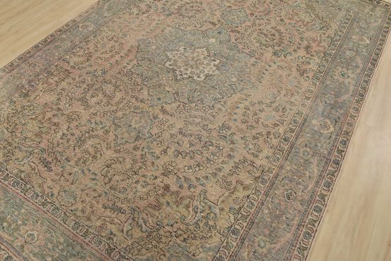 An authentic vintage traditional Tabriz rug hand-knotted with fine wool and natural dyes. This oriental rug features a central medallion surrounded by a botanical design set against a pink background. It has a low wool pile, is worn and distressed, and has minor imperfections (see photos). However, it is in very good condition.