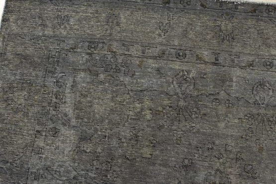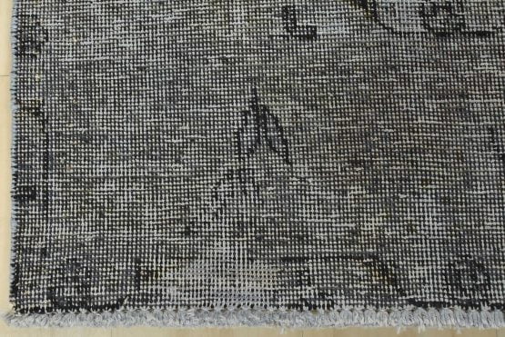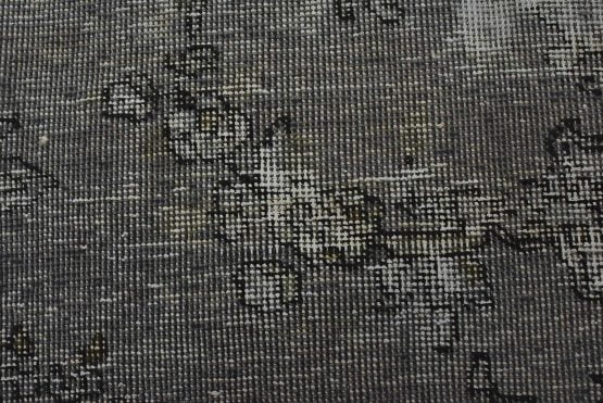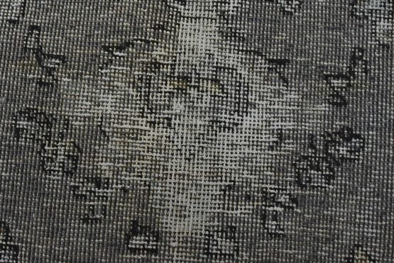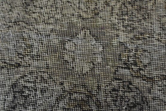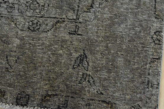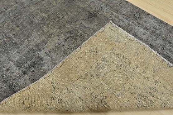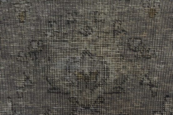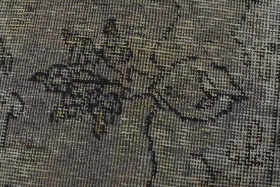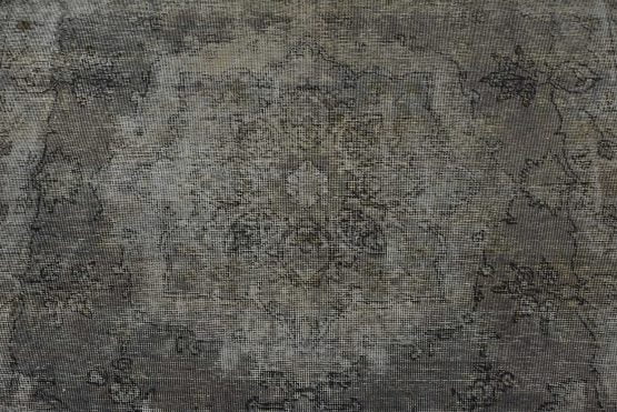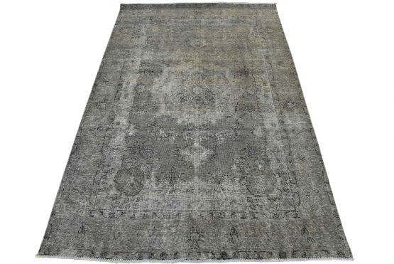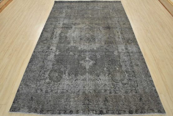 An authentic vintage traditional Overdyed Tabriz rug hand-knotted with an all-wool pile on a cotton foundation. This oriental rug features a muted central medallion surrounded by muted floral motifs set against a gray background. It has a low wool pile, is worn and distressed, and has minor imperfections (see photos). However, it is in very good condition.