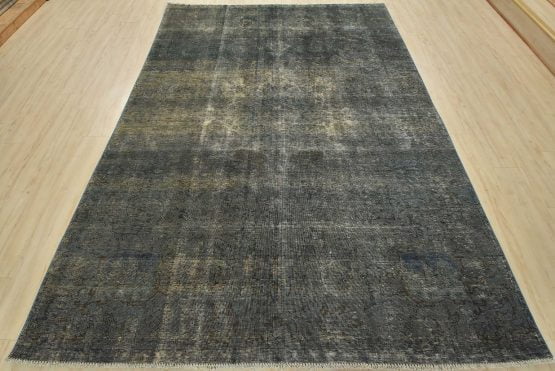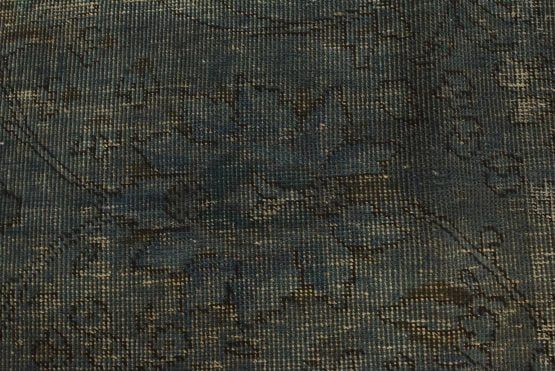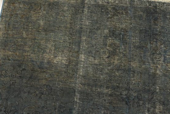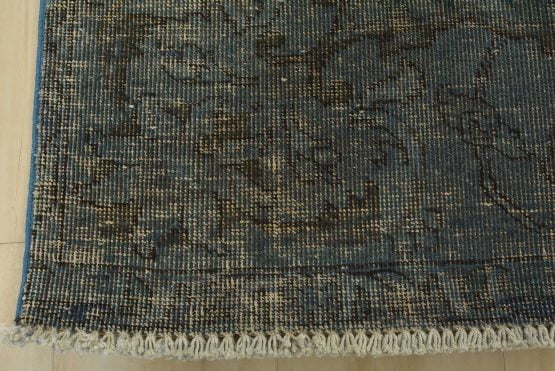 An authentic vintage traditional Overdyed Tabriz rug hand-knotted with an all-wool pile on a cotton foundation. This oriental rug features a muted central medallion surrounded by muted floral designs set against a blue background. It has a low wool pile, is worn and distressed, and has minor imperfections (see photos). However, it is in very good condition.