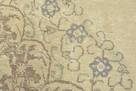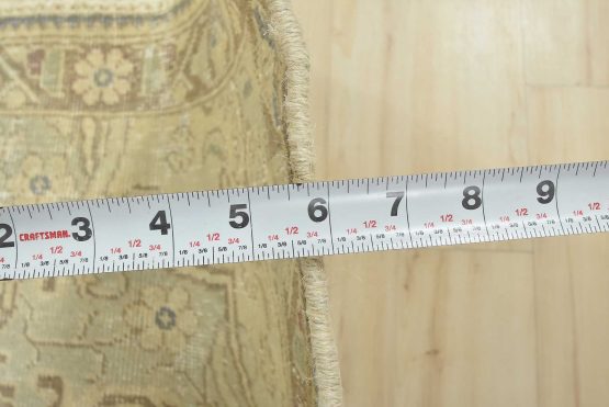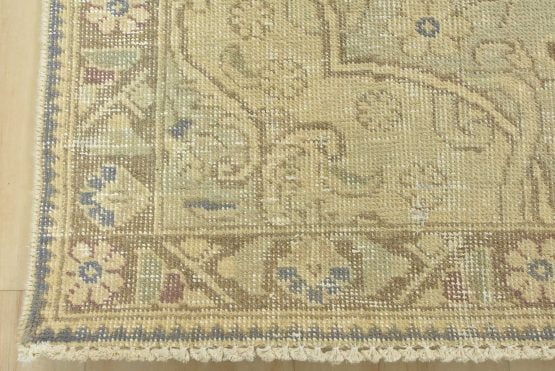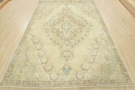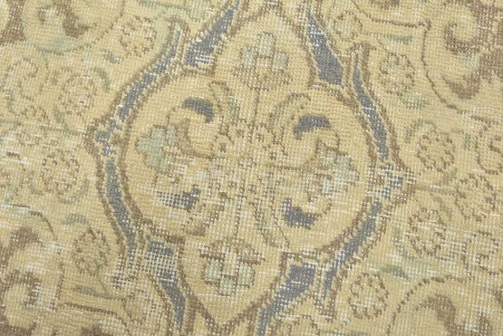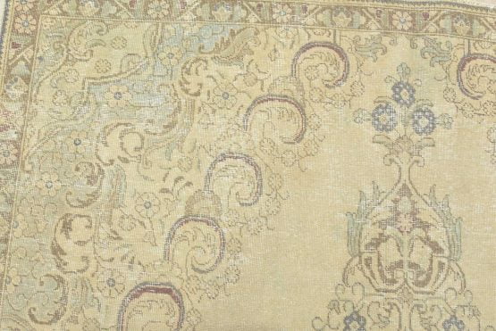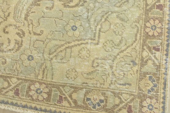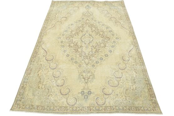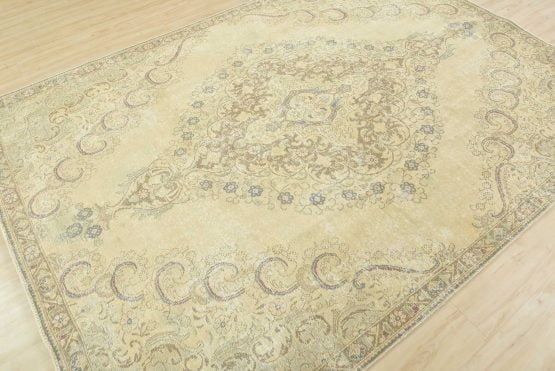 An authentic vintage traditional Tabriz rug hand-knotted with fine wool and natural dyes. This oriental rug features a central curvilinear medallion surrounded by a floral pattern set against a beige background. It has a low wool pile, is worn and distressed, and has minor imperfections (see photos). However, it is in very good condition.