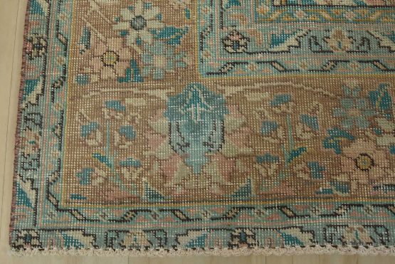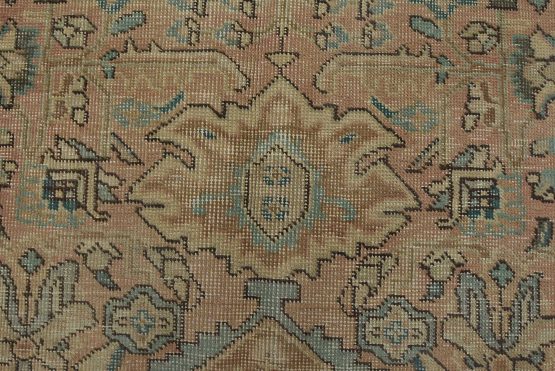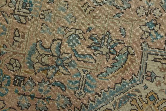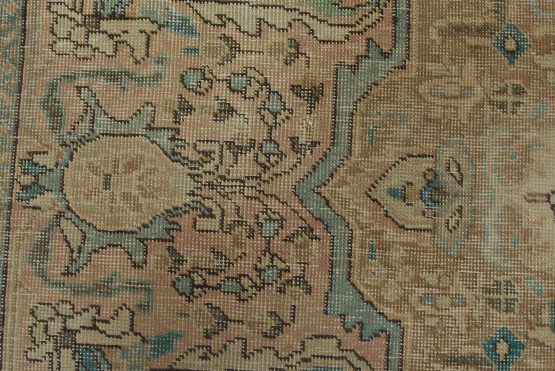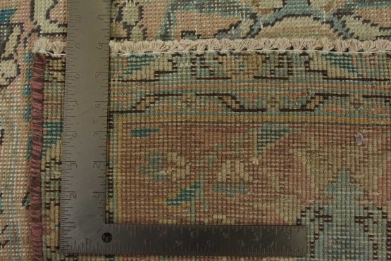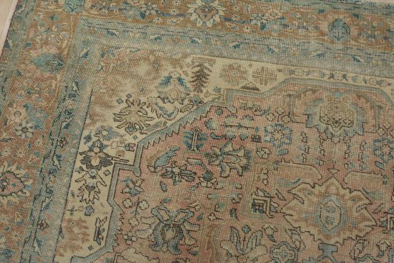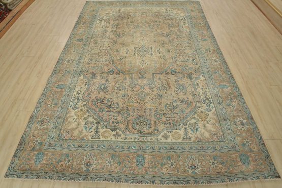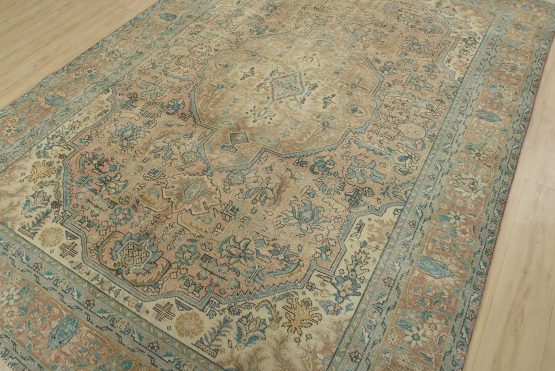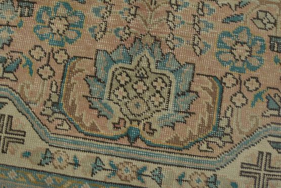 An authentic vintage traditional Tabriz rug hand-knotted with fine wool and natural dyes. This oriental rug features muted colors with a central medallion surrounded by floral designs set against a pink background. It has a low wool pile, is worn and distressed, and has minor imperfections (see photos). However, it is in very good condition.