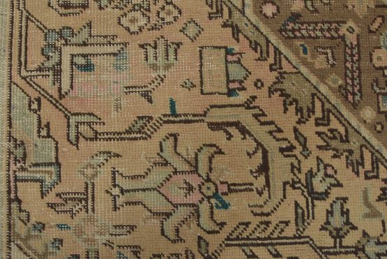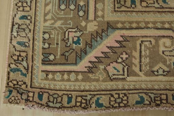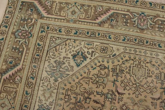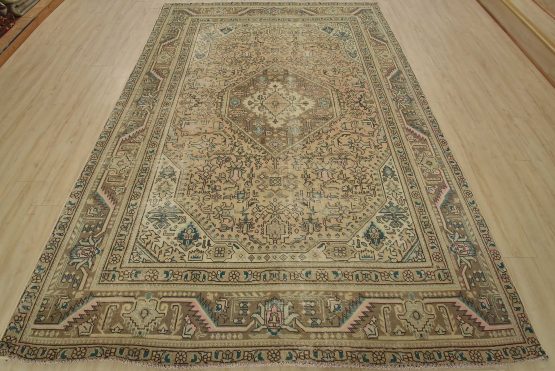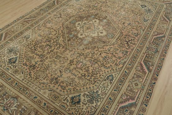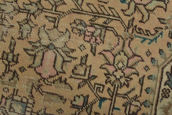 An authentic vintage traditional Tabriz rug hand-knotted with fine wool and natural dyes. This oriental rug features a central geometric medallion surrounded by a floral design set against a pink background. It has a low wool pile, is worn and distressed, and has minor imperfections (see photos). However, it is in very good condition.