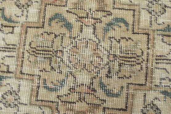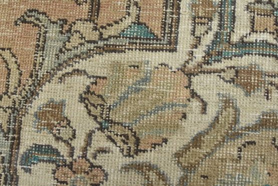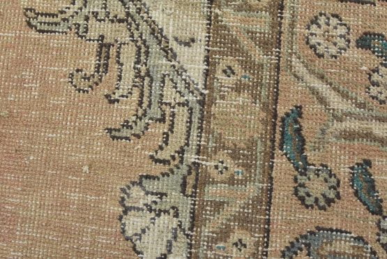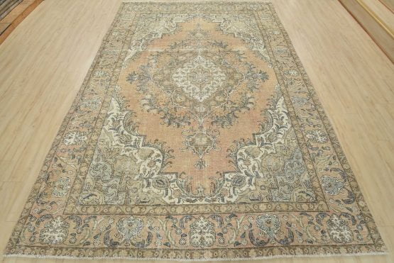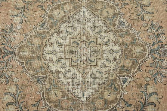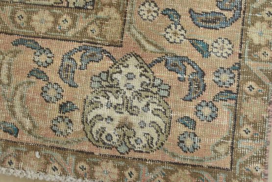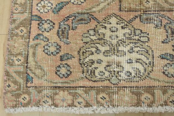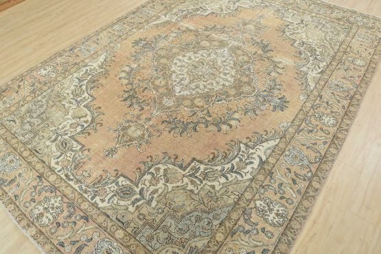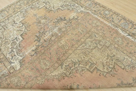 An authentic vintage traditional Tabriz rug hand-knotted with an all-wool pile on a cotton foundation. This oriental rug features a muted central curvilinear medallion set against a pink background. It has a low wool pile, is worn and distressed, and has minor imperfections (see photos). However, it is in very good condition.