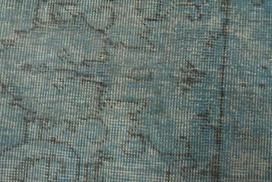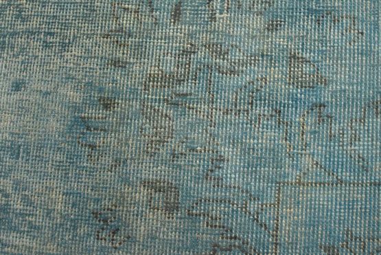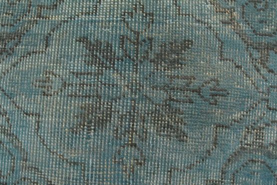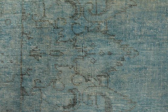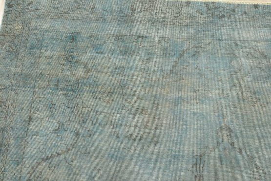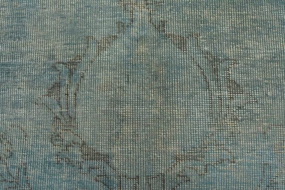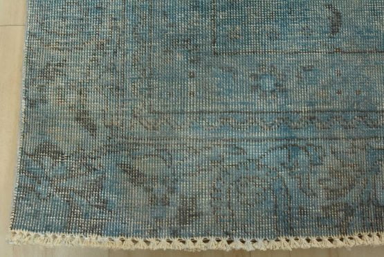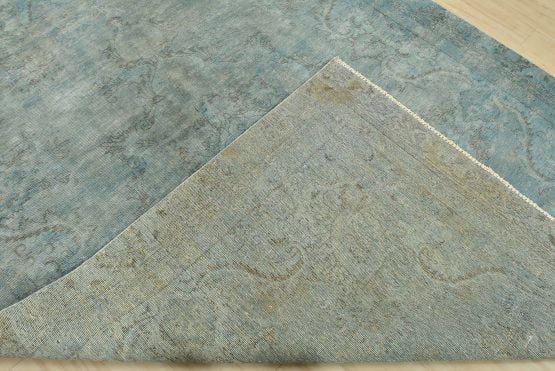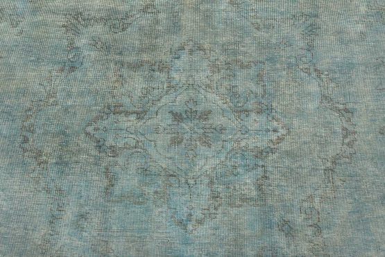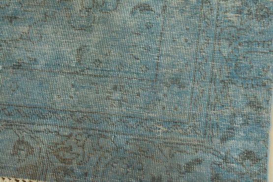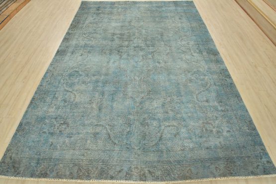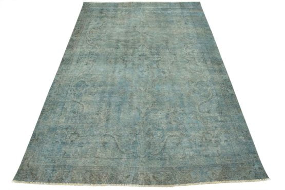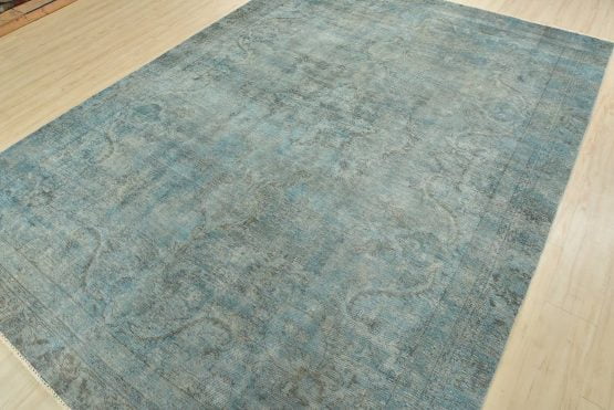 An authentic vintage traditional Overdyed Tabriz rug hand-knotted with an all-wool pile on a cotton foundation. This oriental rug features a muted central medallion surrounded by muted floral motifs set against a blue background. It has a low wool pile, is worn and distressed, and has minor imperfections (see photos). However, it is in very good condition.