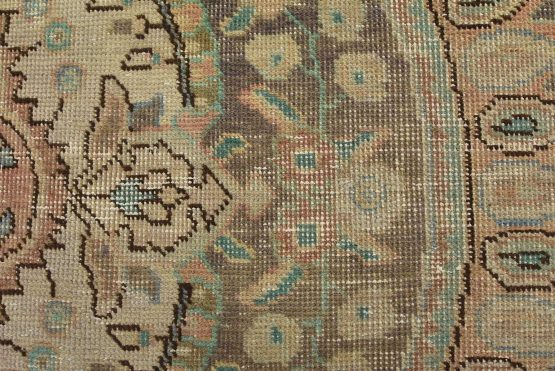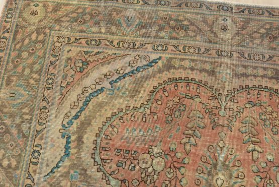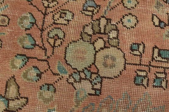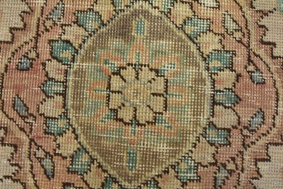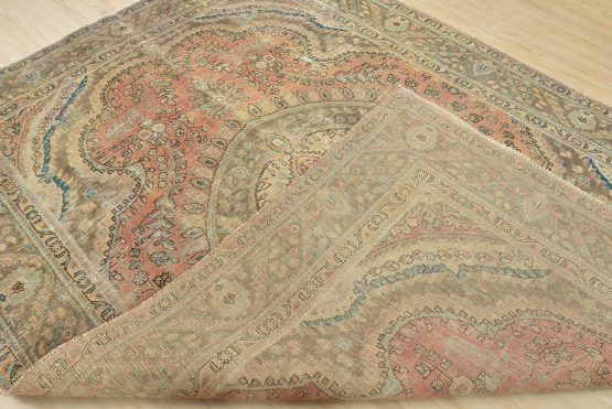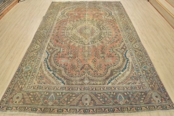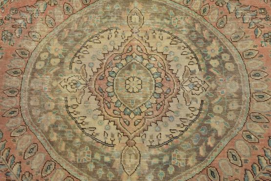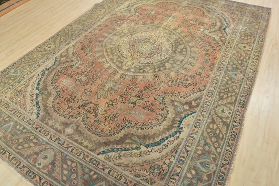 An authentic vintage traditional Tabriz rug hand-knotted with an all-wool pile on a cotton foundation. This oriental rug features a central medallion surrounded by botanical designs with small flowers set against a pink background. It has a low wool pile, is worn and distressed, and has minor imperfections (see photos). However, it is in very good condition.