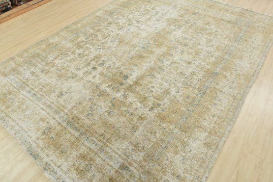 An authentic vintage traditional Tabriz rug hand-knotted with an all-wool pile on a cotton foundation. This oriental rug features a central medallion surrounded by a floral design set against a beige background. It has a low wool pile, is worn and distressed, and has minor imperfections (see photos). However, it is in very good condition.
