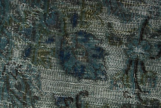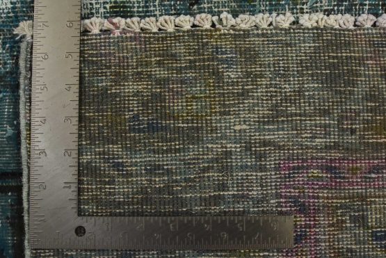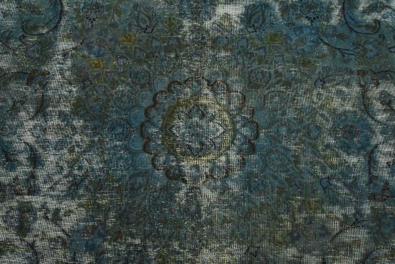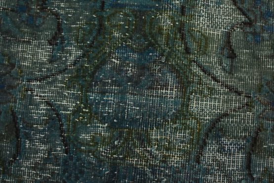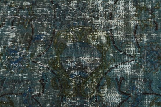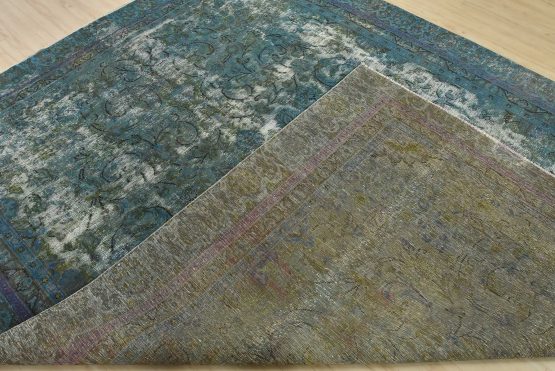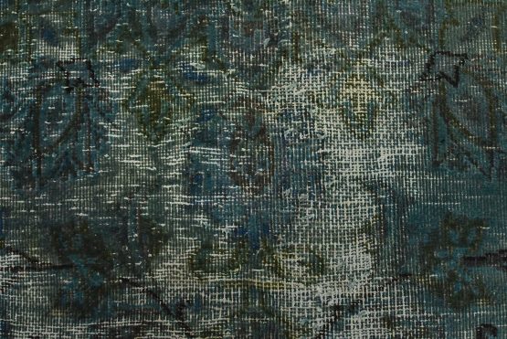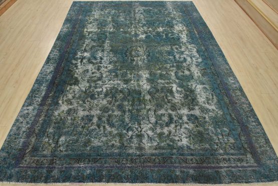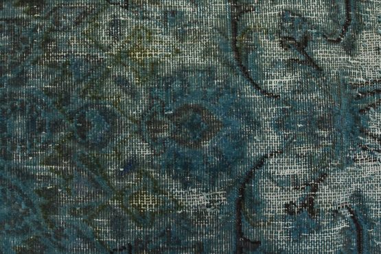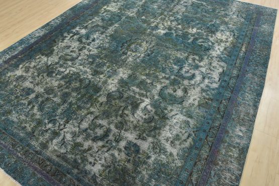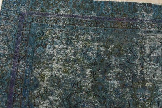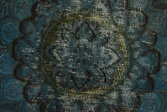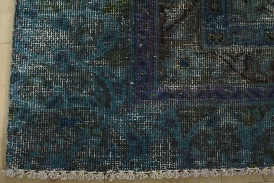 An authentic vintage Overdyed Tabriz rug hand-knotted with an all-wool pile on a cotton foundation. This oriental rug features an all-over floral design set against a blue background. It has a low wool pile, is worn and distressed, with threadbare areas and minor imperfections (see photos). However, it is in very good condition.