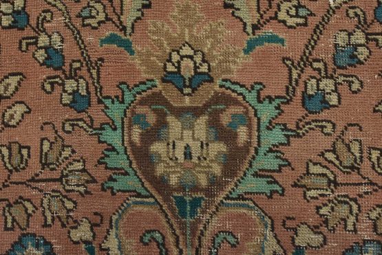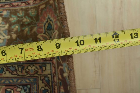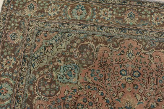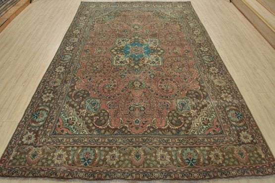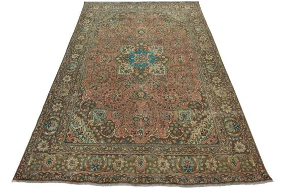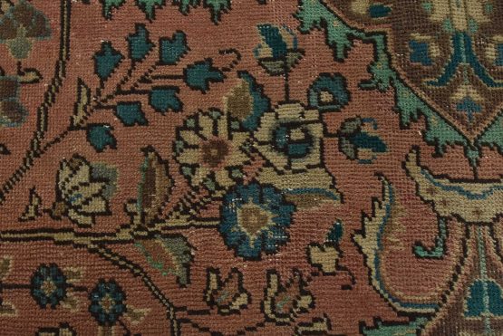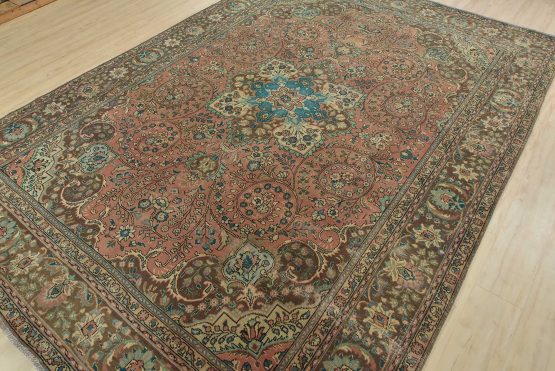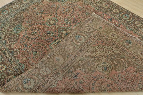 An authentic vintage traditional Tabriz rug hand-knotted with an all-wool pile on a cotton foundation. This oriental rug features a central medallion surrounded by floral designs set against a pink background. It has a low wool pile, is worn and distressed, and has minor imperfections (see photos). However, it is in very good condition.