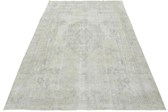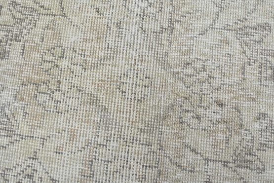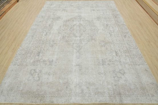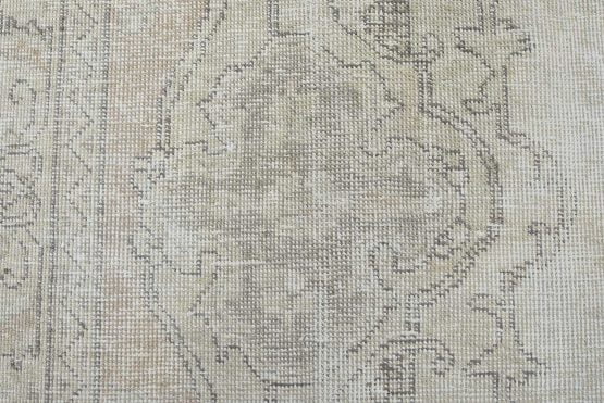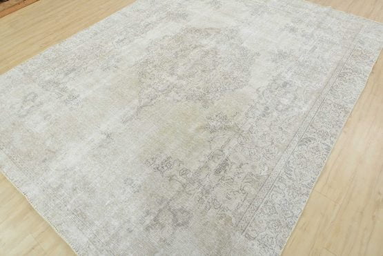 An authentic vintage traditional Tabriz rug hand-knotted with an all-wool pile on a cotton foundation. This oriental rug features a muted central curvilinear medallion surrounded by muted floral motifs set against a beige background. It has a low wool pile, is worn and distressed, and has minor imperfections (see photos). However, it is in very good condition.