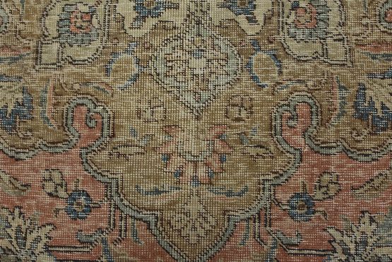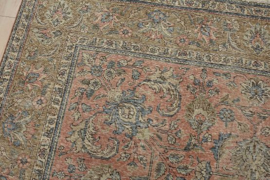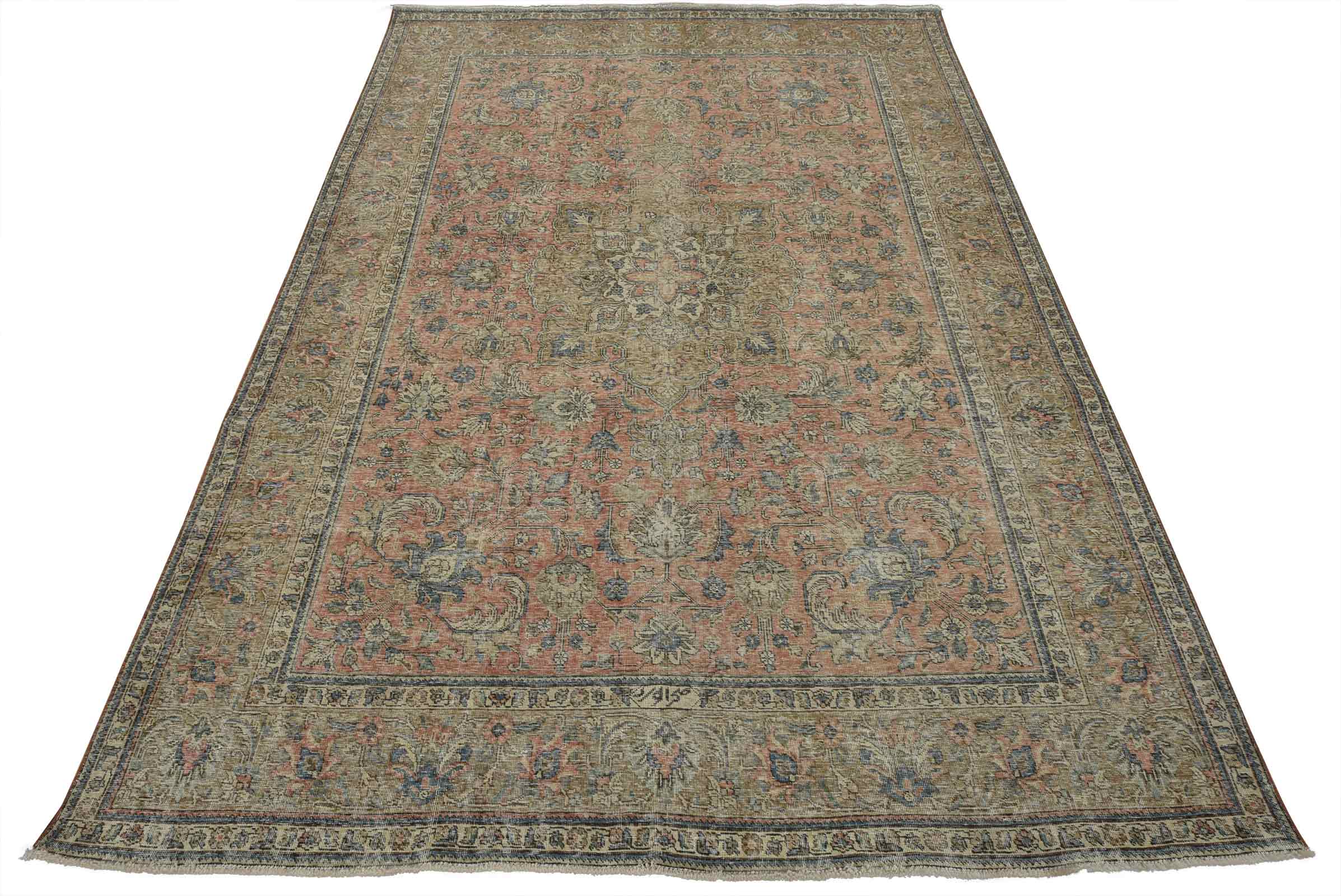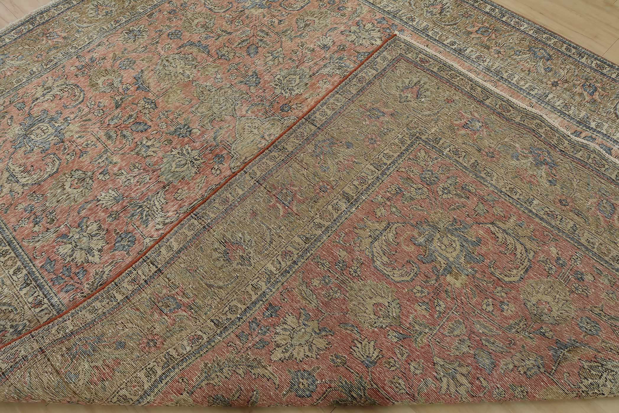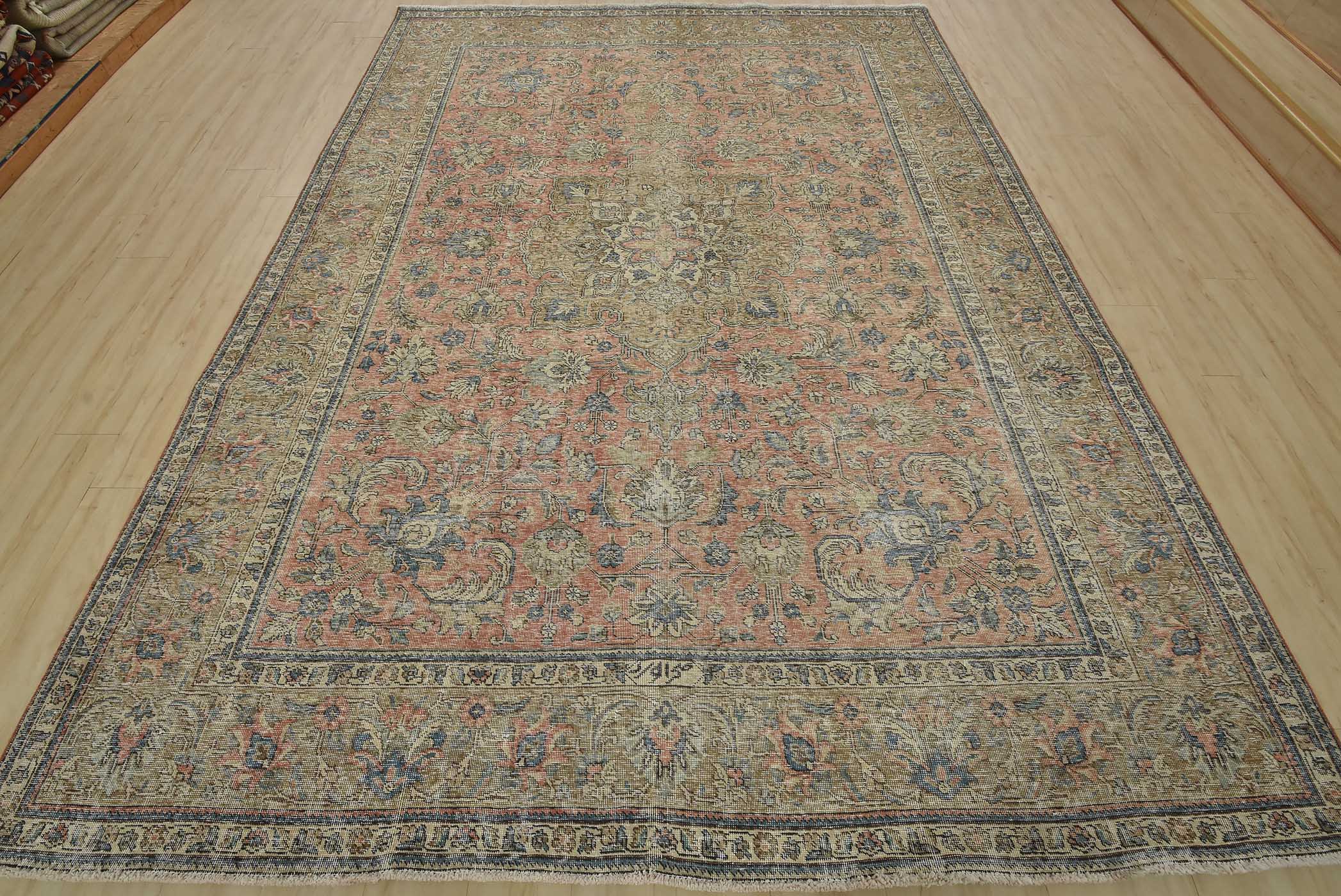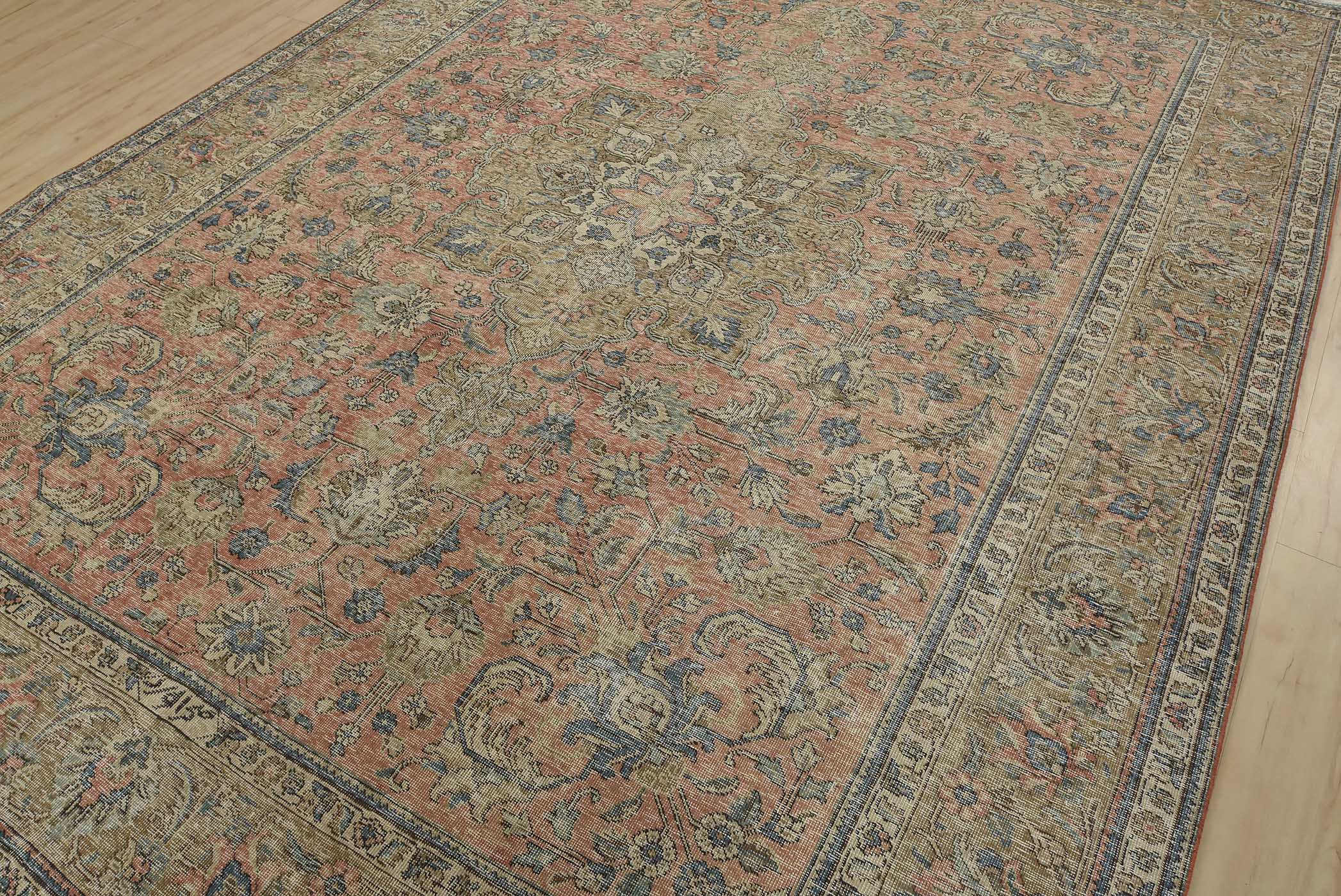 An authentic vintage traditional Tabriz rug hand-knotted with fine wool and natural dyes. This oriental rug features a central medallion surrounded by a floral design set against a pink background. It has a low wool pile, is worn and distressed, and has minor imperfections (see photos). However, it is in very good condition.