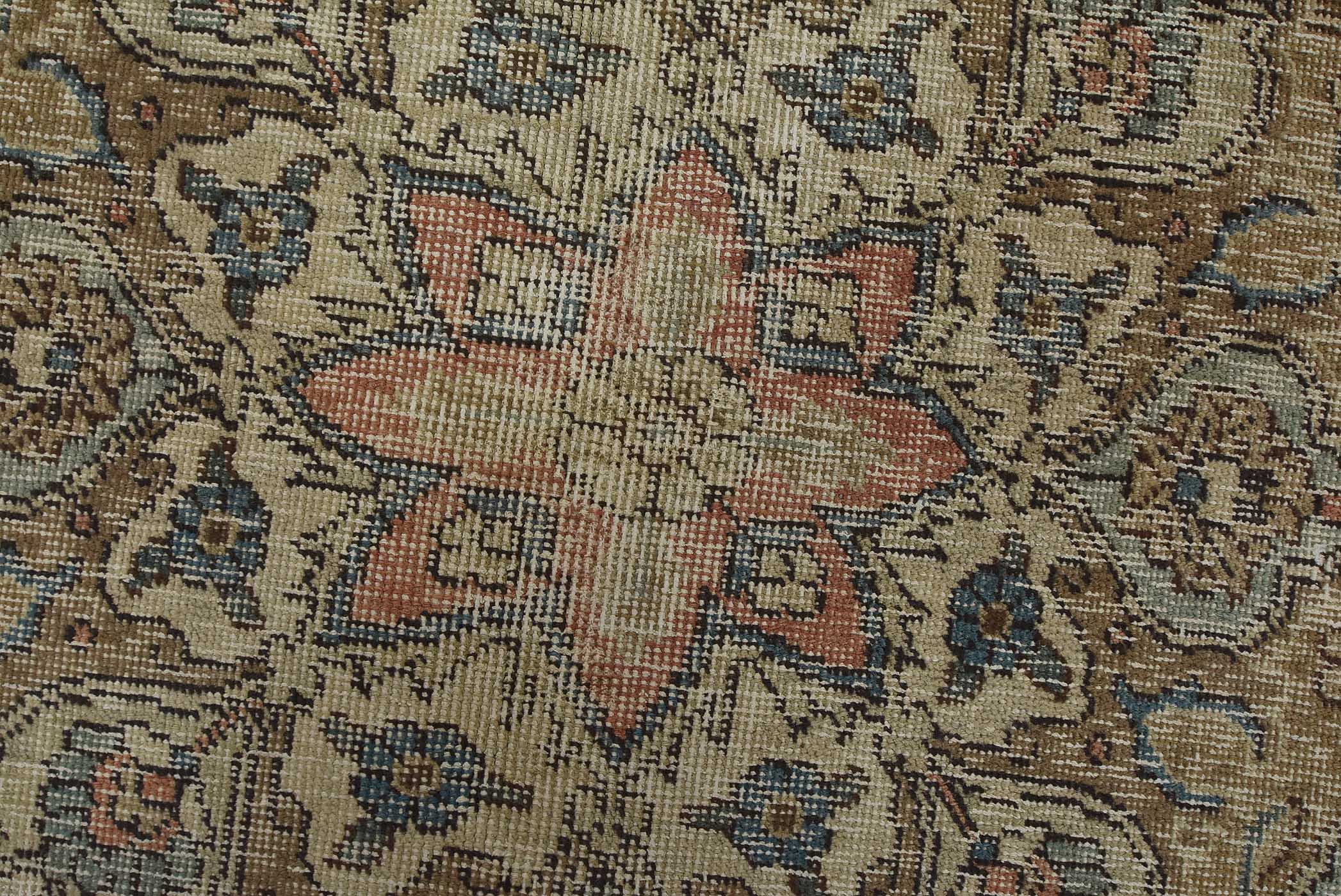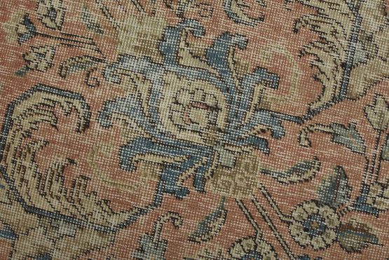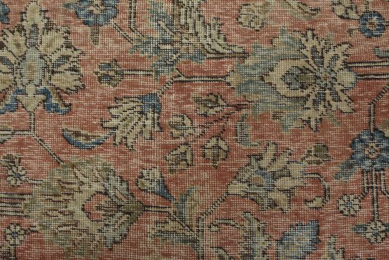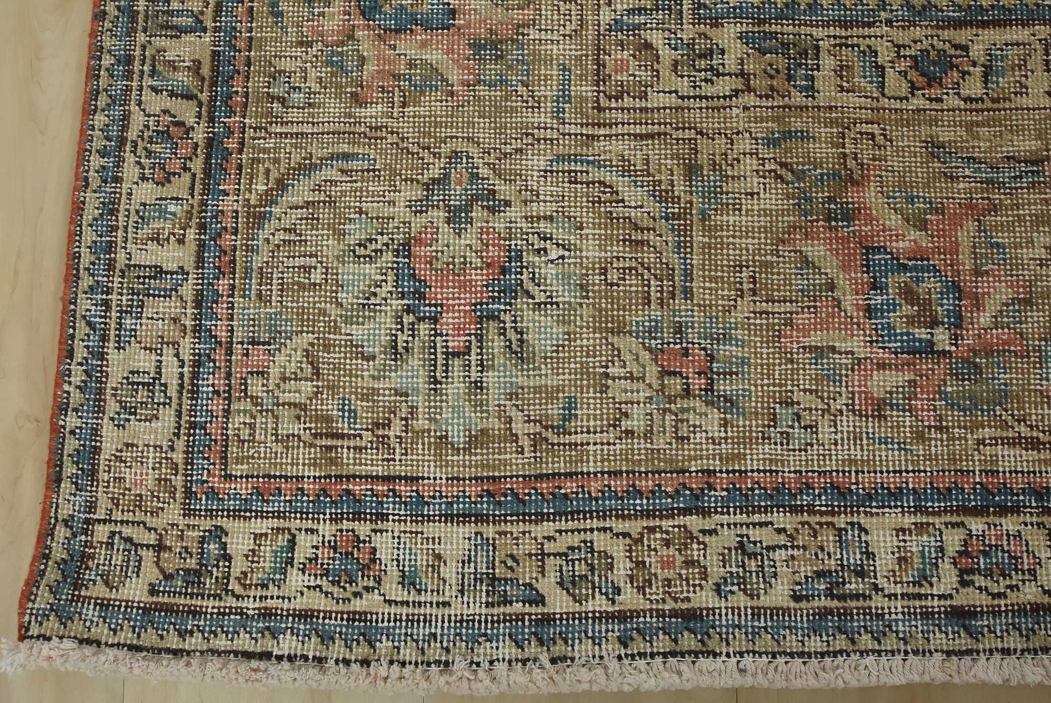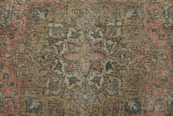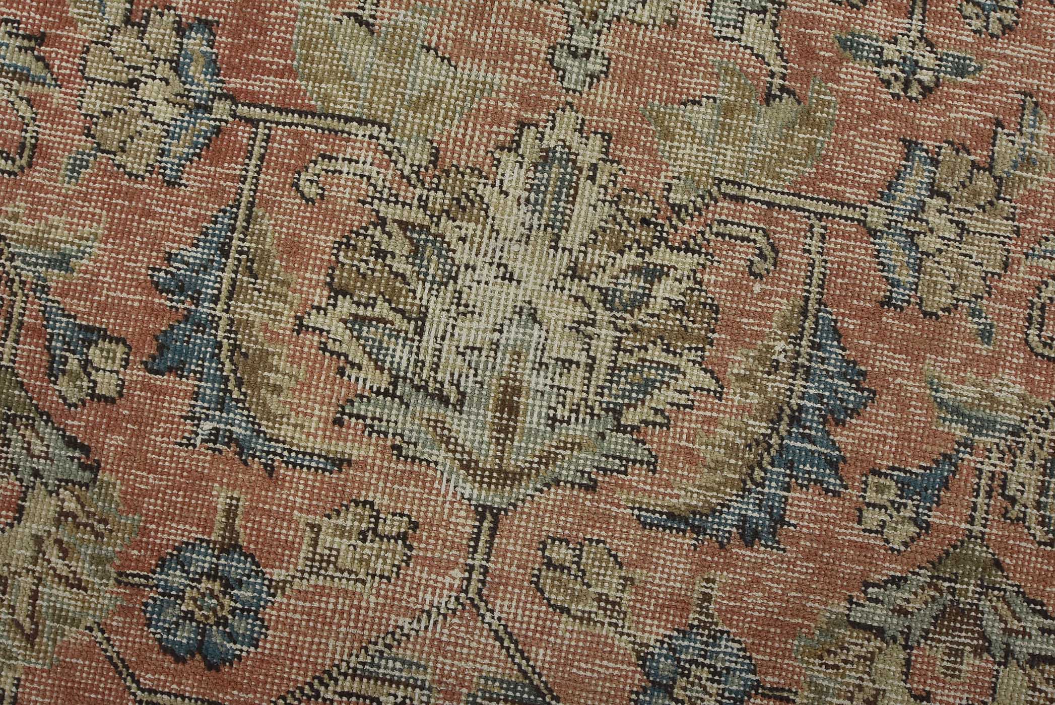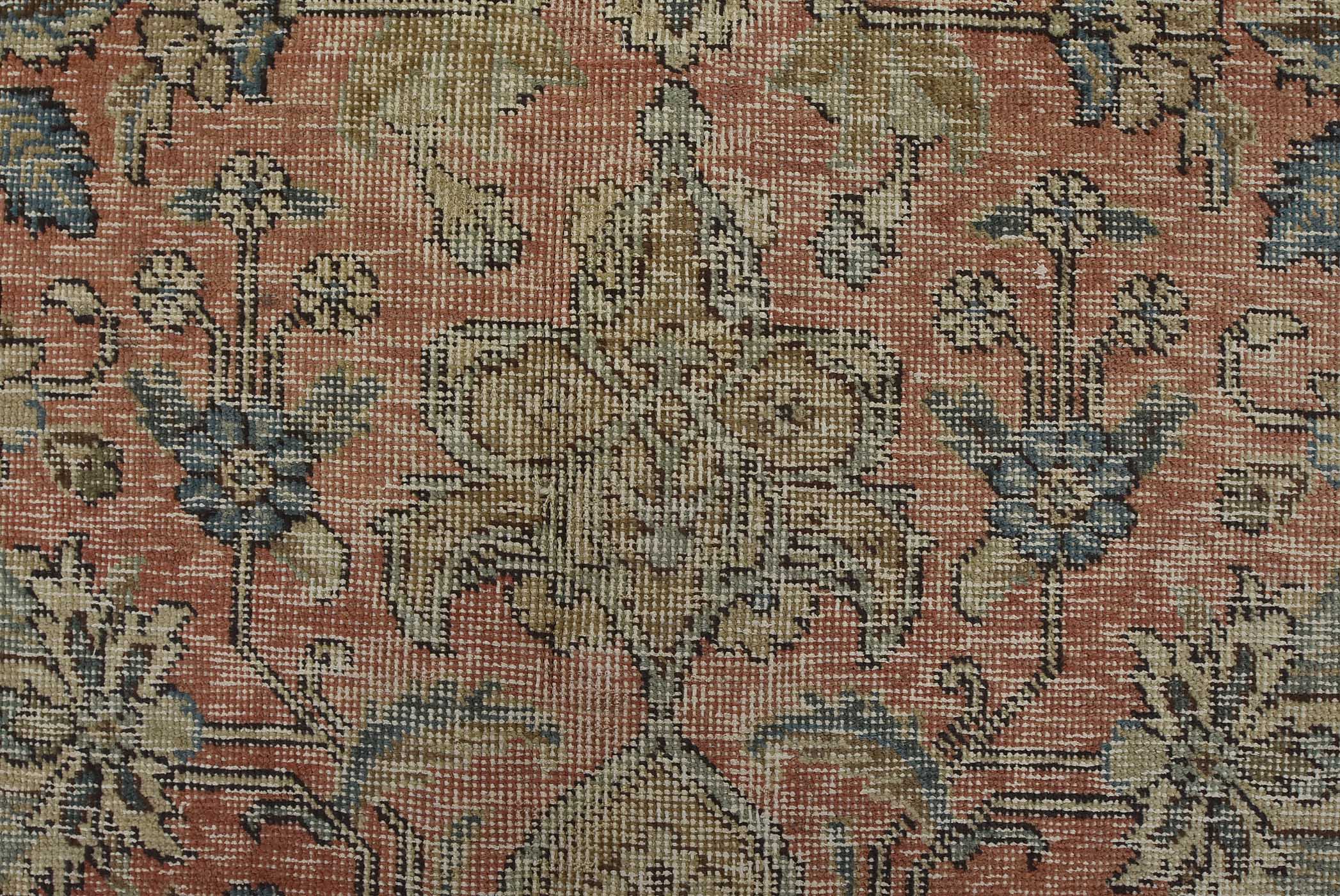 An authentic vintage traditional Tabriz rug hand-knotted with fine wool and natural dyes. This oriental rug features a central medallion surrounded by a floral design set against a pink background. It has a low wool pile, is worn and distressed, and has minor imperfections (see photos). However, it is in very good condition.
