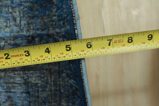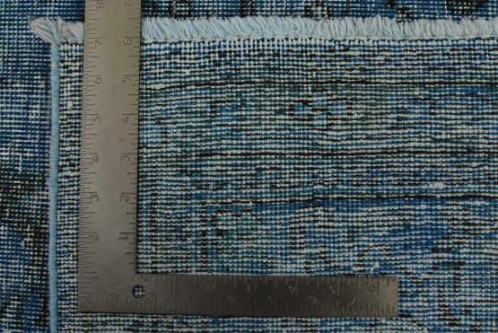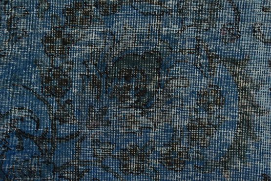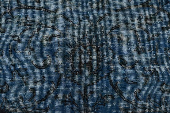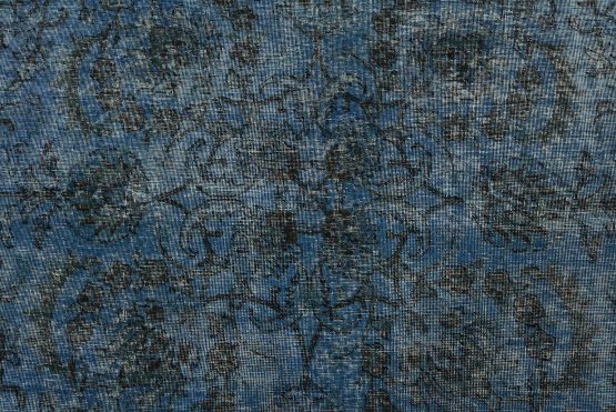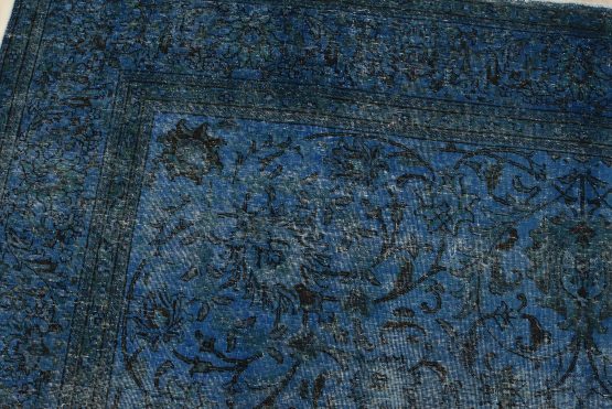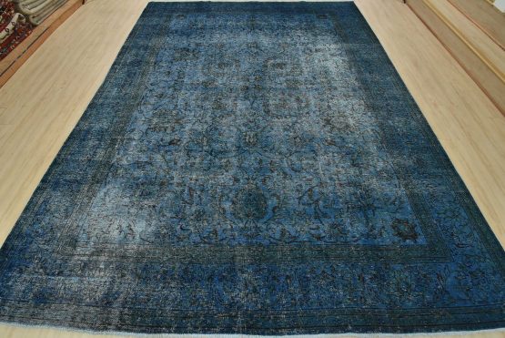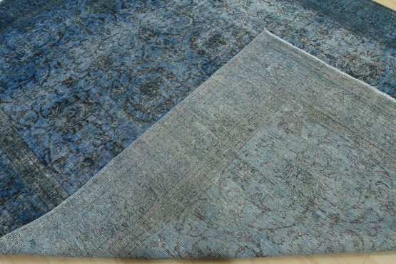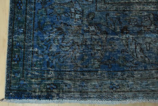 An authentic vintage traditional Overdyed Tabriz rug hand-knotted with an all-wool pile on a cotton foundation. This oriental rug features an all-over muted floral pattern set against a blue background. It has a low wool pile, is worn and distressed, and has minor imperfections (see photos). However, it is in very good condition.