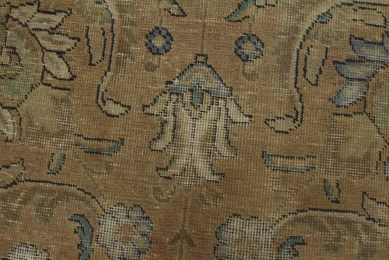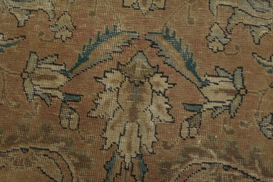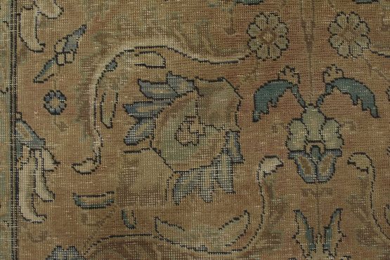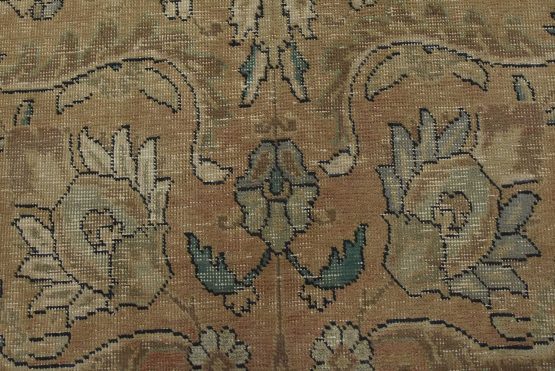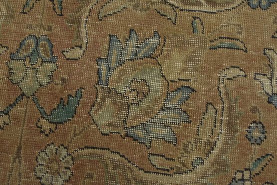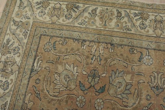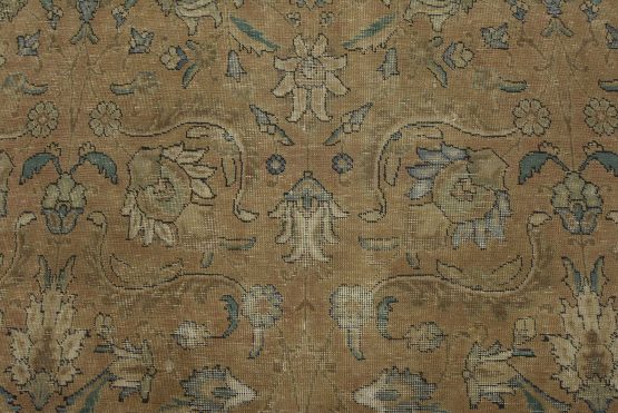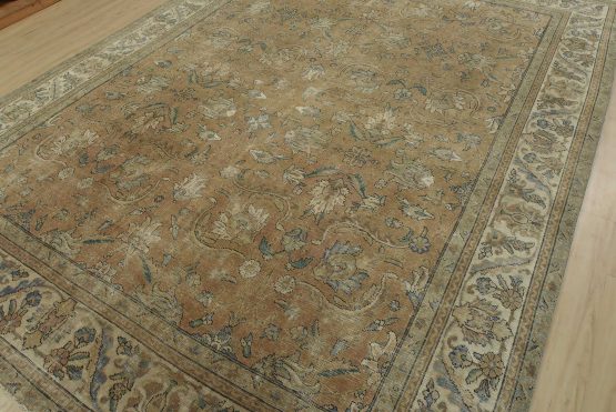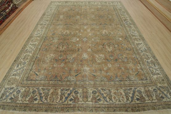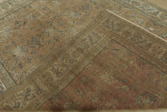 An authentic vintage traditional Tabriz rug hand-knotted with an all-wool pile on a cotton foundation. This oriental rug features a muted all-over floral design set against a pink background. It has a low wool pile, is worn and distressed, and has minor imperfections (see photos). However, it is in very good condition.