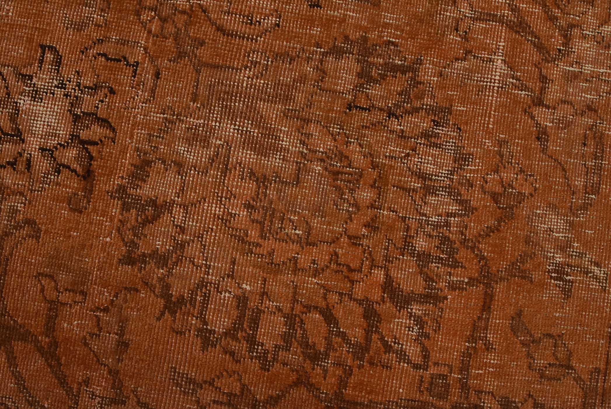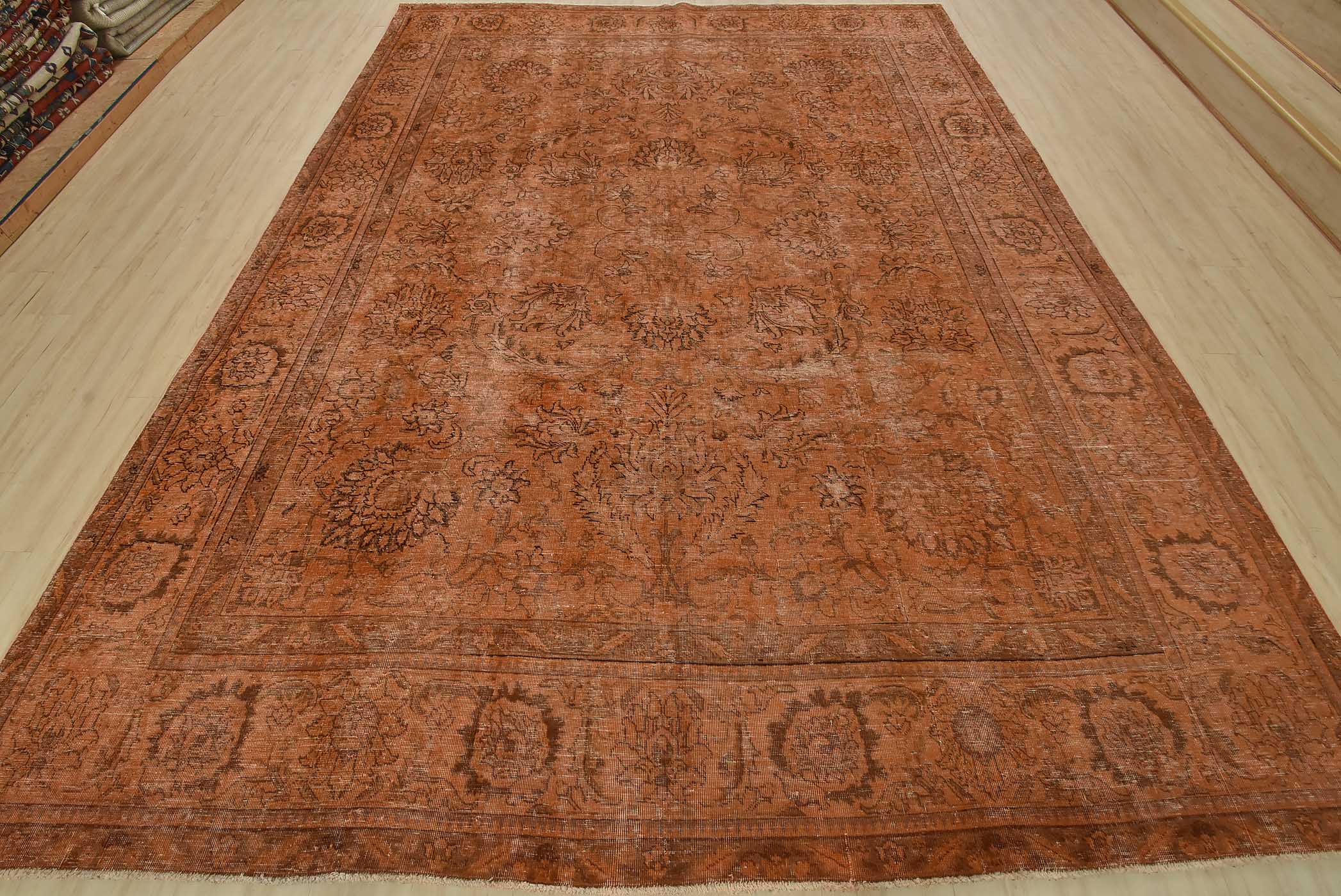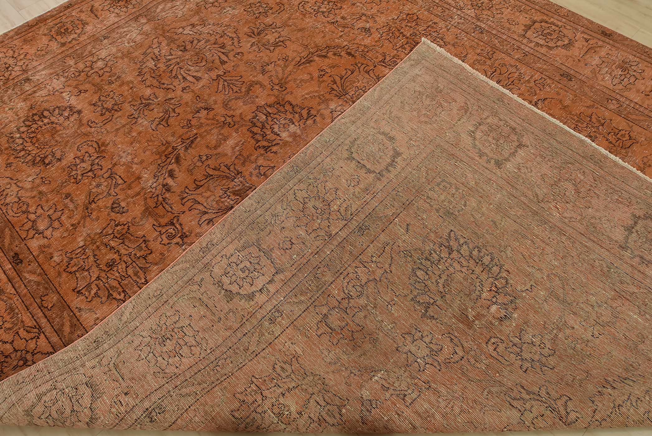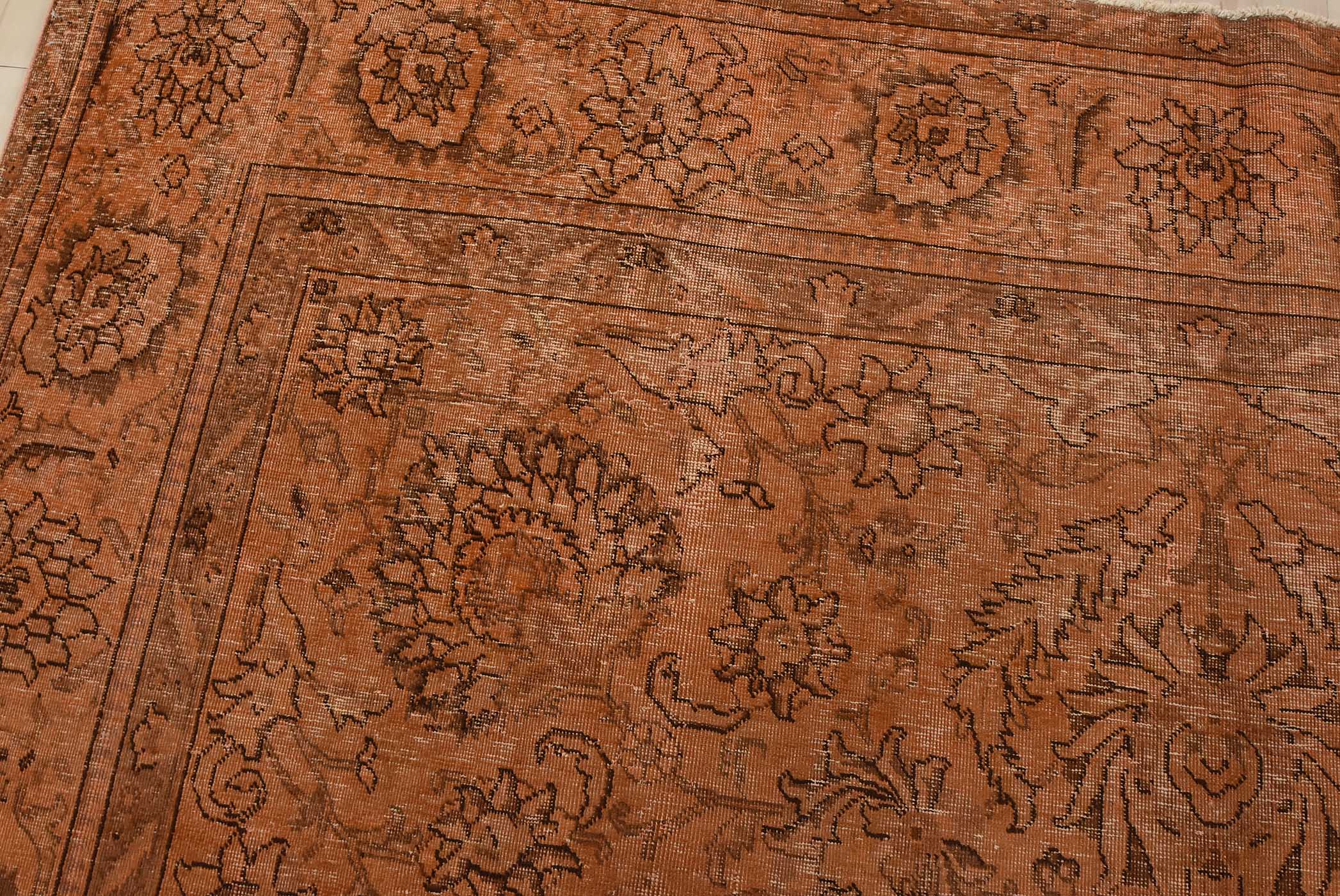 An authentic vintage traditional Overdyed Tabriz rug hand-knotted with an all-wool pile on a cotton foundation. This oriental rug features a muted floral design set against an orange background. It has a low wool pile, is worn and distressed, and has minor imperfections (see photos). However, it is in very good condition.