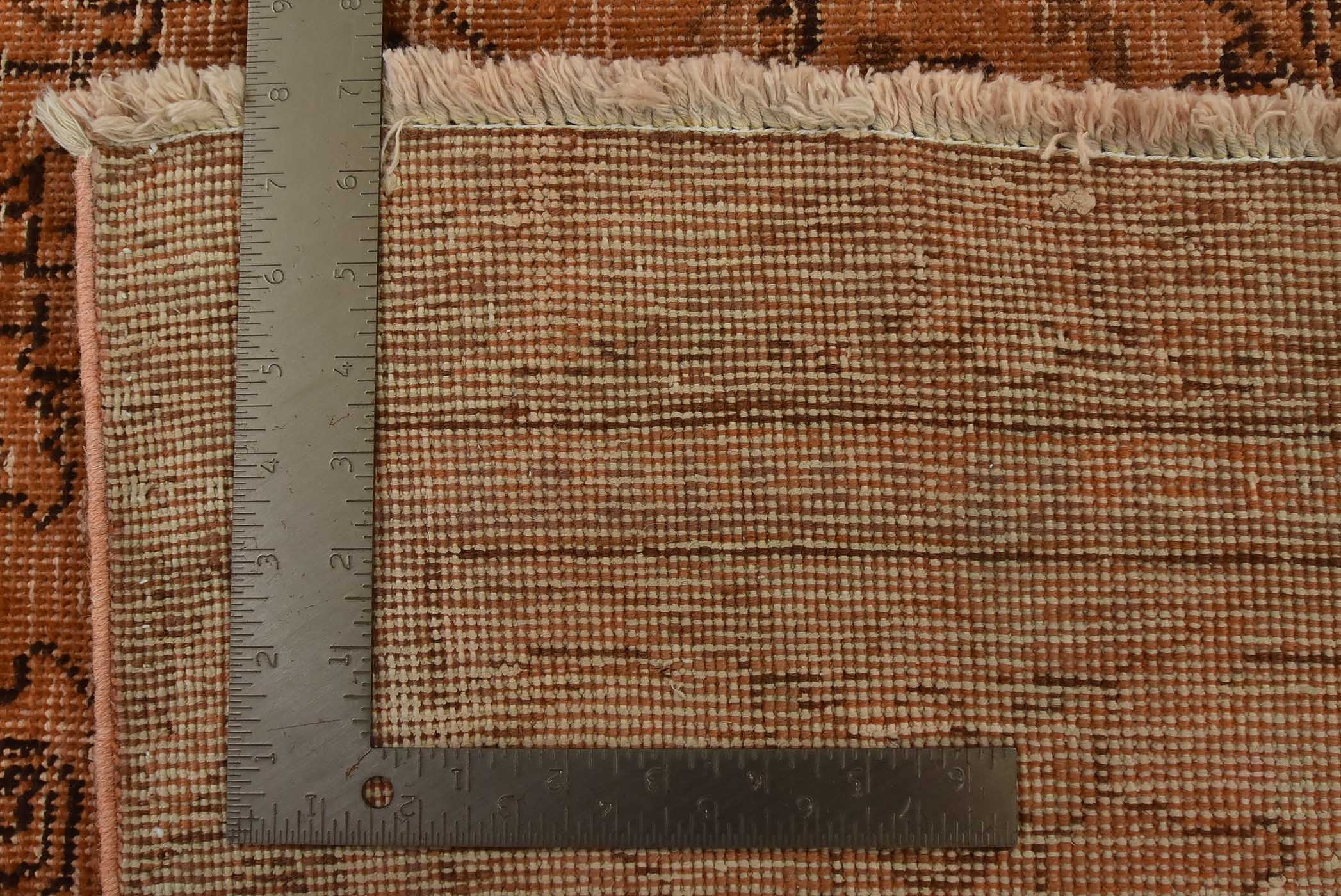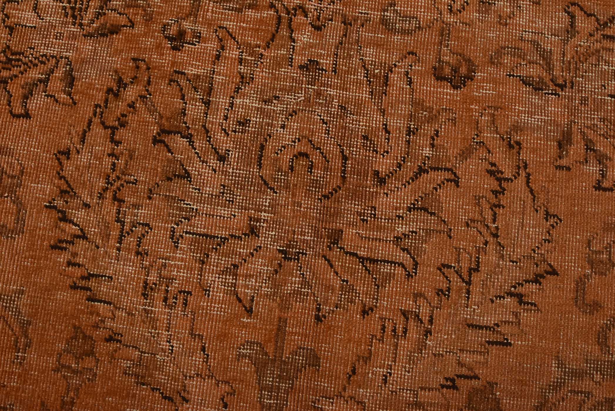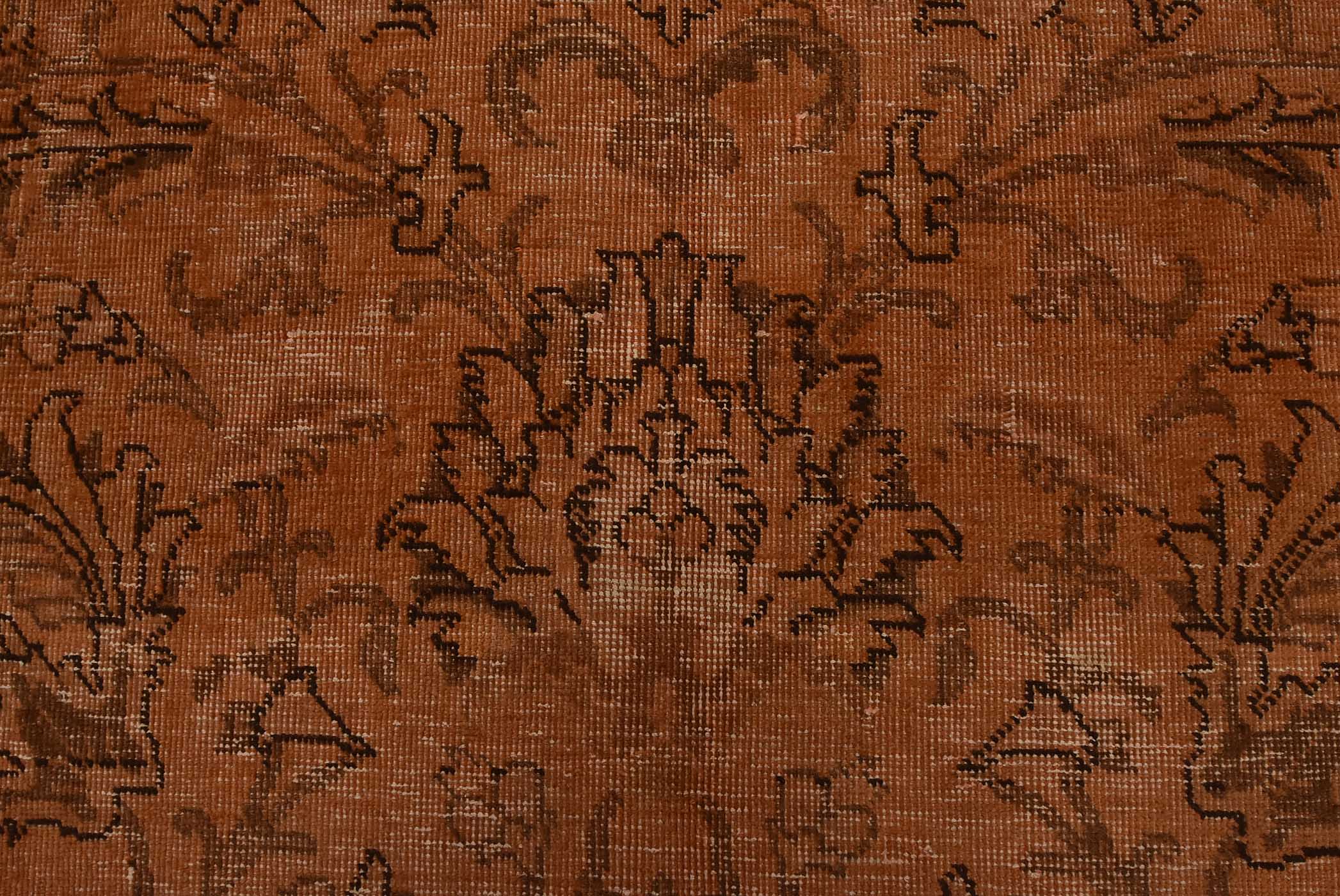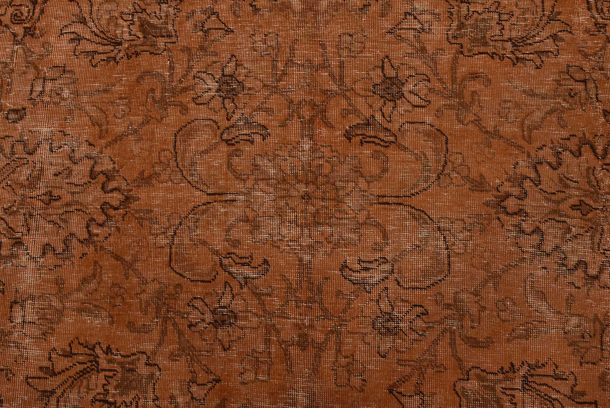 An authentic vintage traditional Overdyed Tabriz rug hand-knotted with an all-wool pile on a cotton foundation. This oriental rug features a muted floral design set against an orange background. It has a low wool pile, is worn and distressed, and has minor imperfections (see photos). However, it is in very good condition.